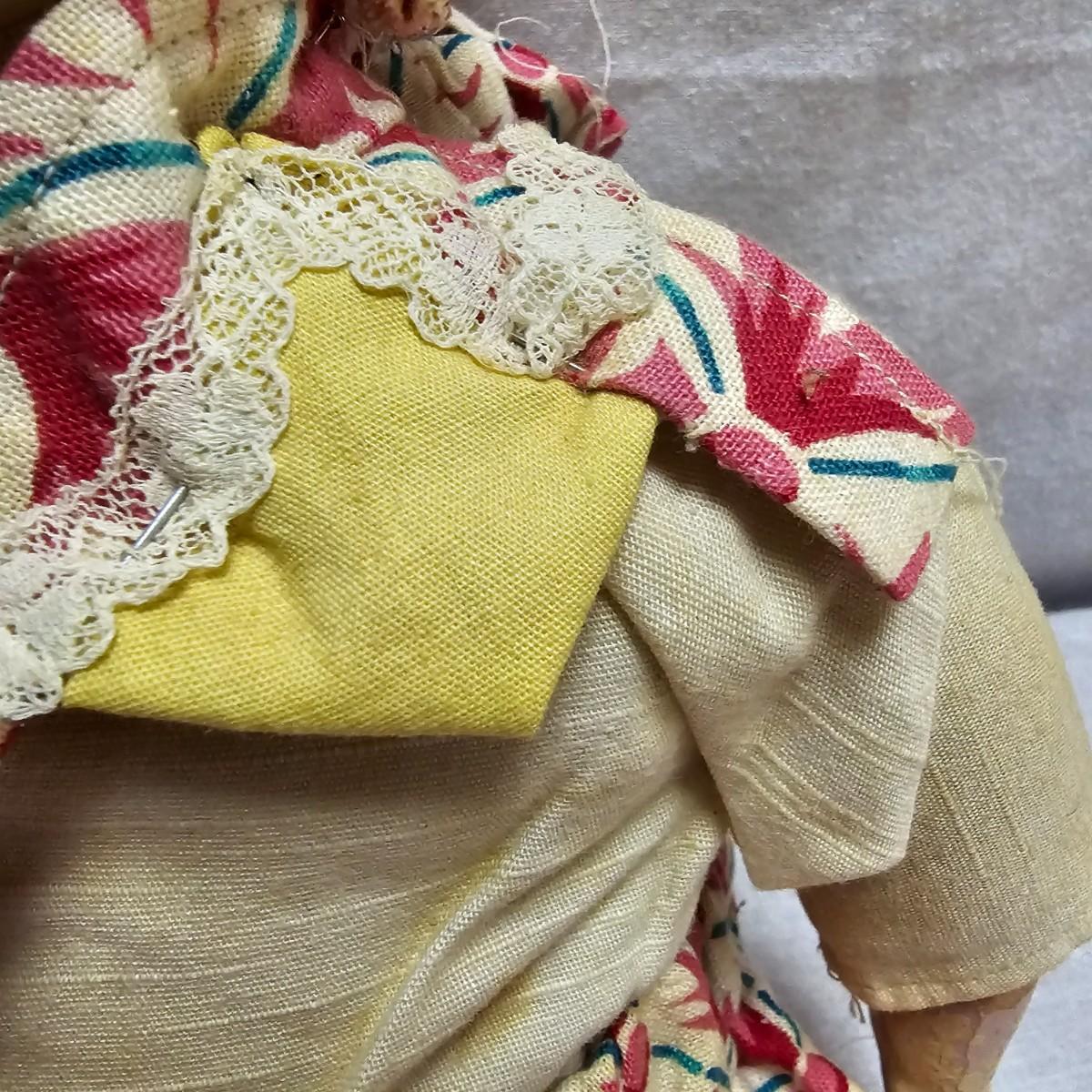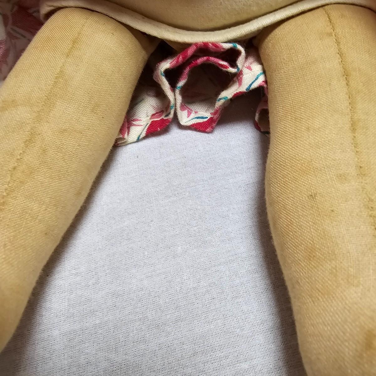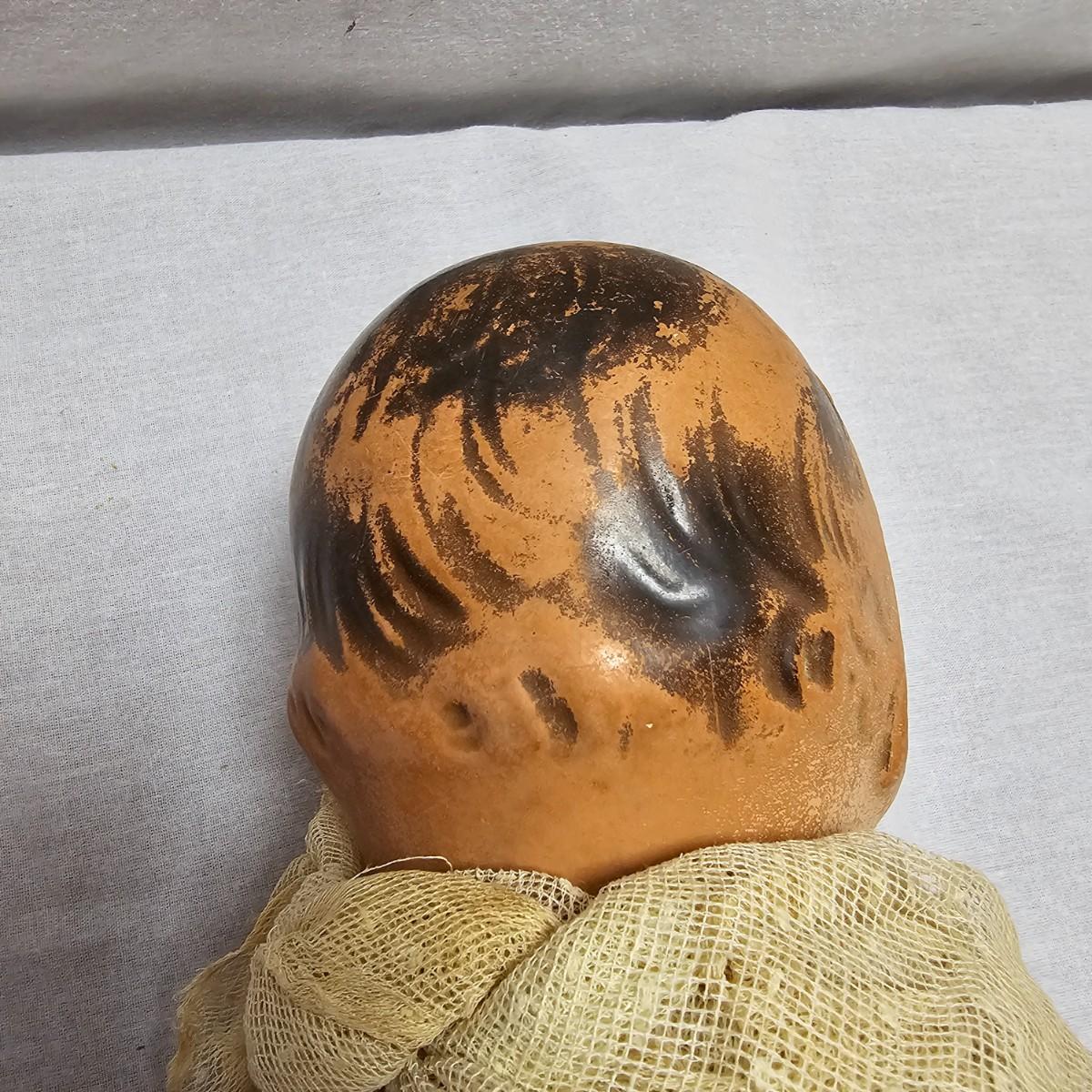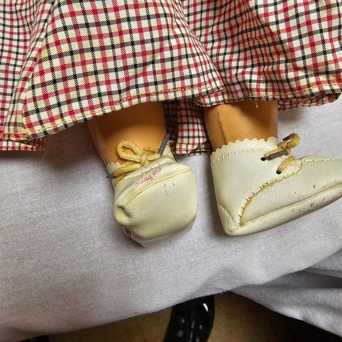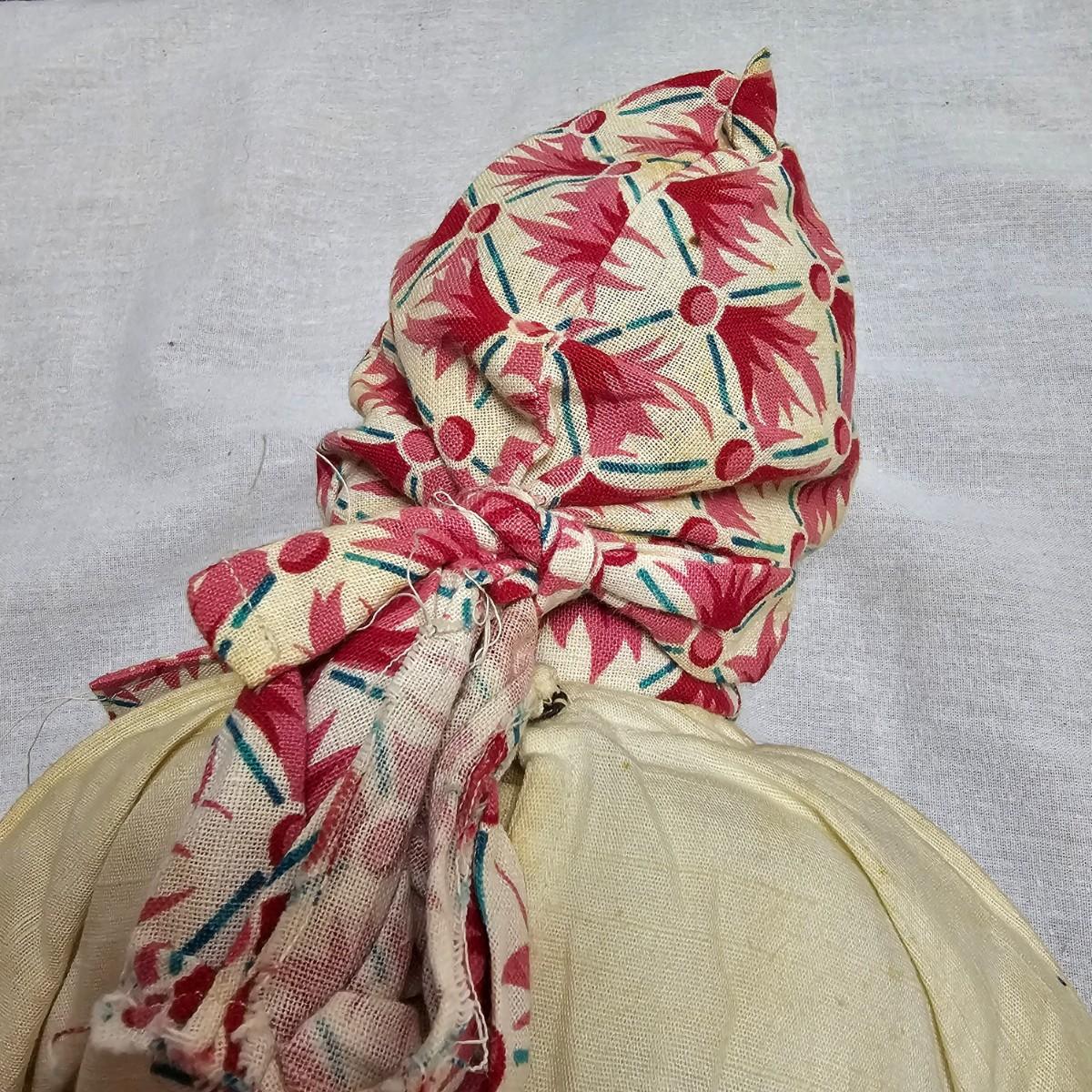 A pair of very well loved vintage baby dolls. Doll with red floral skirt and headpiece has porcelain head and hands. She measures 8" x 3" x 15"H. Eyes open and close. Legs, upper arms and body appear to be stuffed linen fabric. Face and hands have numerous chips and cracks. Manufacturer mark on back of neck but unrecognizable. The other doll is 9" x 4.5" x 18"H, has molded plastic heads, arms and lower legs. Eyes open and close, and she makes a cry when picked up. Clothing and scarf have some stains, and paint on head and hands is scratched. See photos for details. Shipping available.