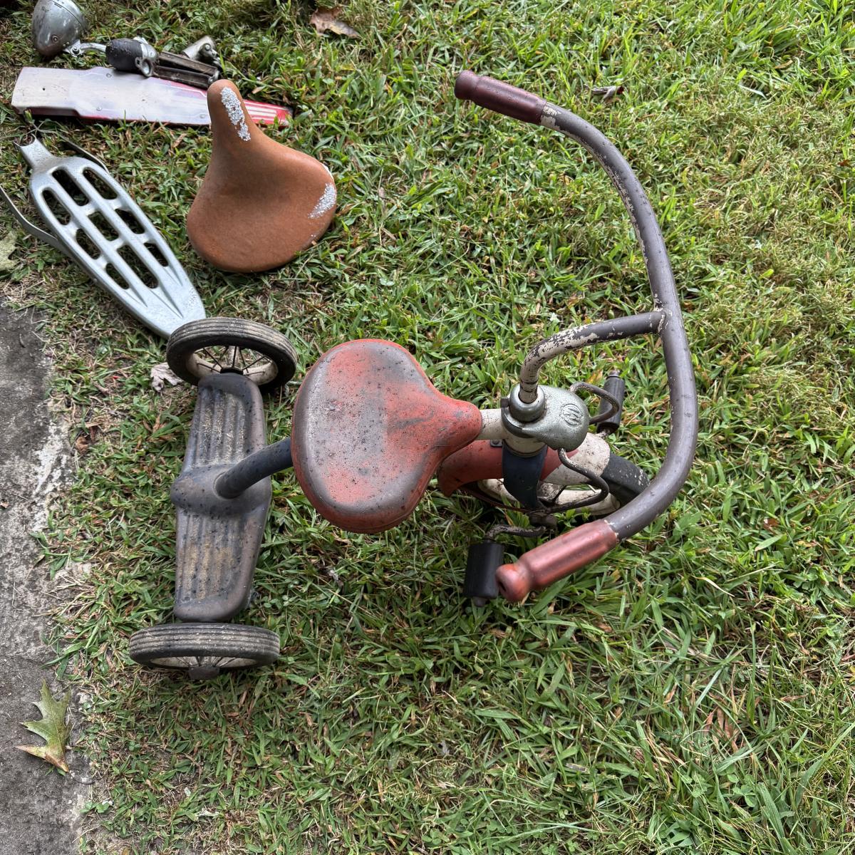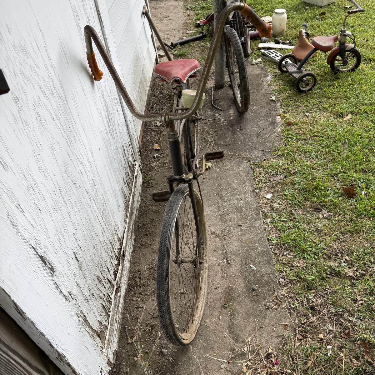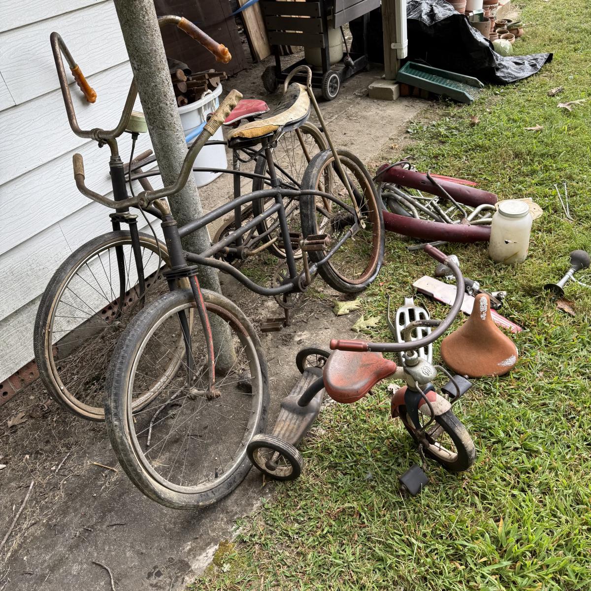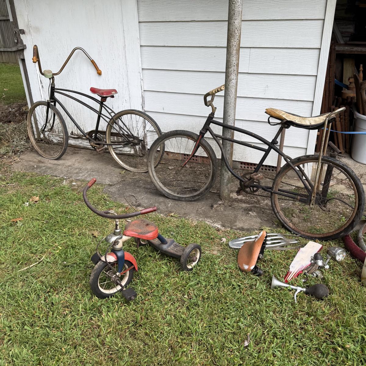 This lot contains two vintage bikes, a vintage tricycle and some vintage bike parts. Check out the unique handlebar covers on the Western Flyer! The smaller of the two bikes measures 66” x 26” x 40”H with a seat height of 31”H. See picture for full inventory. Items in the background are not included. Local pickup only.