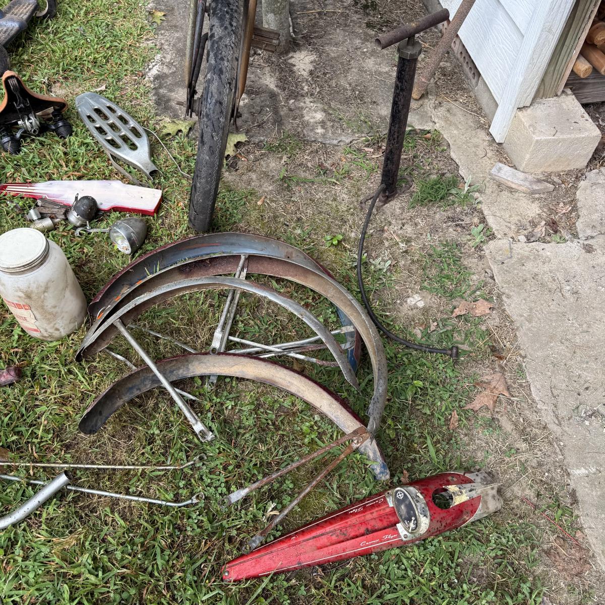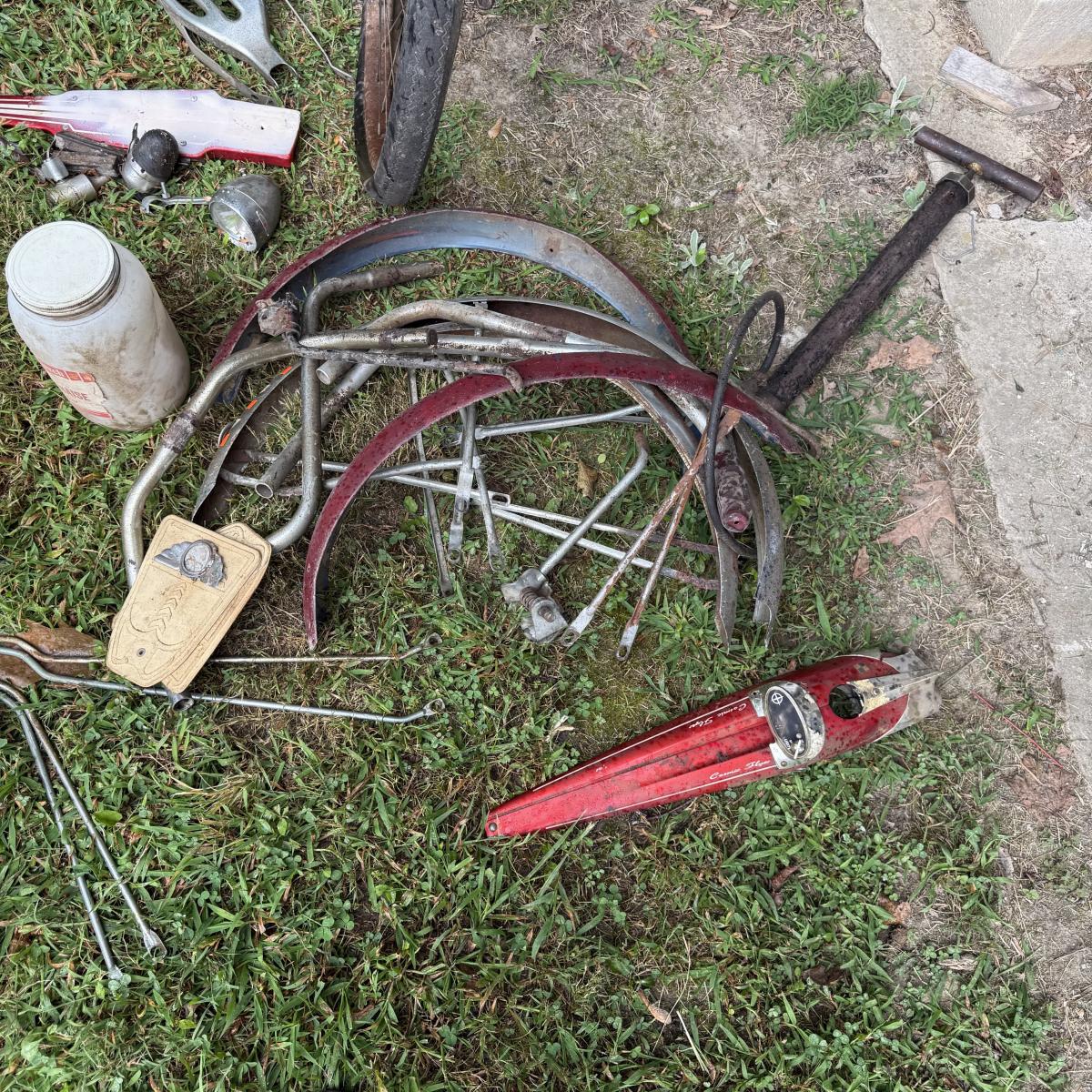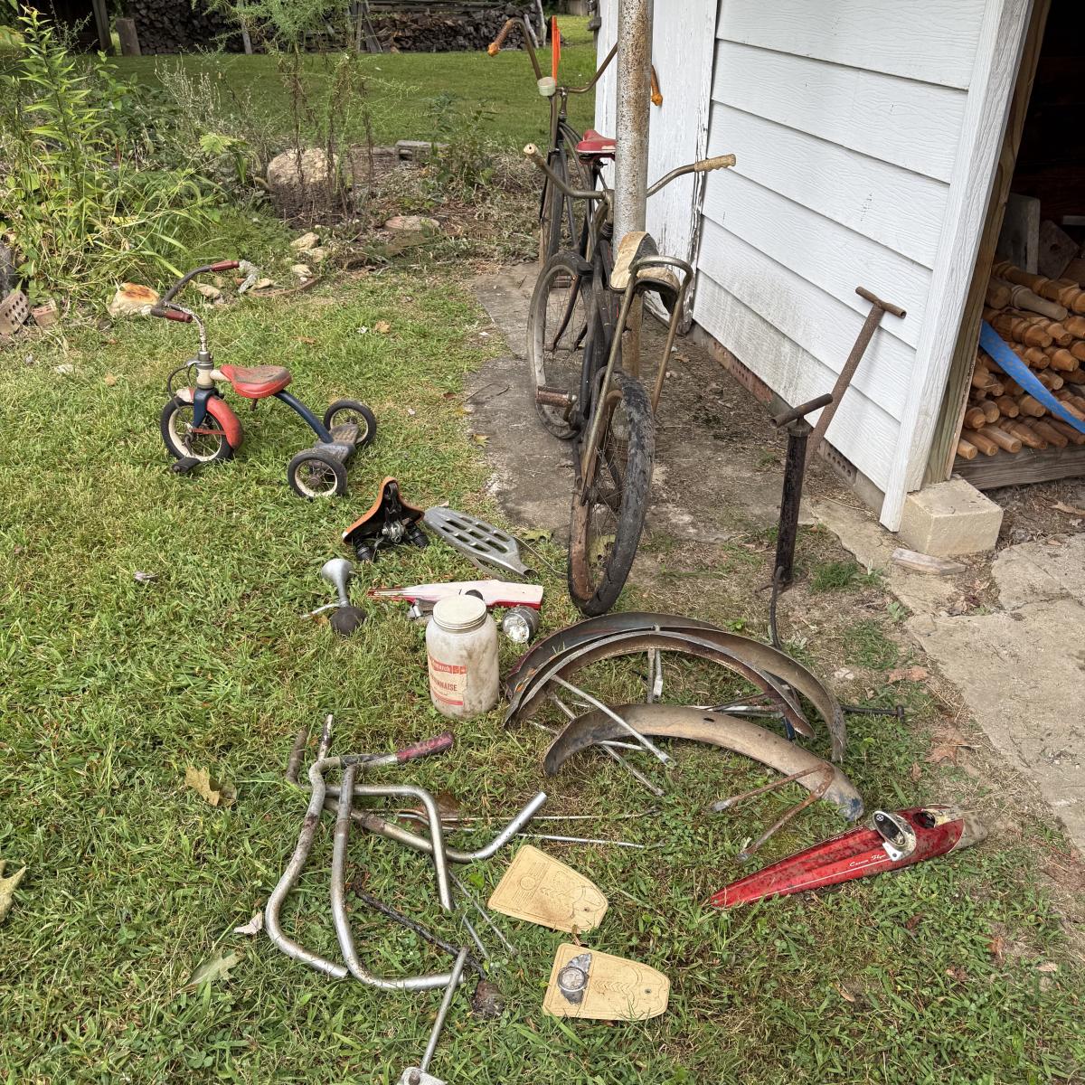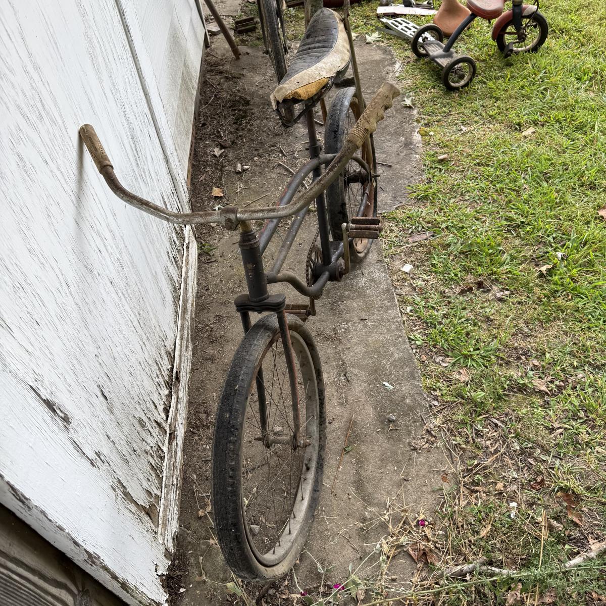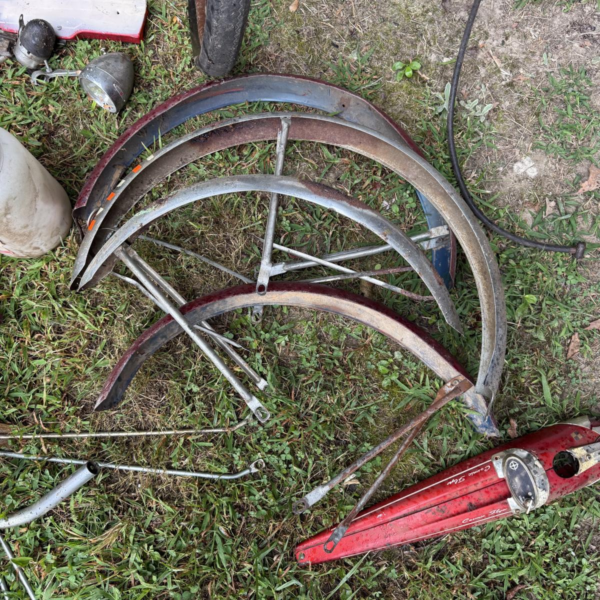 This lot contains two vintage bikes, a vintage tricycle and some vintage bike parts. Check out the unique handlebar covers on the Western Flyer! The smaller of the two bikes measures 66” x 26” x 40”H with a seat height of 31”H. See picture for full inventory. Items in the background are not included. Local pickup only.