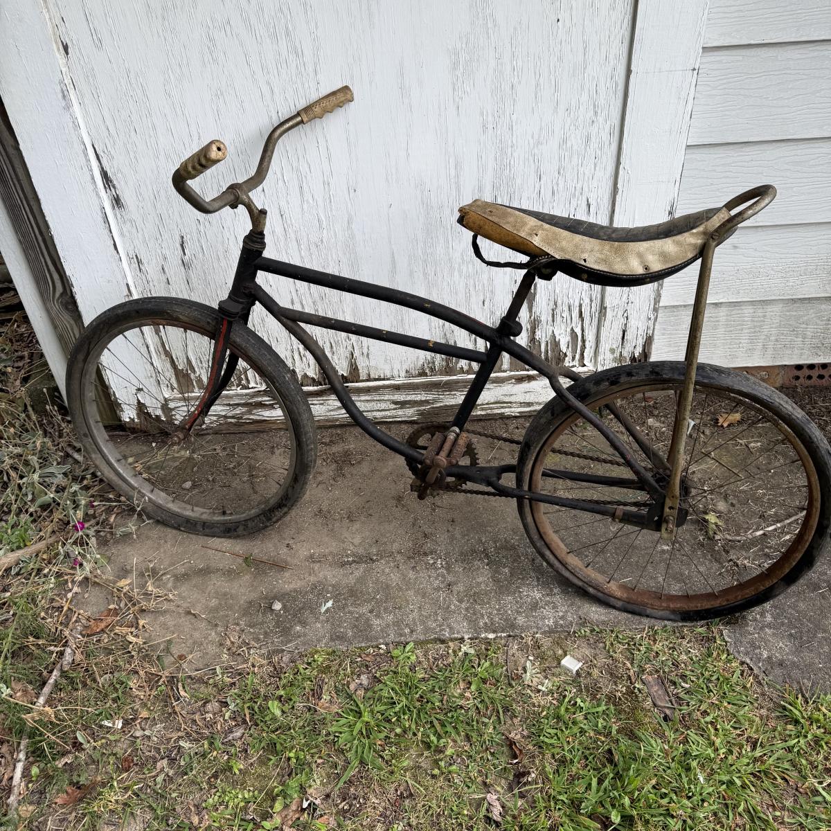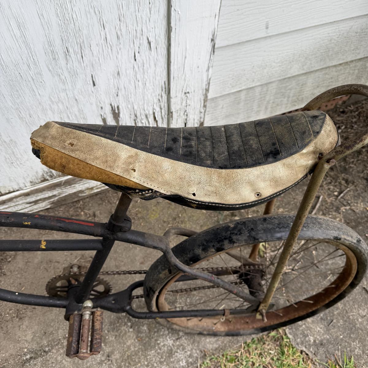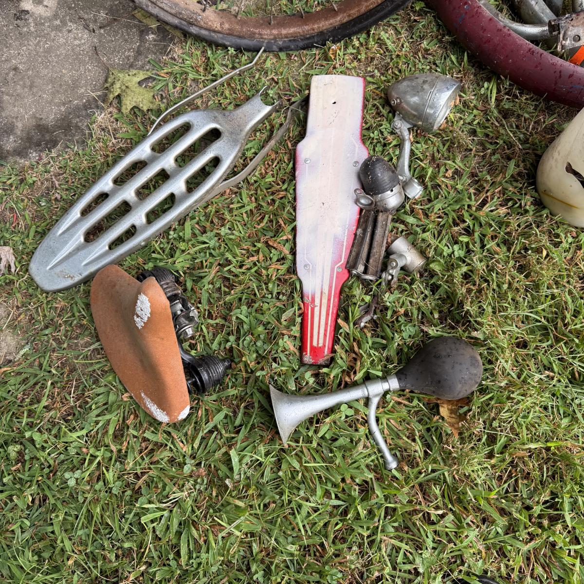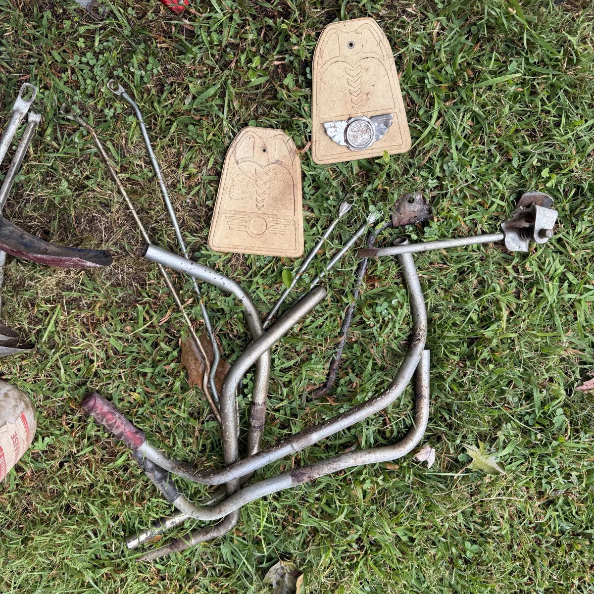 This lot contains two vintage bikes, a vintage tricycle and some vintage bike parts. Check out the unique handlebar covers on the Western Flyer! The smaller of the two bikes measures 66” x 26” x 40”H with a seat height of 31”H. See picture for full inventory. Items in the background are not included. Local pickup only.