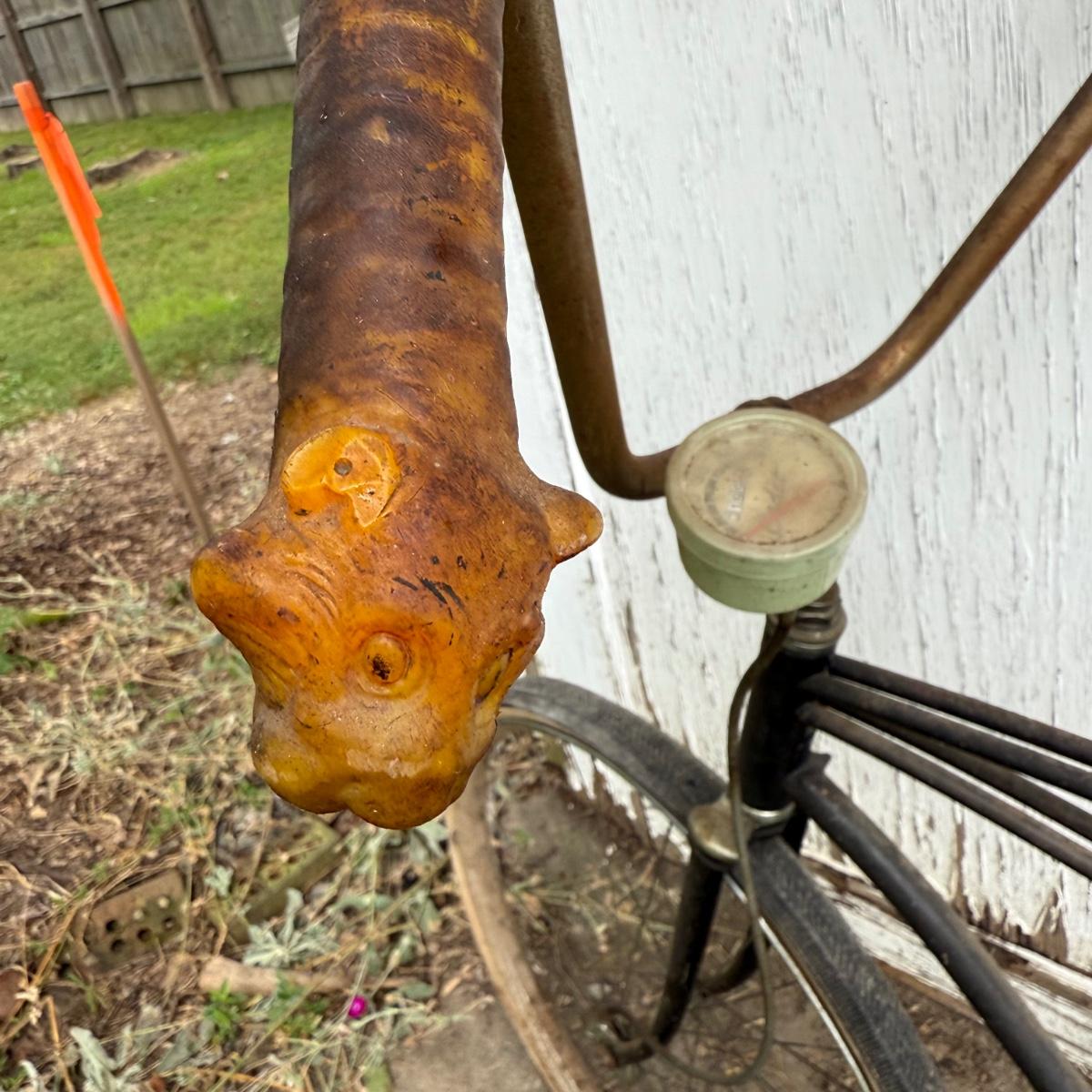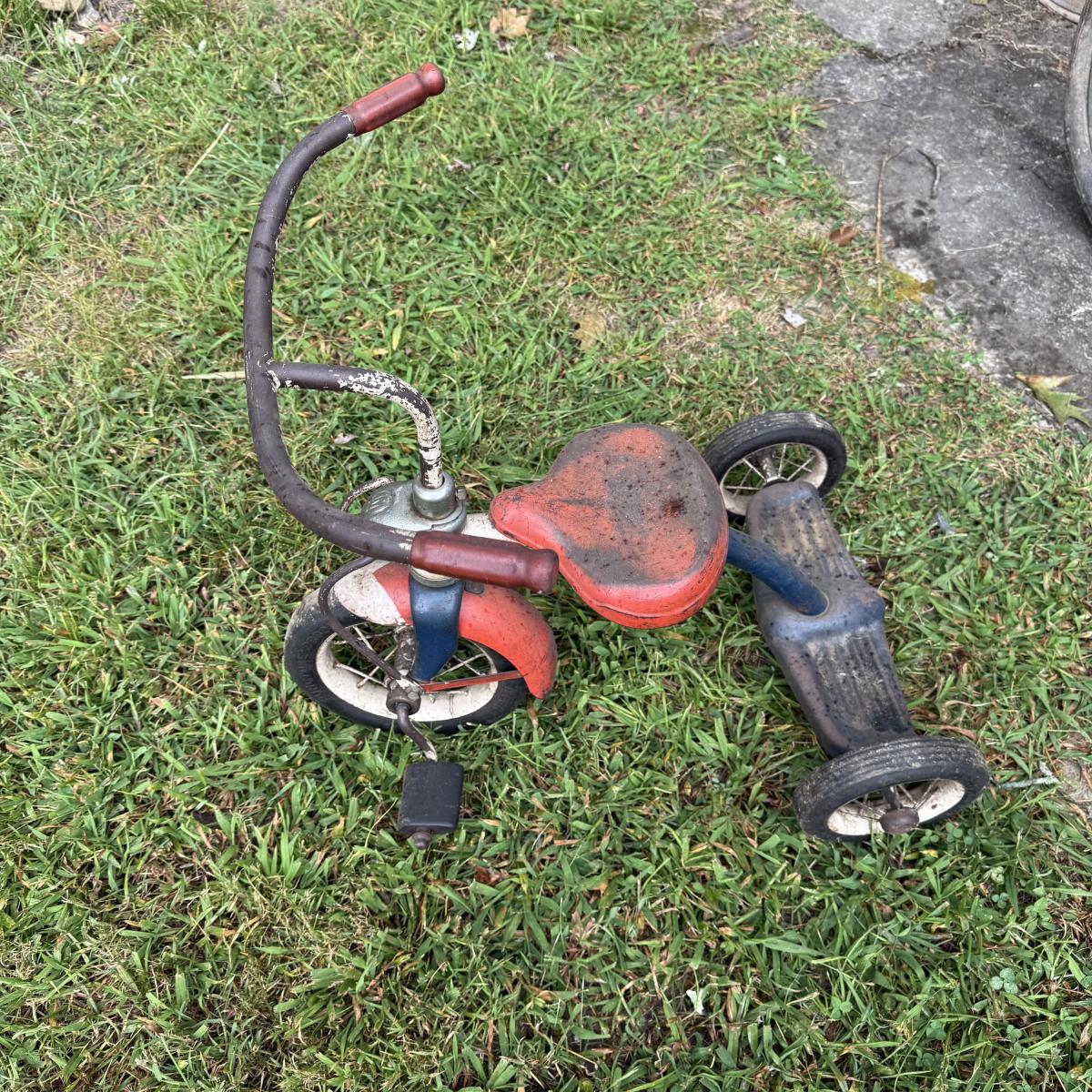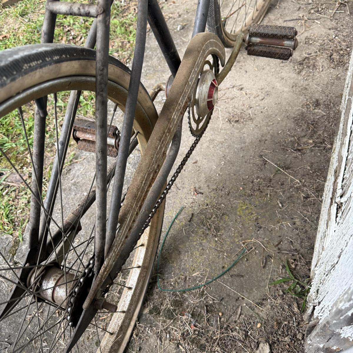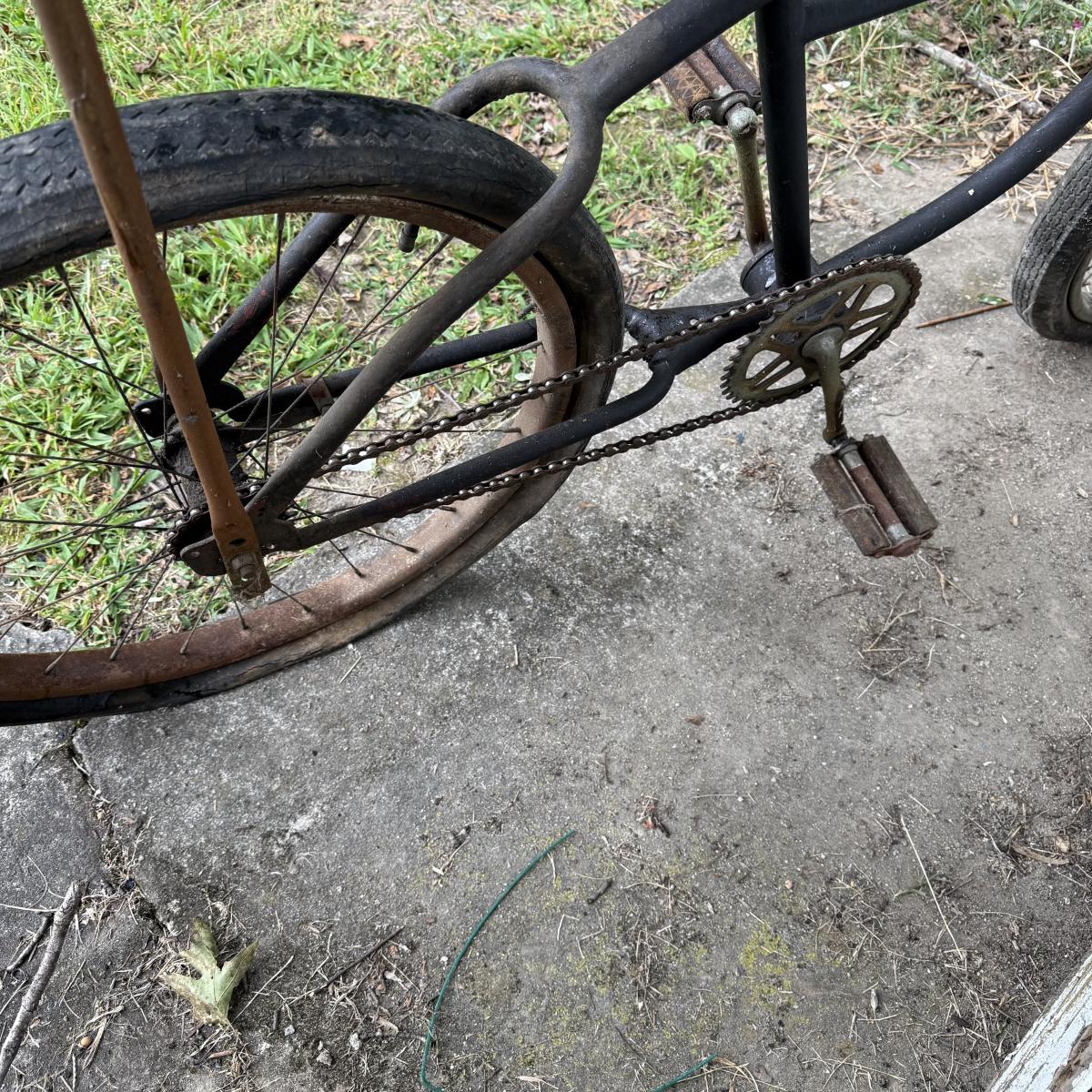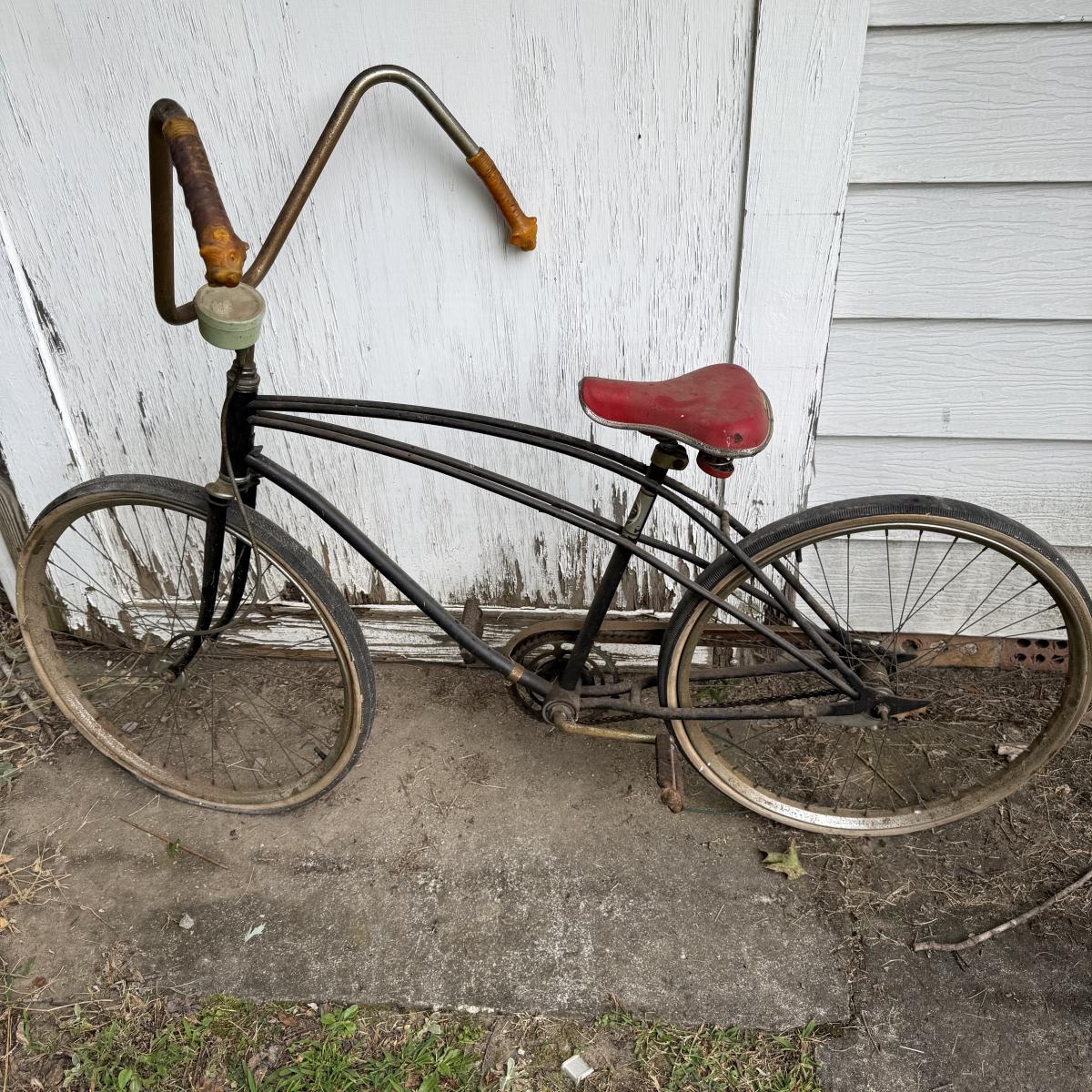 This lot contains two vintage bikes, a vintage tricycle and some vintage bike parts. Check out the unique handlebar covers on the Western Flyer! The smaller of the two bikes measures 66” x 26” x 40”H with a seat height of 31”H. See picture for full inventory. Items in the background are not included. Local pickup only.