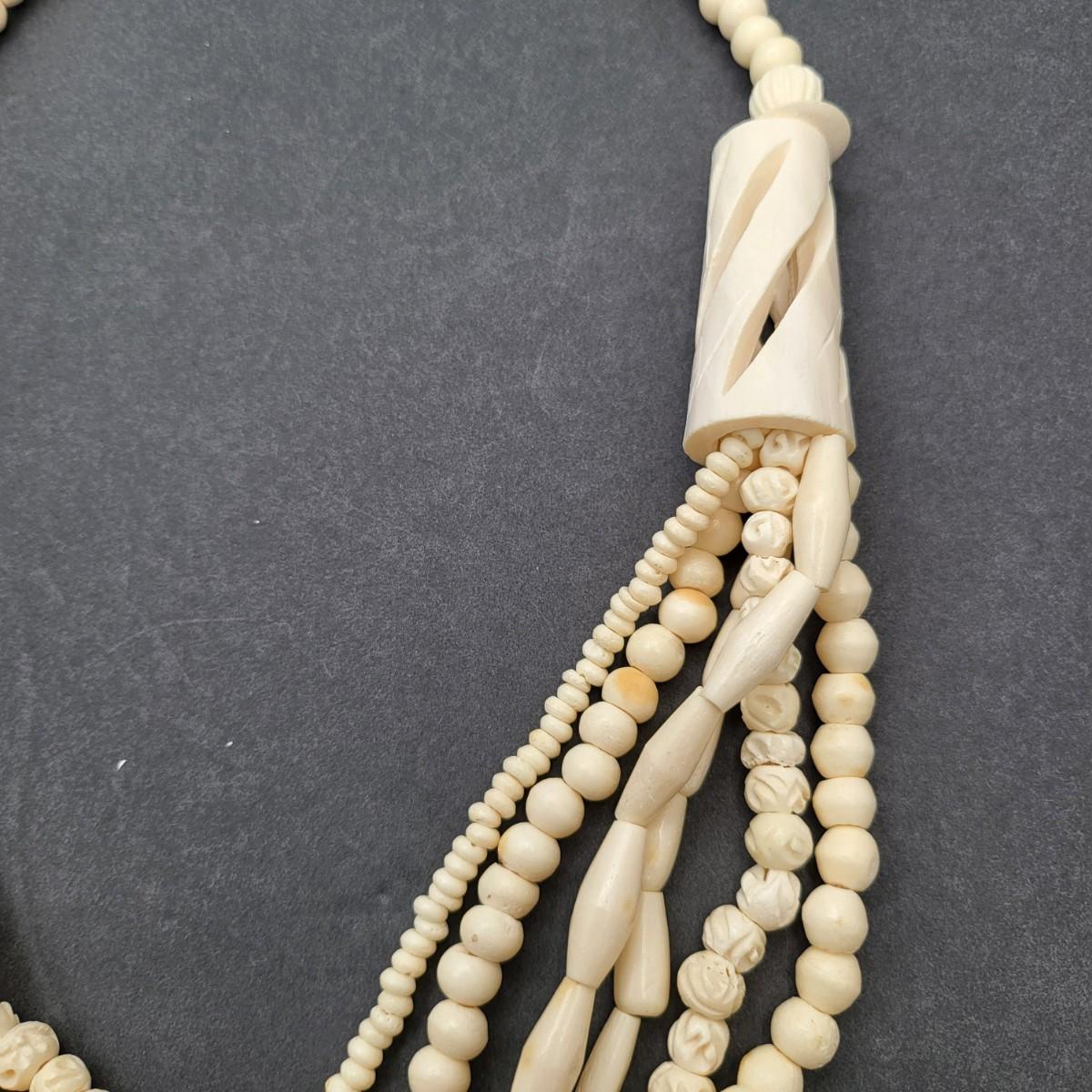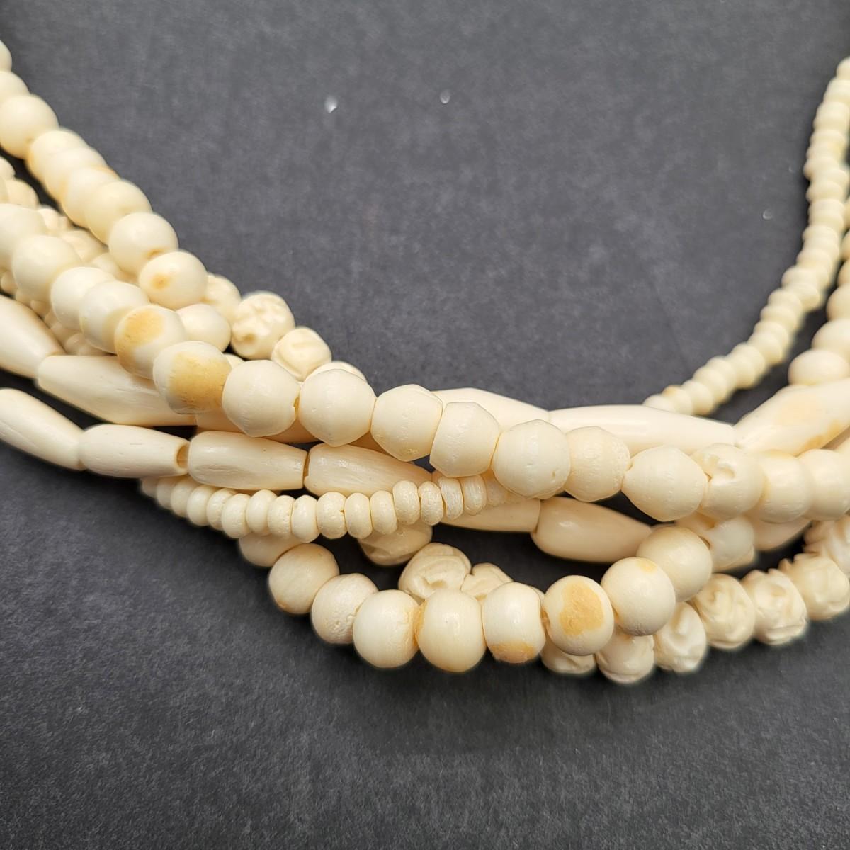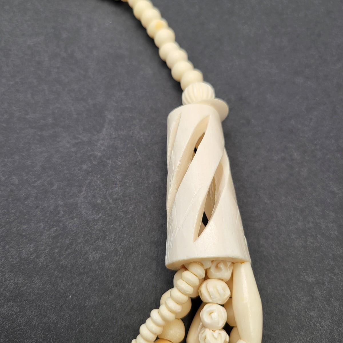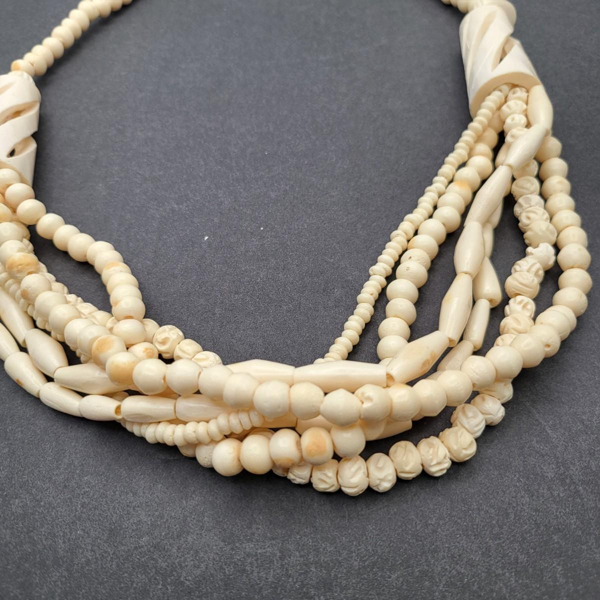 6 strands extending from the bottom of the large carved pieces. Single strand from the top of them. Necklace measures 25".