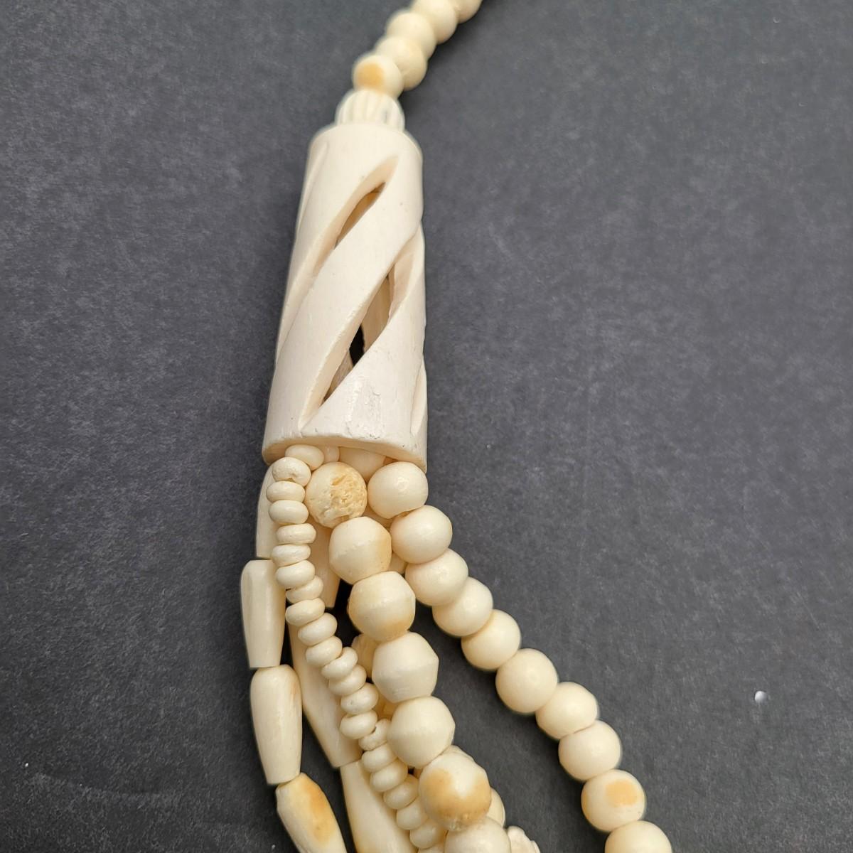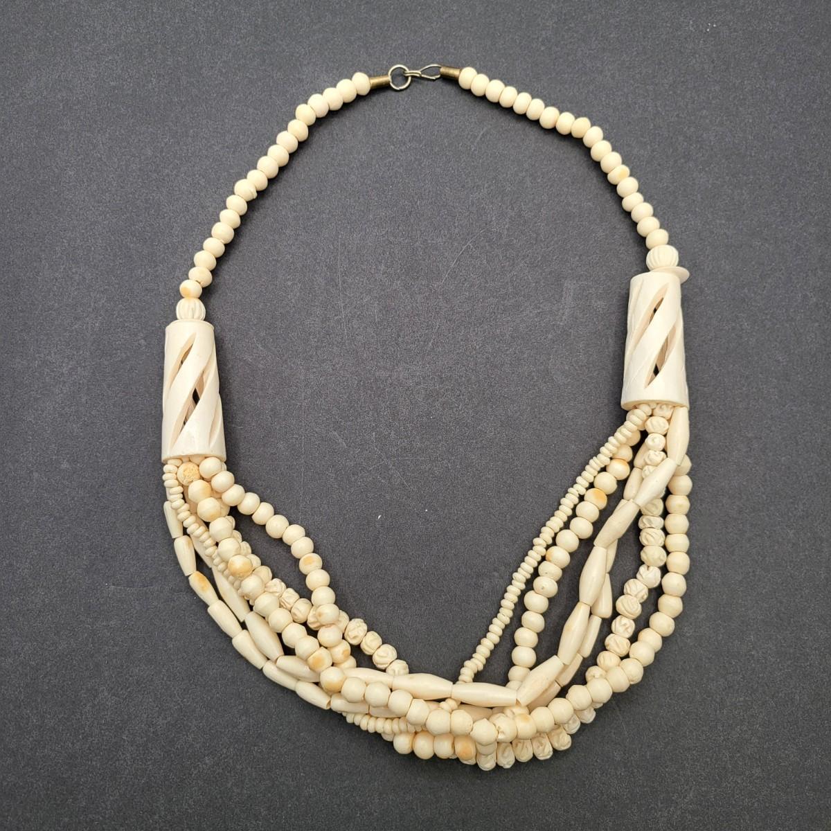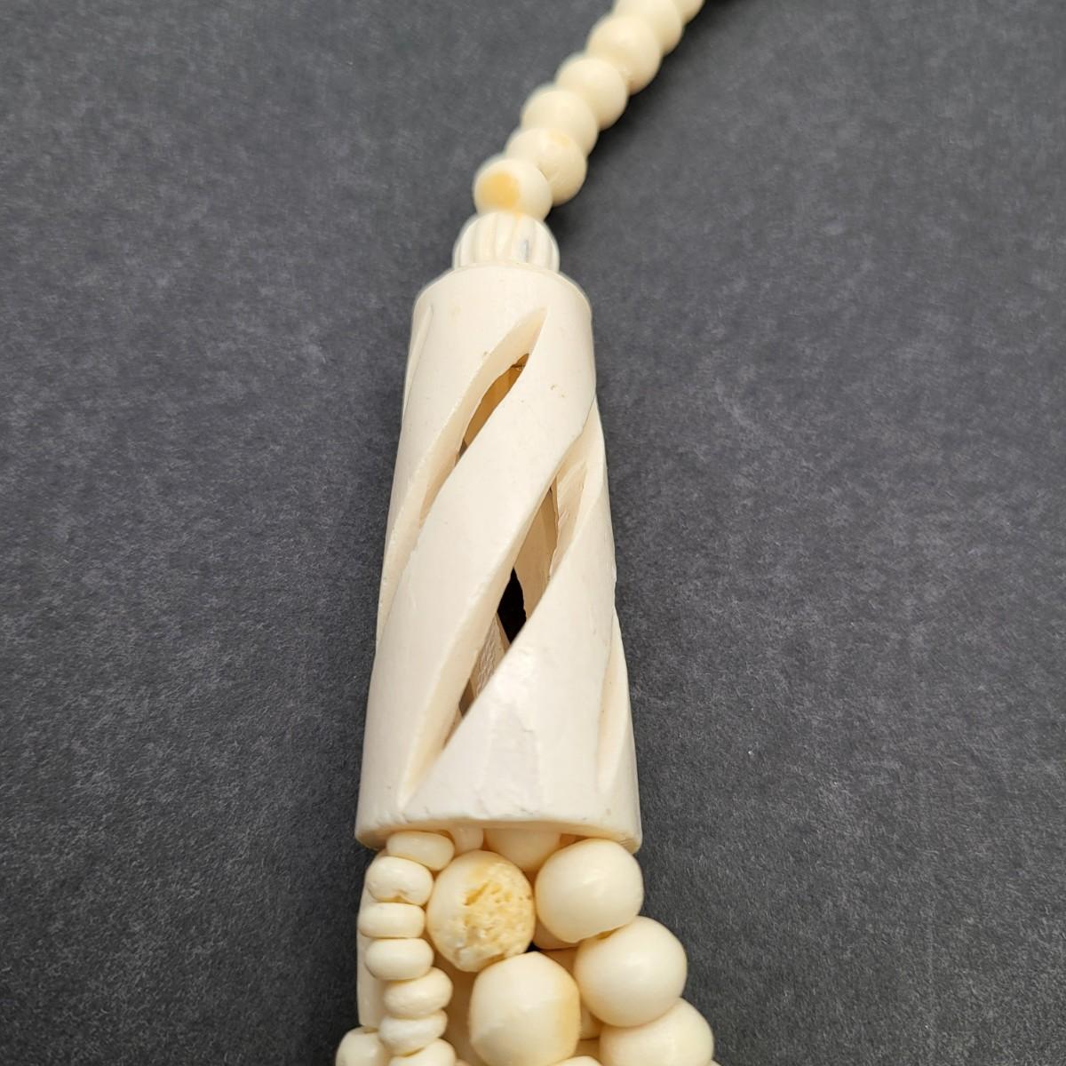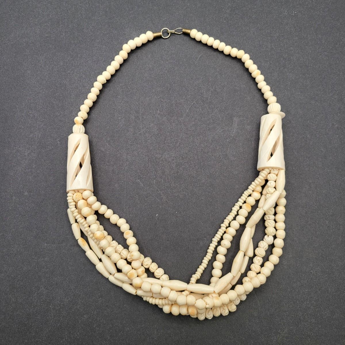 6 strands extending from the bottom of the large carved pieces. Single strand from the top of them. Necklace measures 25".