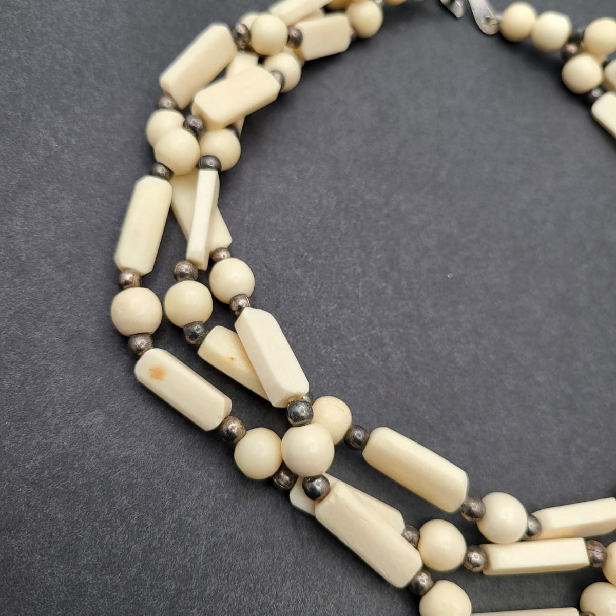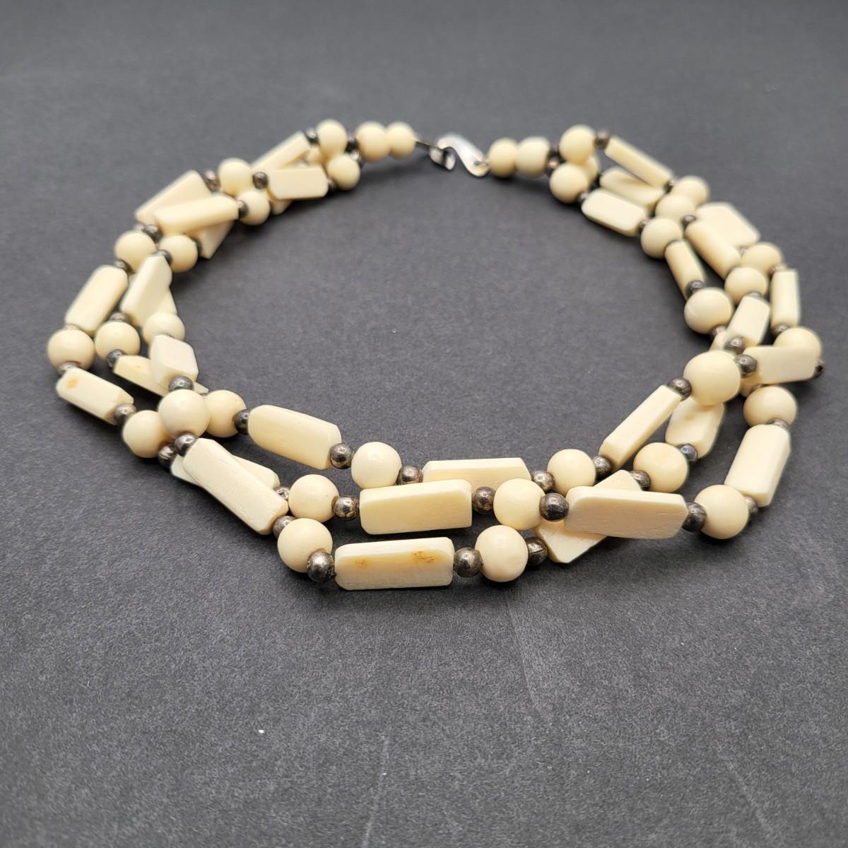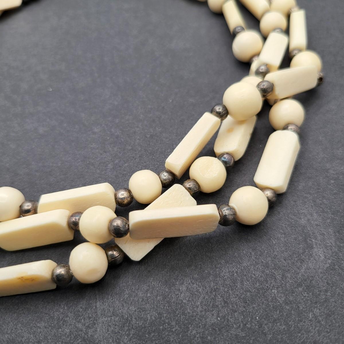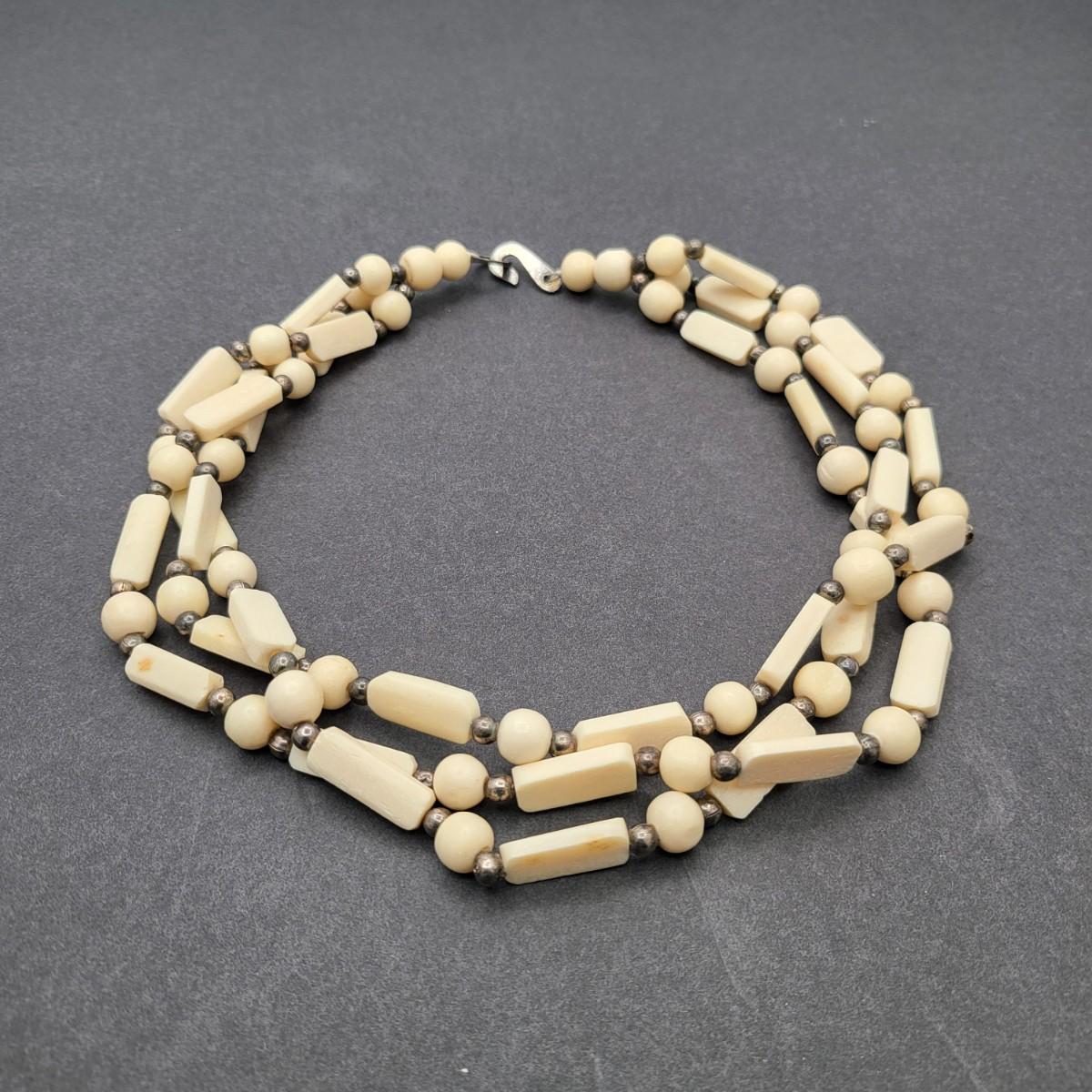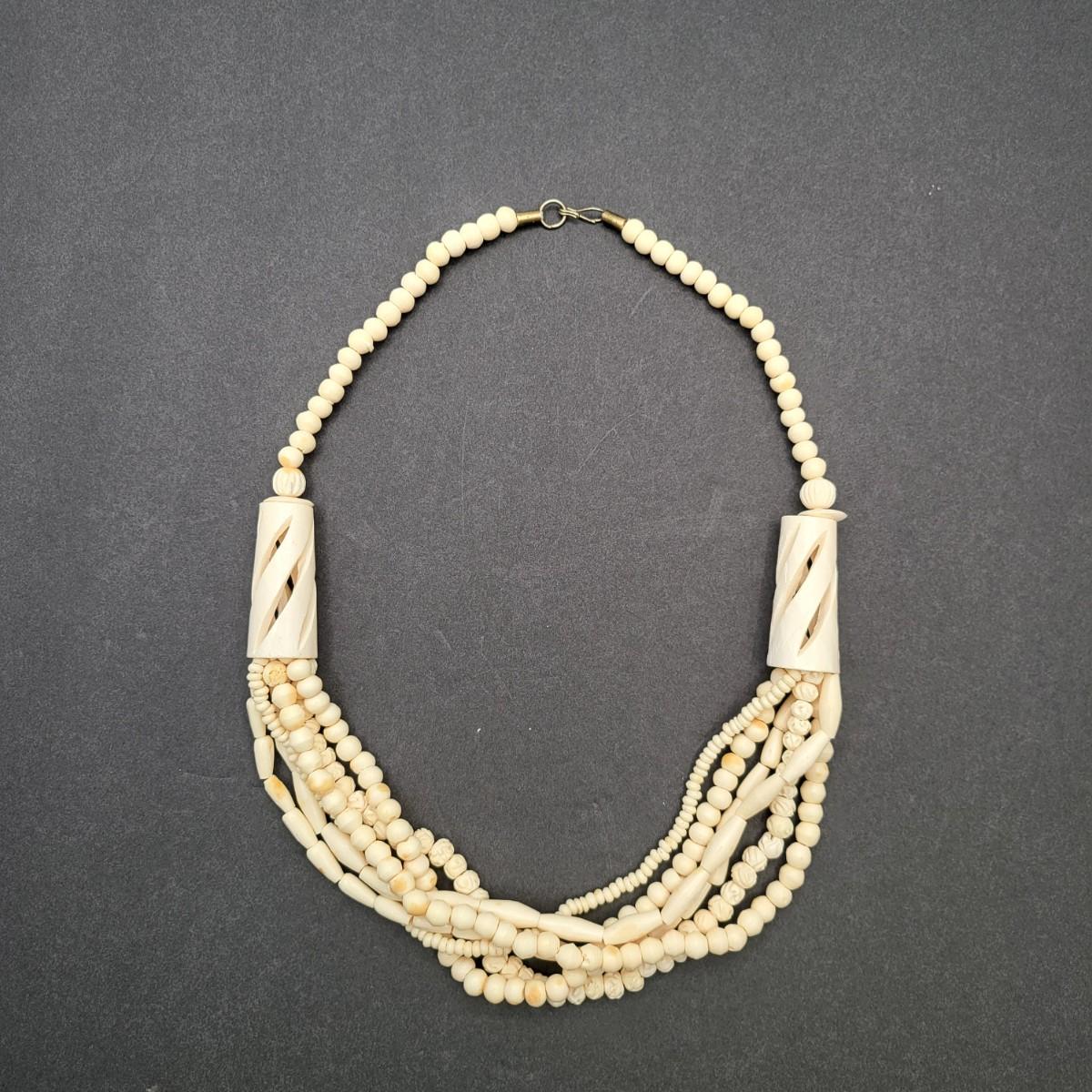 6 strands extending from the bottom of the large carved pieces. Single strand from the top of them. Necklace measures 25".