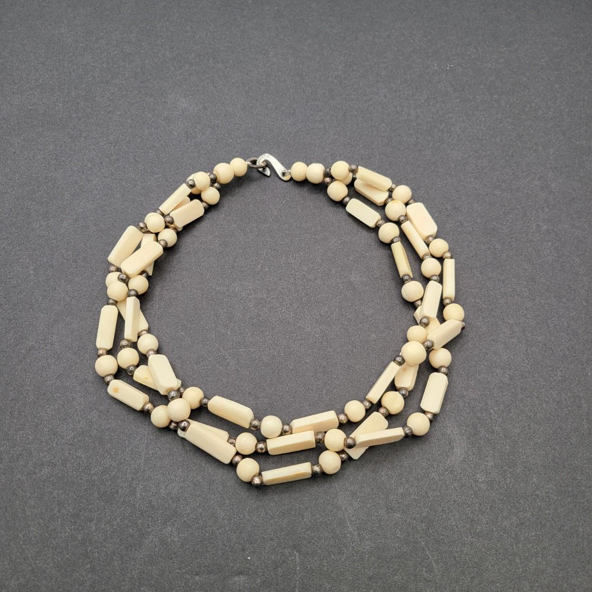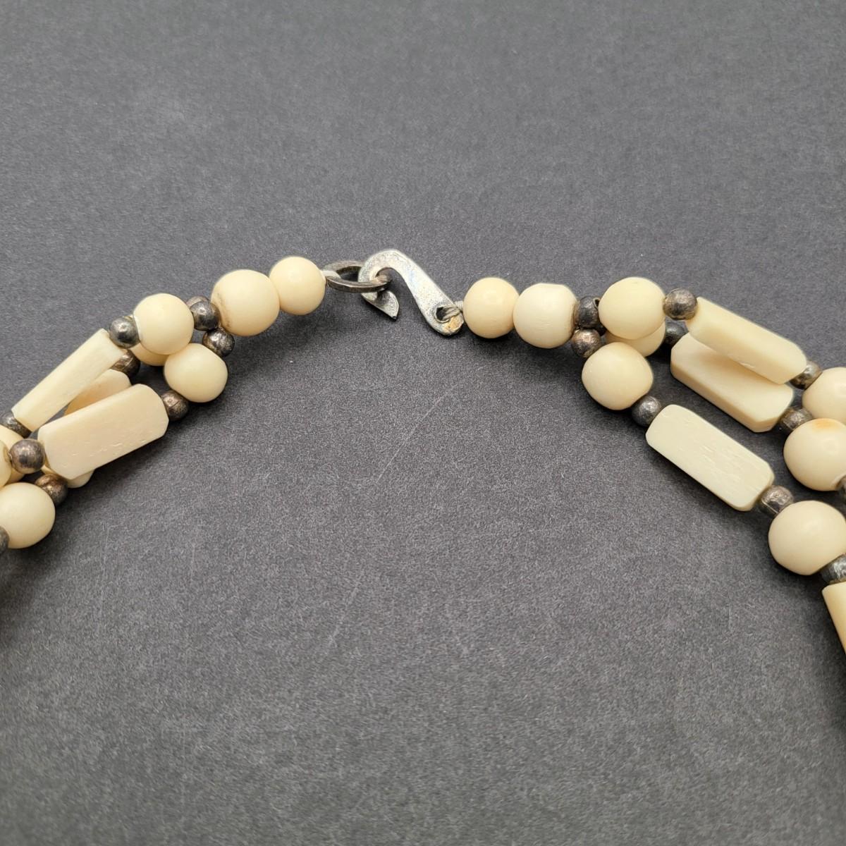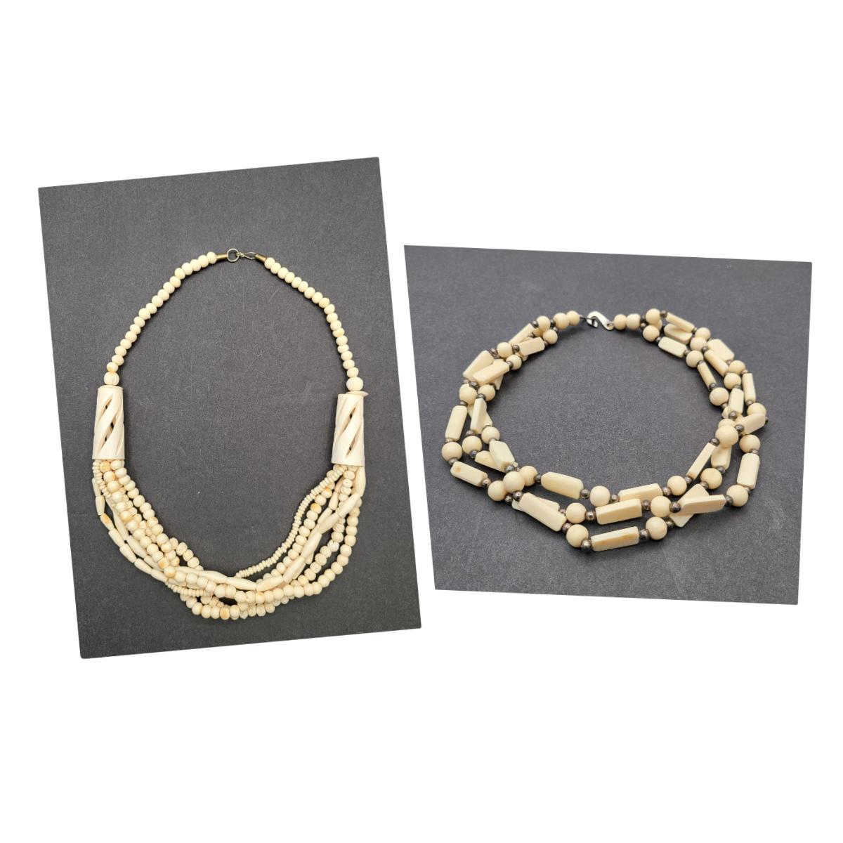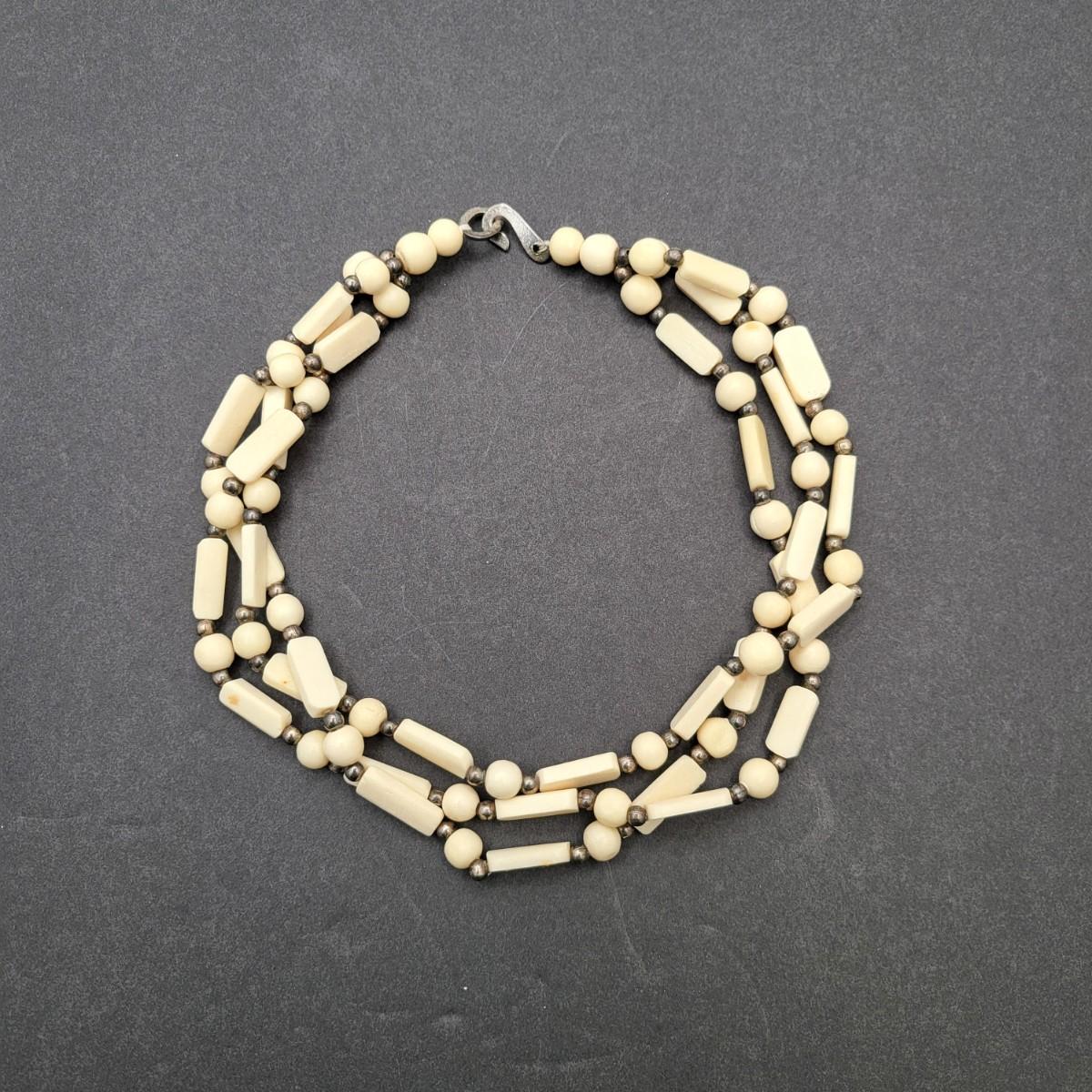 6 strands extending from the bottom of the large carved pieces. Single strand from the top of them. Necklace measures 25".