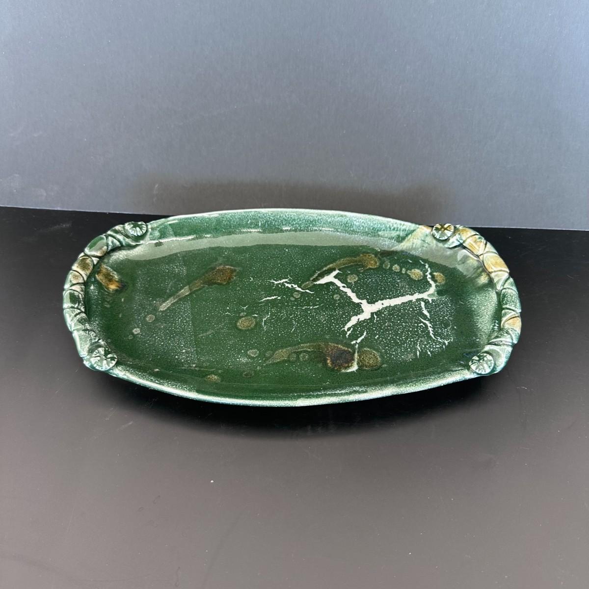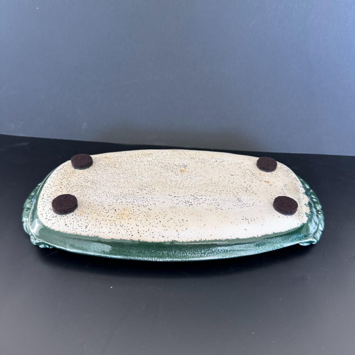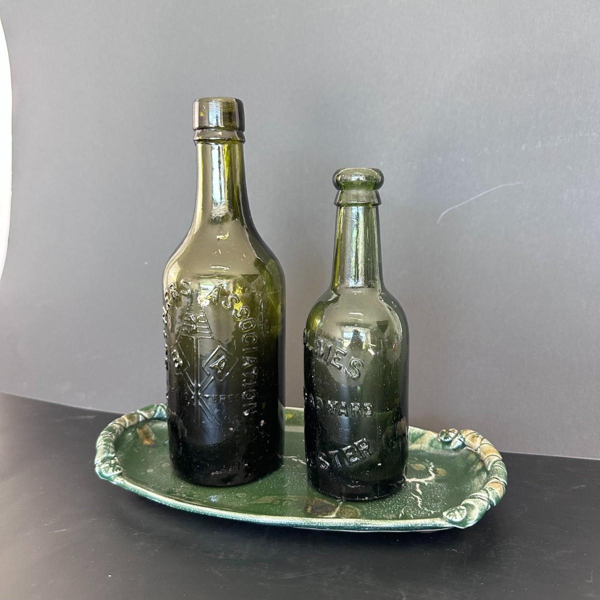 These two vintage green bottles are placed on a vintage ceramic platter. The bottles and ceramic platter come together for an excellent decor piece.