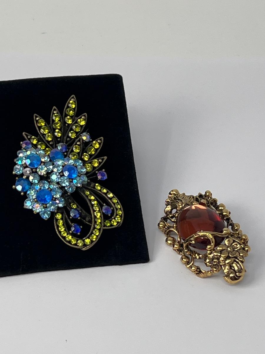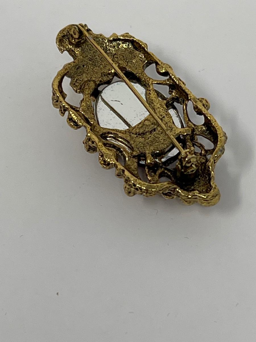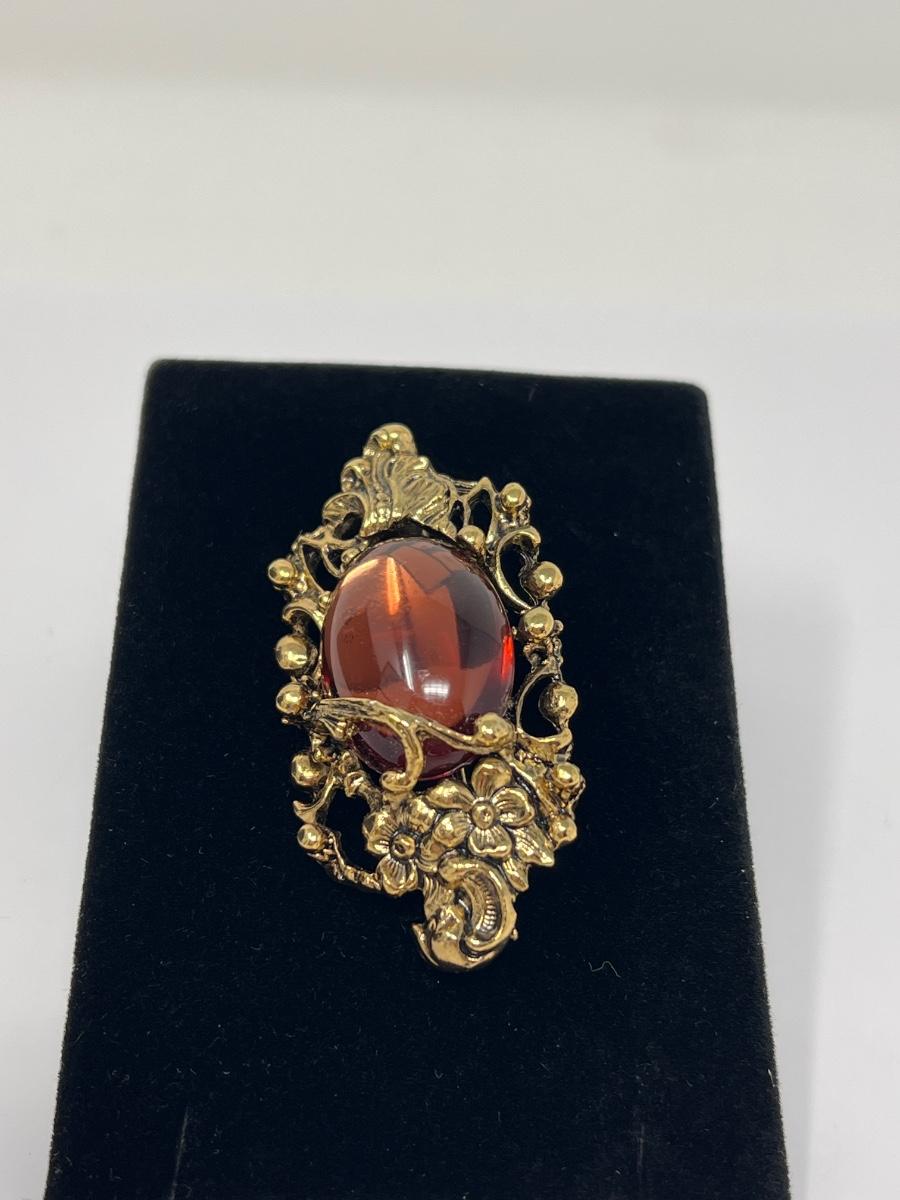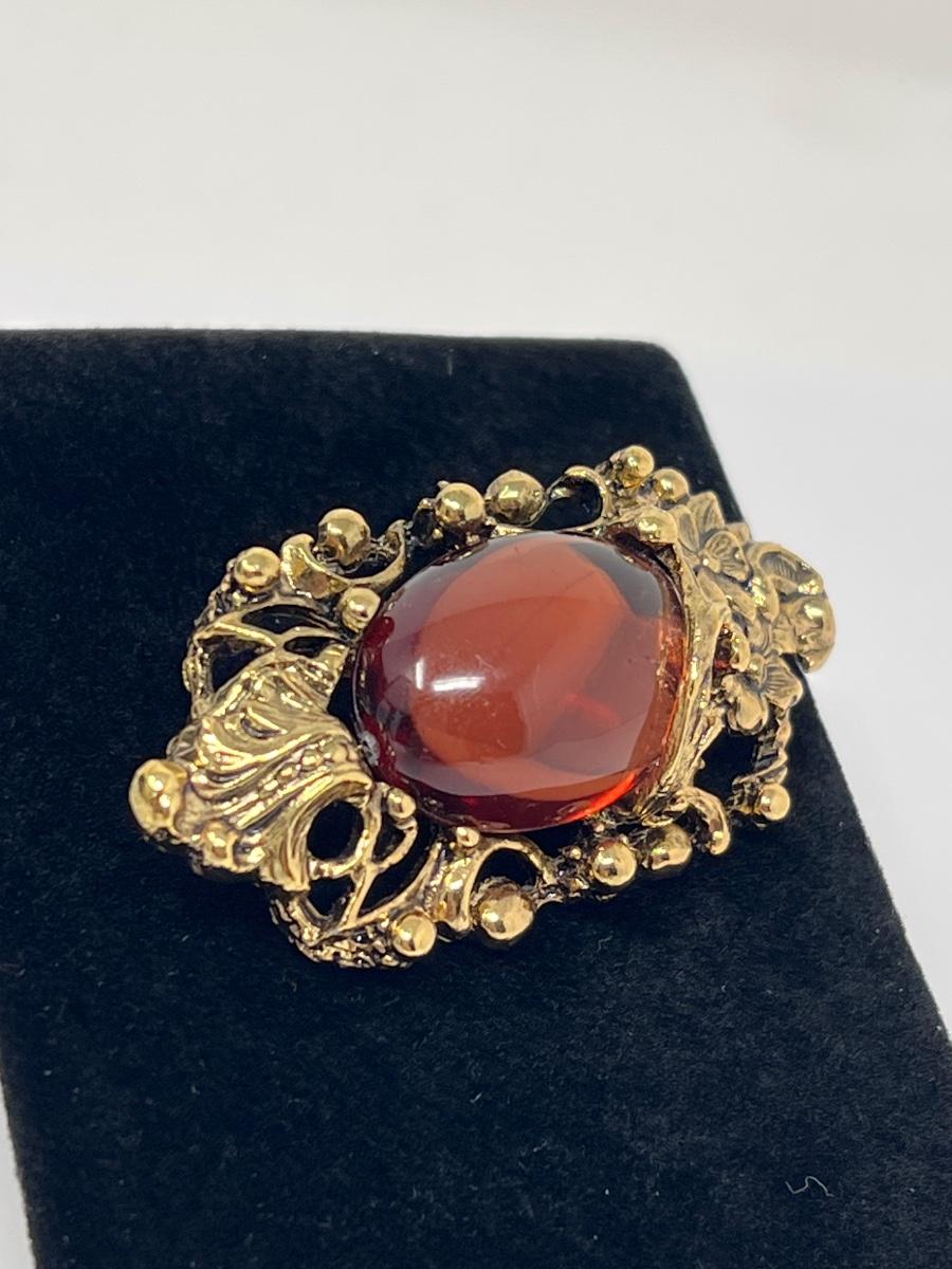 Amber glass stone set in gold toned metal - size 2” x 1”