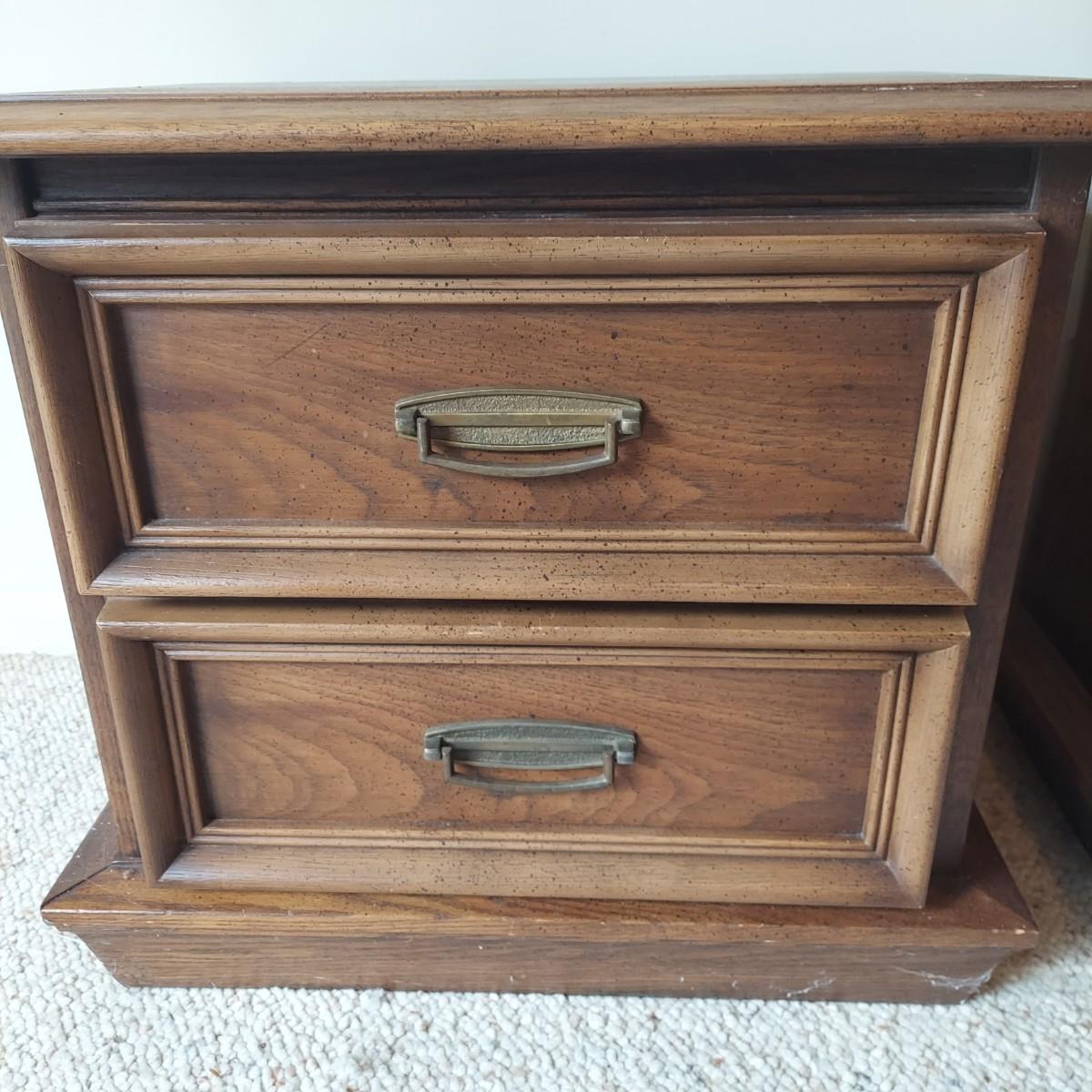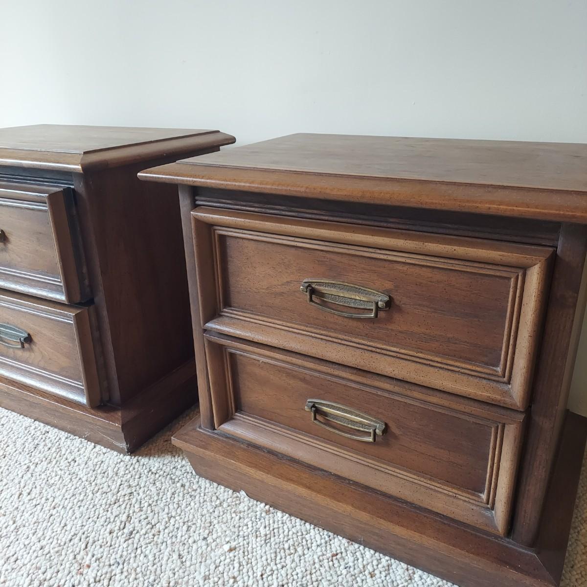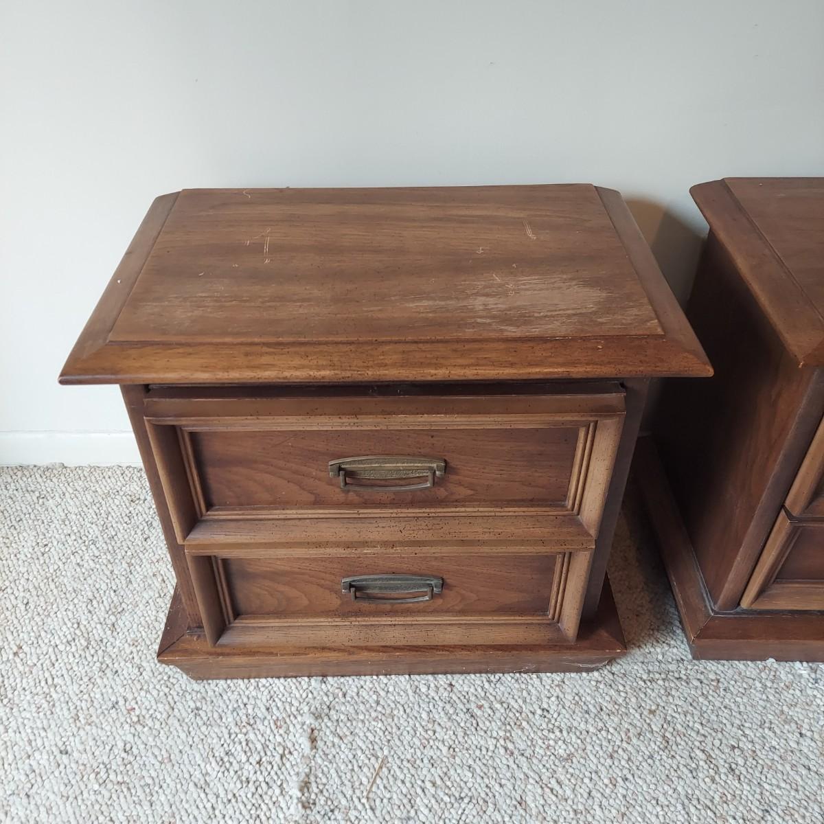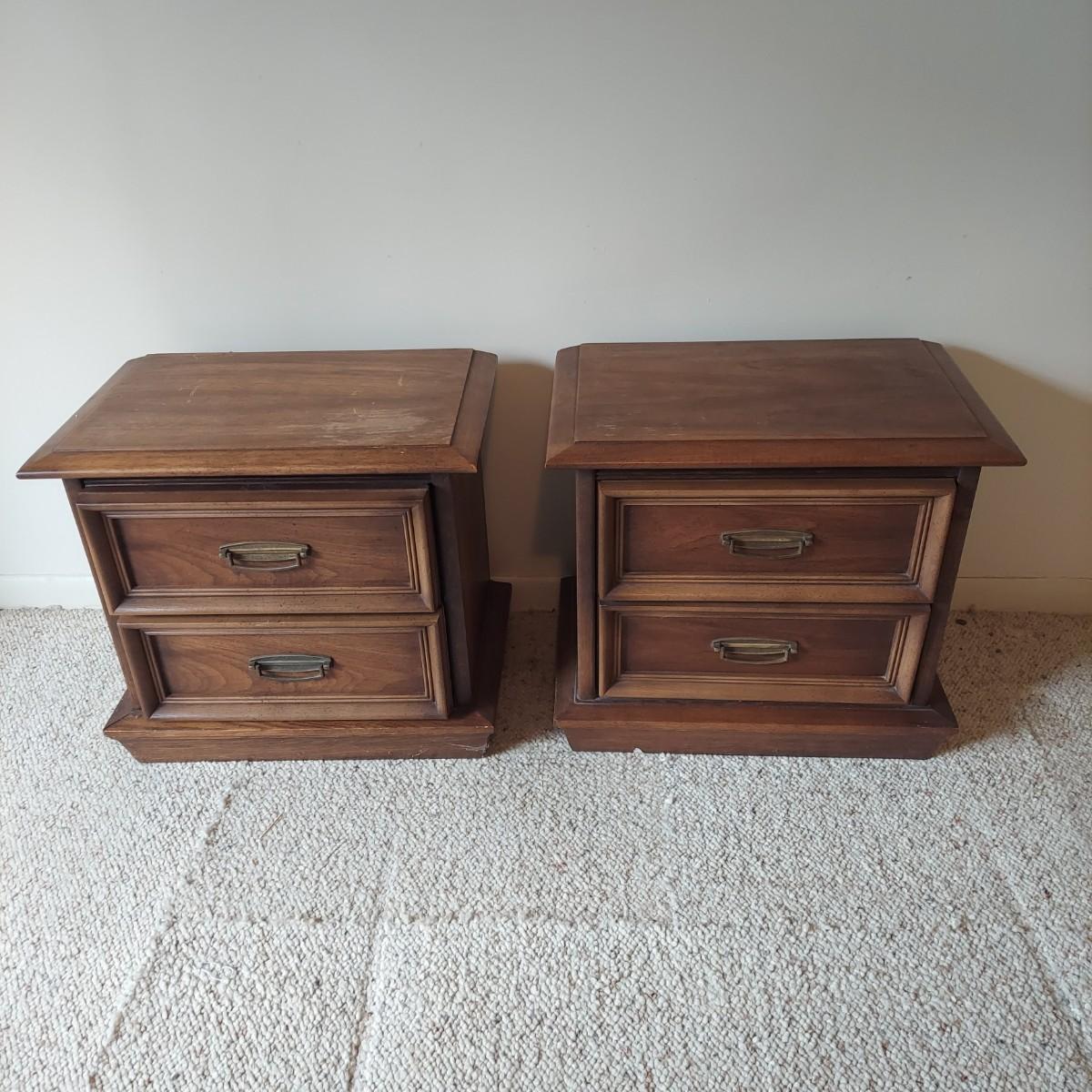Pair of solid wood Broyhill nightstands with dovetailed drawers and heavy metal brass-like hardware. Each measures 23” x 16” x 23"H. Some condition issues on the tops. Please see photos for details. Local Pickup Only. Winning bidder must bring assistance to help move and load this item due to its weight and/or size. It's located on the basement level that has external entrance