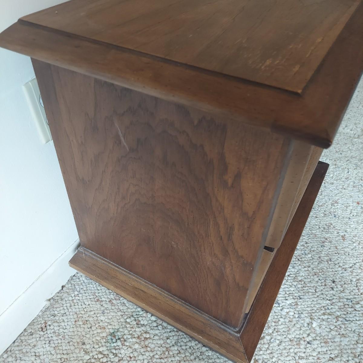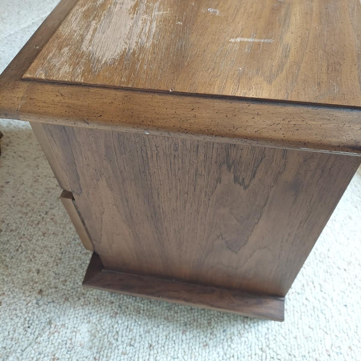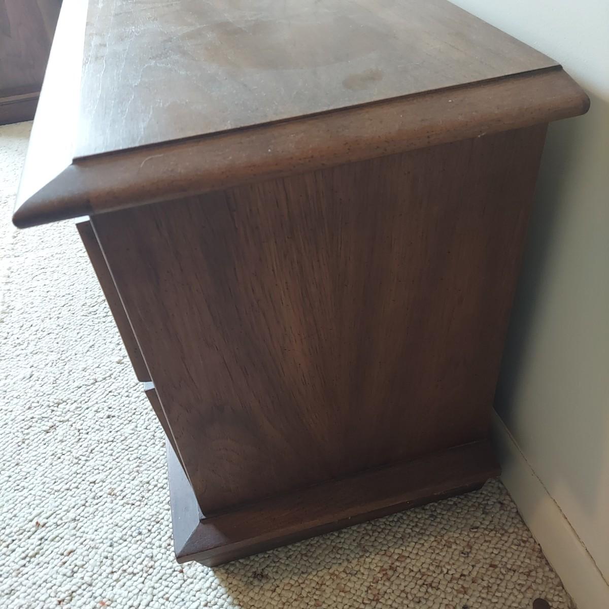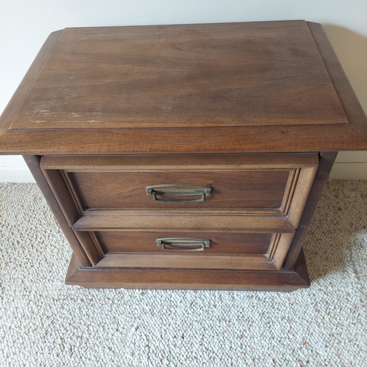 Pair of solid wood Broyhill nightstands with dovetailed drawers and heavy metal brass-like hardware. Each measures 23” x 16” x 23"H. Some condition issues on the tops. Please see photos for details. Local Pickup Only. Winning bidder must bring assistance to help move and load this item due to its weight and/or size. It's located on the basement level that has external entrance