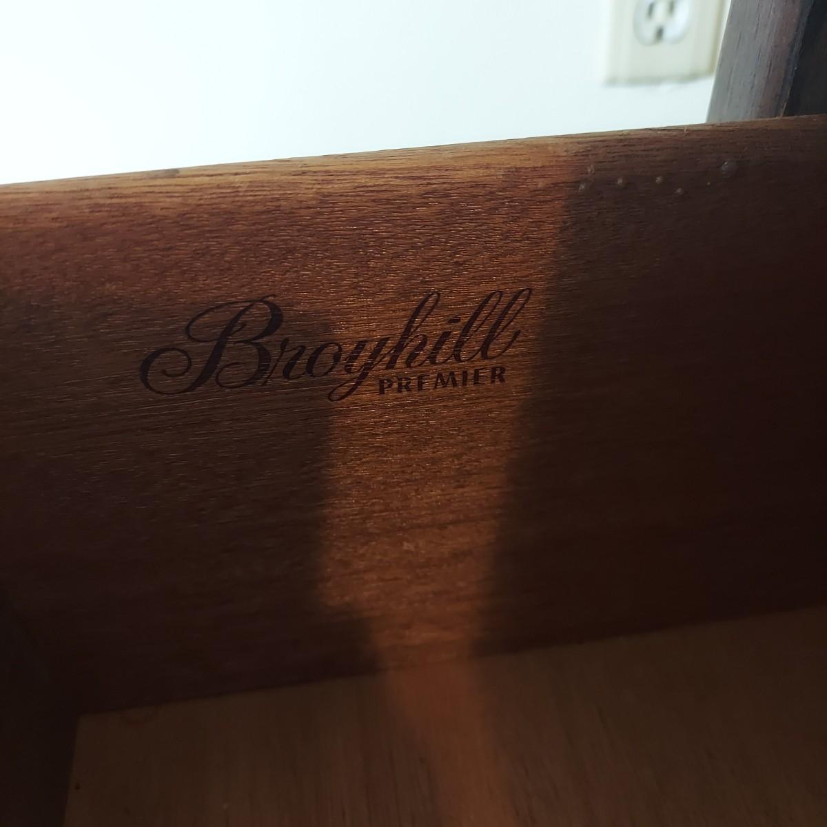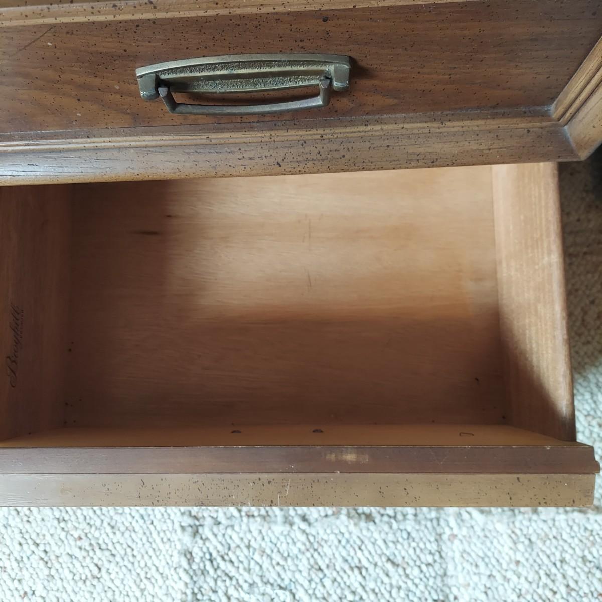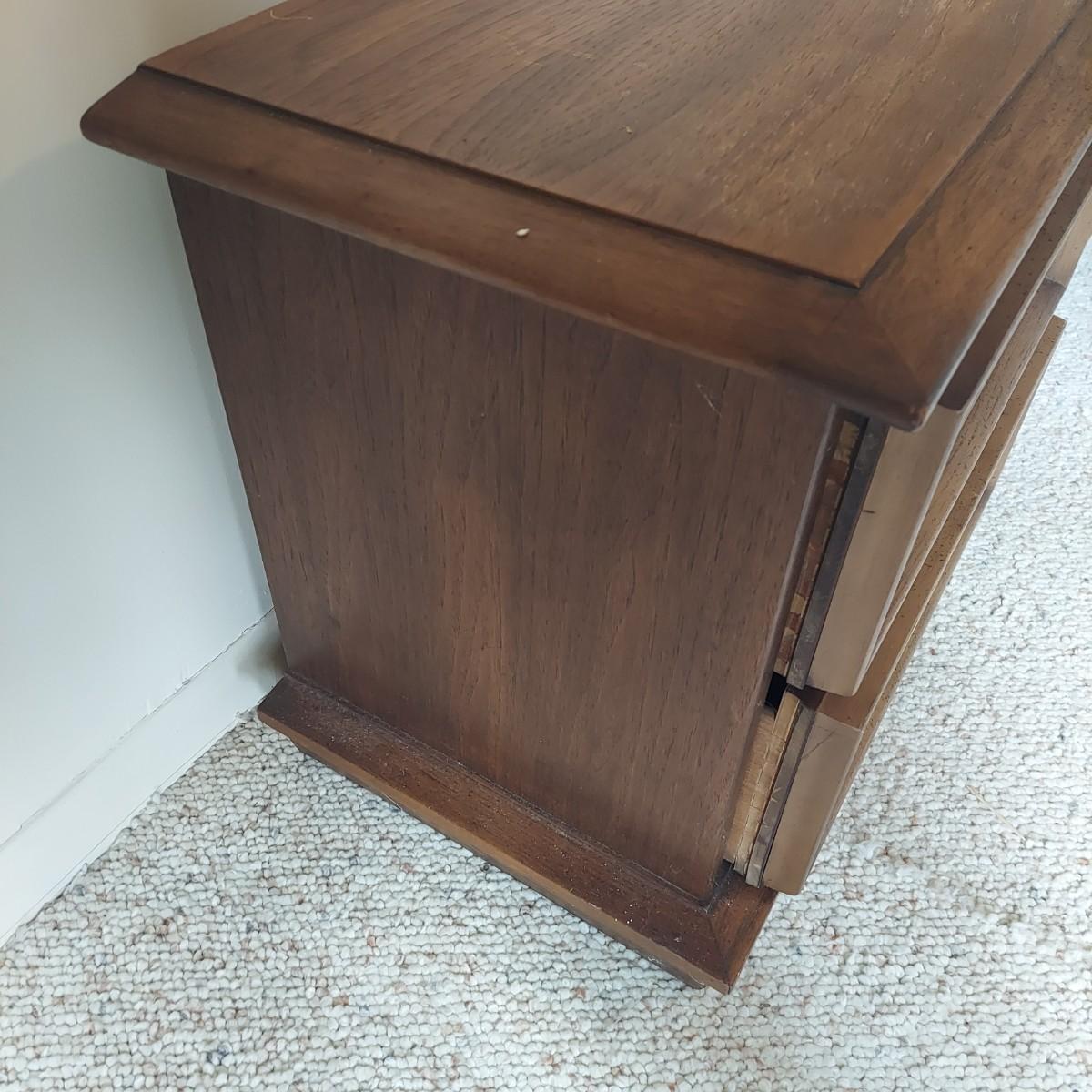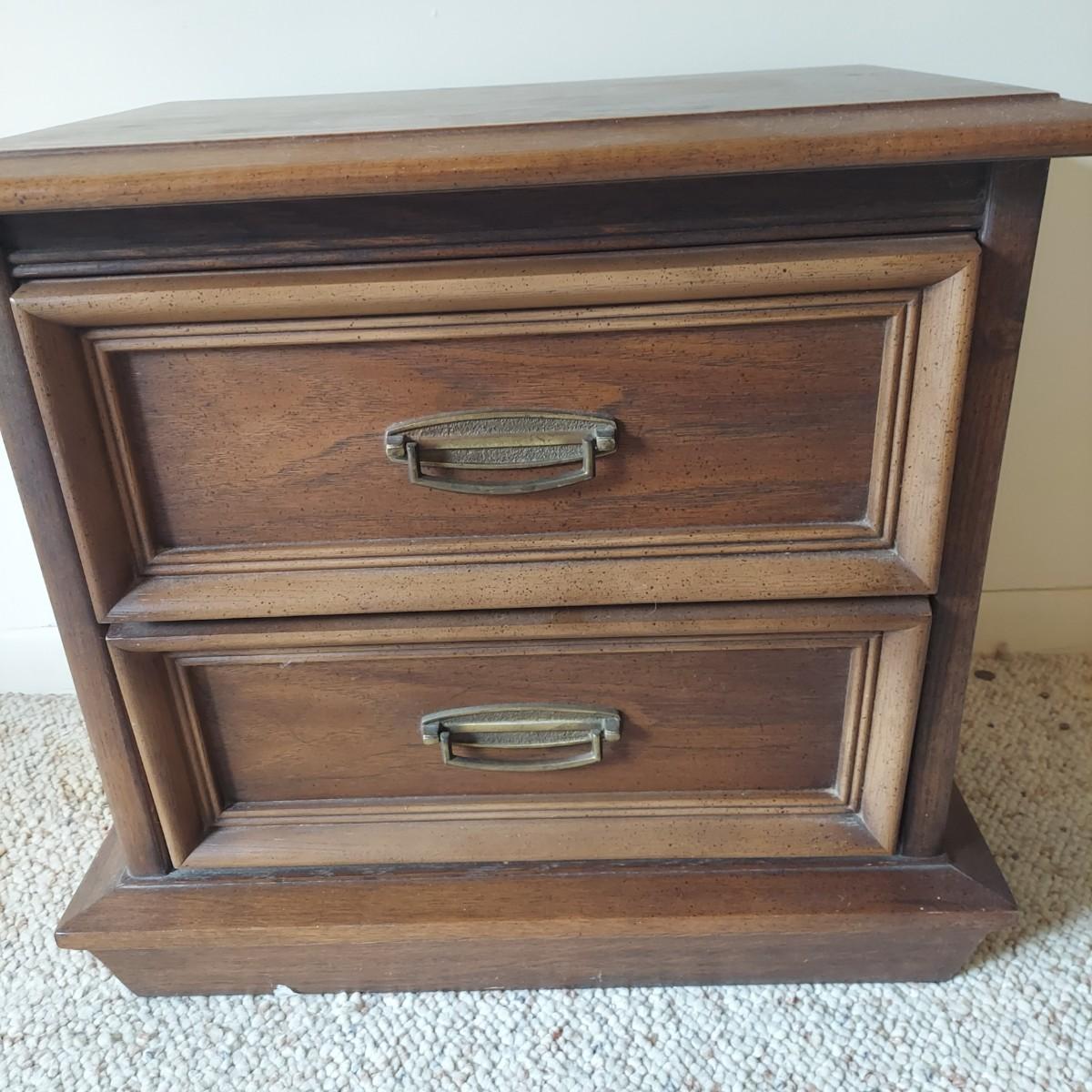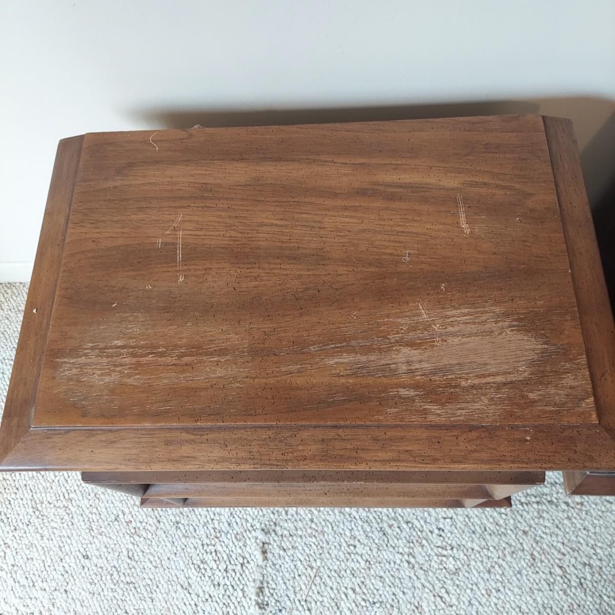 Pair of solid wood Broyhill nightstands with dovetailed drawers and heavy metal brass-like hardware. Each measures 23” x 16” x 23"H. Some condition issues on the tops. Please see photos for details. Local Pickup Only. Winning bidder must bring assistance to help move and load this item due to its weight and/or size. It's located on the basement level that has external entrance