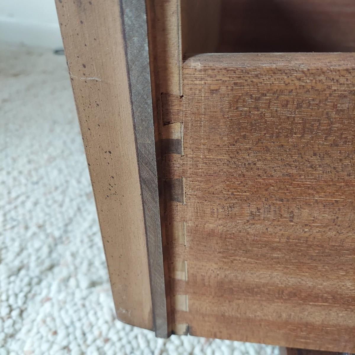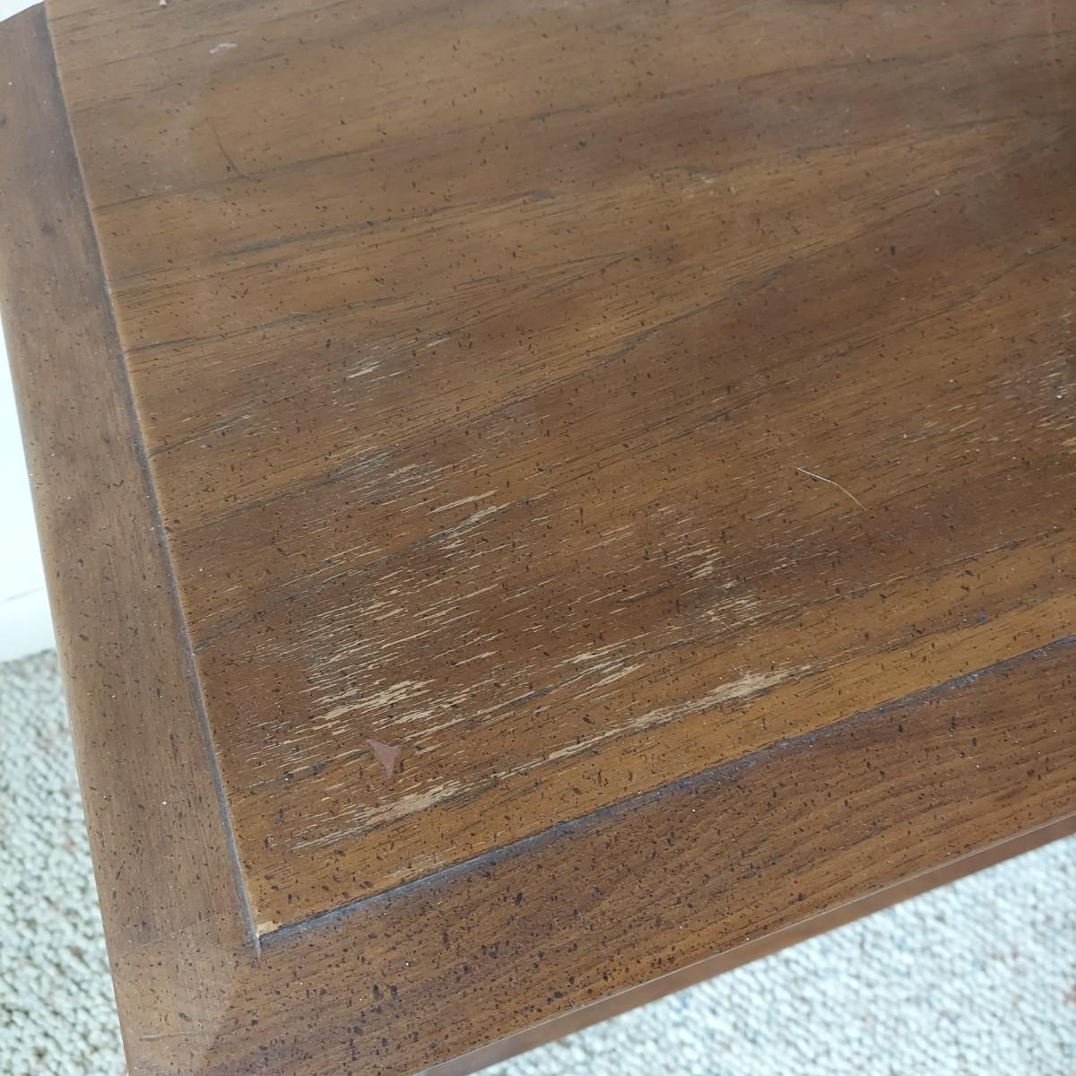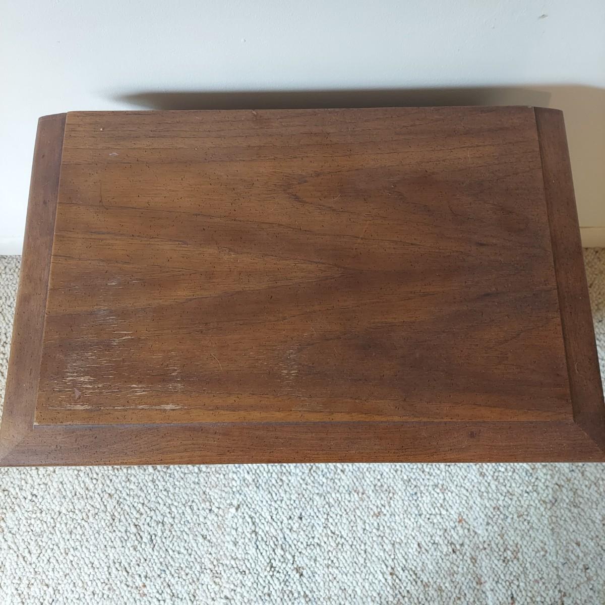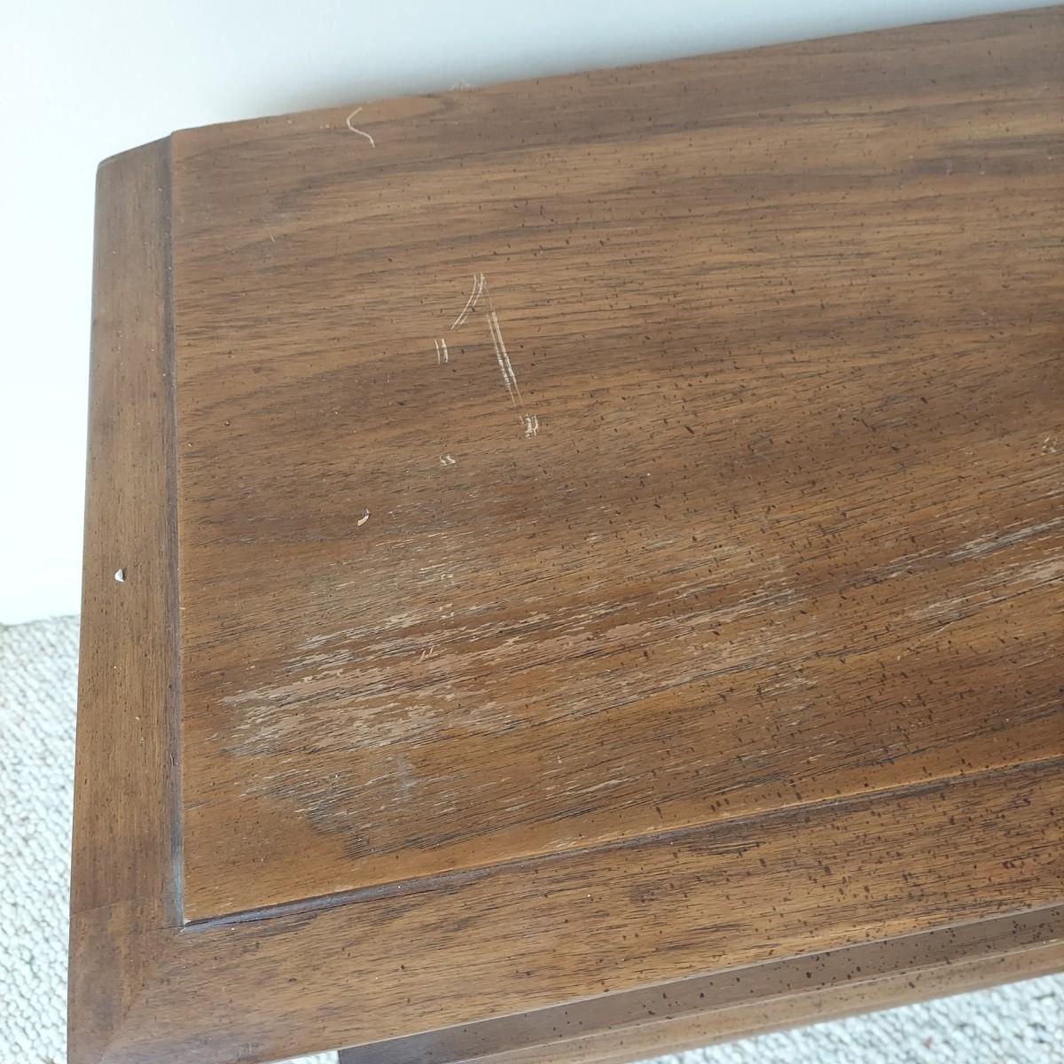Pair of solid wood Broyhill nightstands with dovetailed drawers and heavy metal brass-like hardware. Each measures 23” x 16” x 23"H. Some condition issues on the tops. Please see photos for details. Local Pickup Only. Winning bidder must bring assistance to help move and load this item due to its weight and/or size. It's located on the basement level that has external entrance