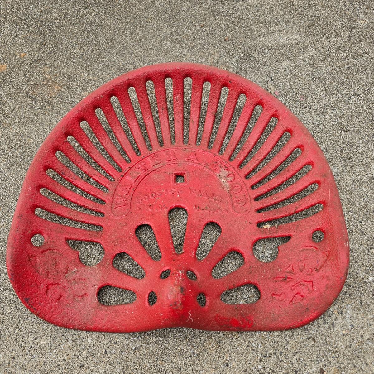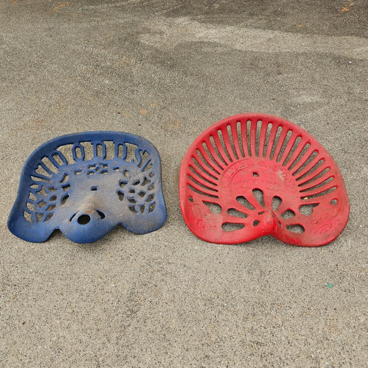 A pair of cast iron seats. Most likely from vintage tractors. Seats have been painted but wording is still legible. Red seat was made by the Walter A. Wood Co. Measures 17" x 15.5" x 3.5"H. Has visible crack across back of seat. Blue seat has the name Dodds as part of the back of the seat. Measures 15" x 14" x 3"H. See photos for details. Shipping available.