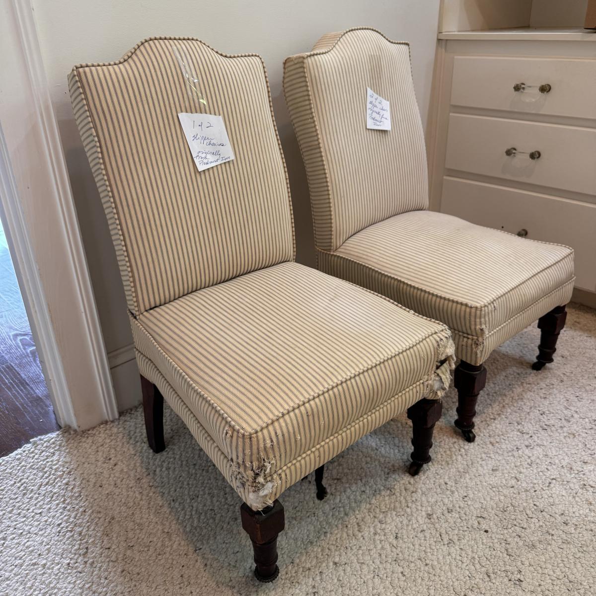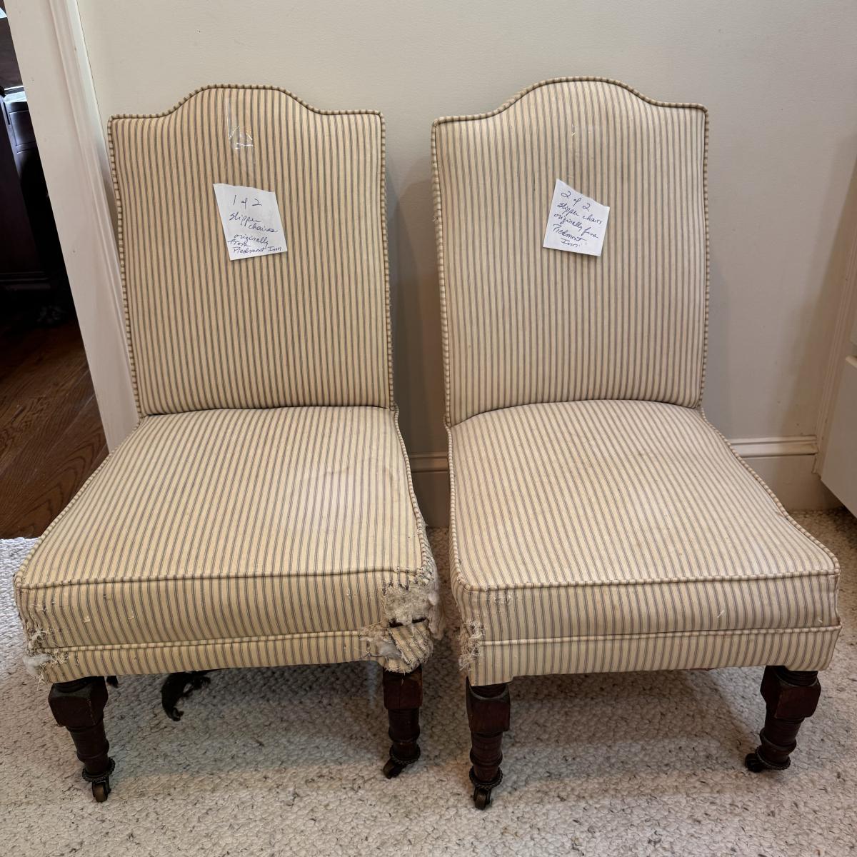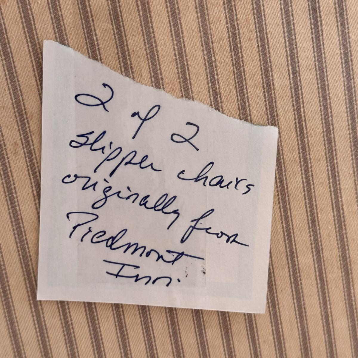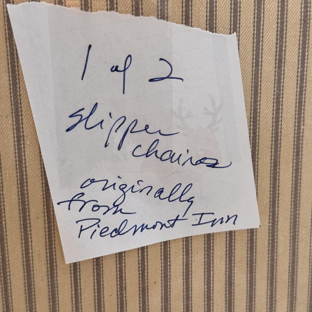 This lot includes two vintage slipper chairs. The seller claims the are from The Piedmont Inn. Due to their age, they are well worn cosmetically but appear to be sturdy structurally. Please see pictures included. The front feet on the chairs are on wheels. The legs are all wooden. The chairs individually measure 19” x 22” x 34”H. Local pickup only.