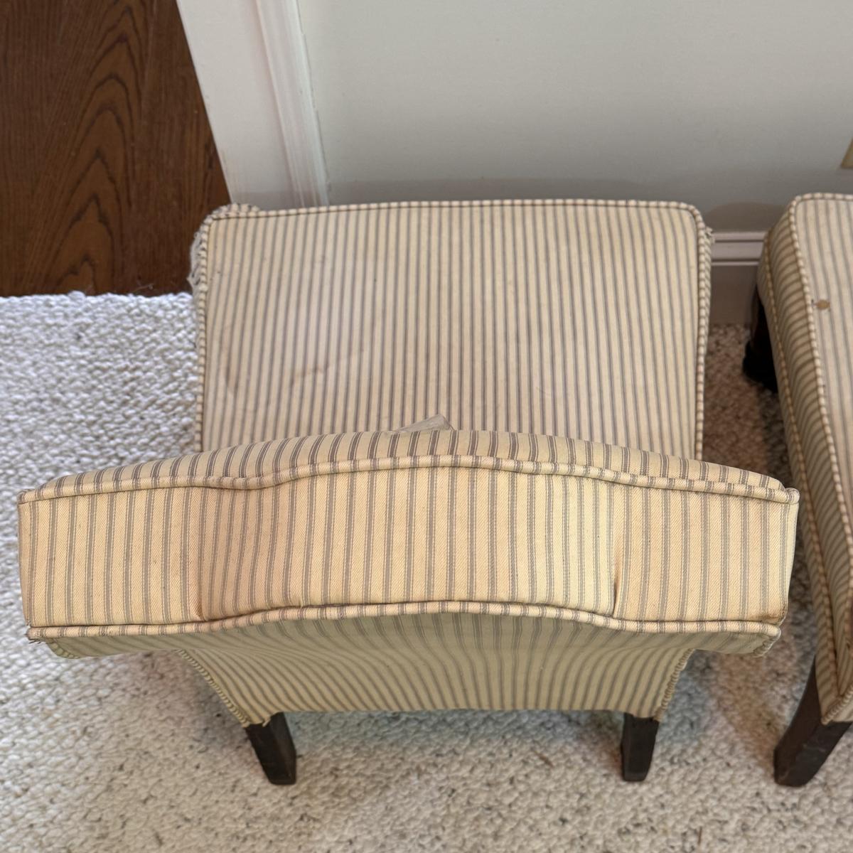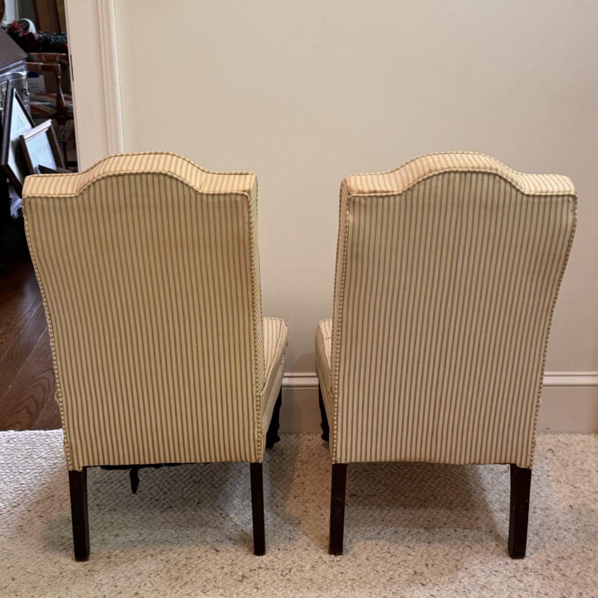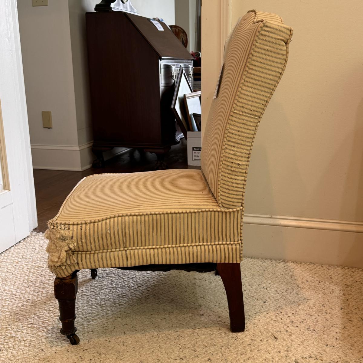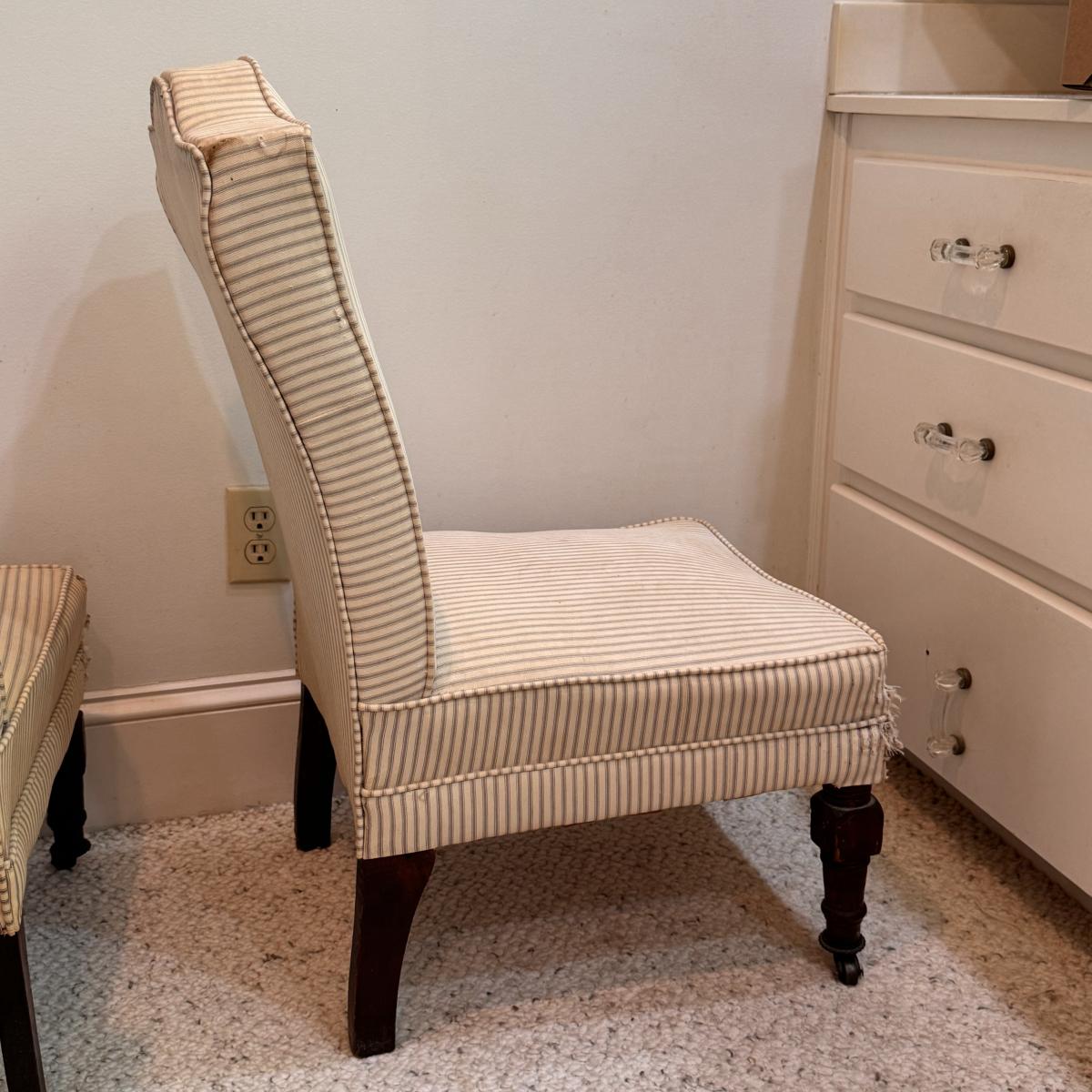 This lot includes two vintage slipper chairs. The seller claims the are from The Piedmont Inn. Due to their age, they are well worn cosmetically but appear to be sturdy structurally. Please see pictures included. The front feet on the chairs are on wheels. The legs are all wooden. The chairs individually measure 19” x 22” x 34”H. Local pickup only.