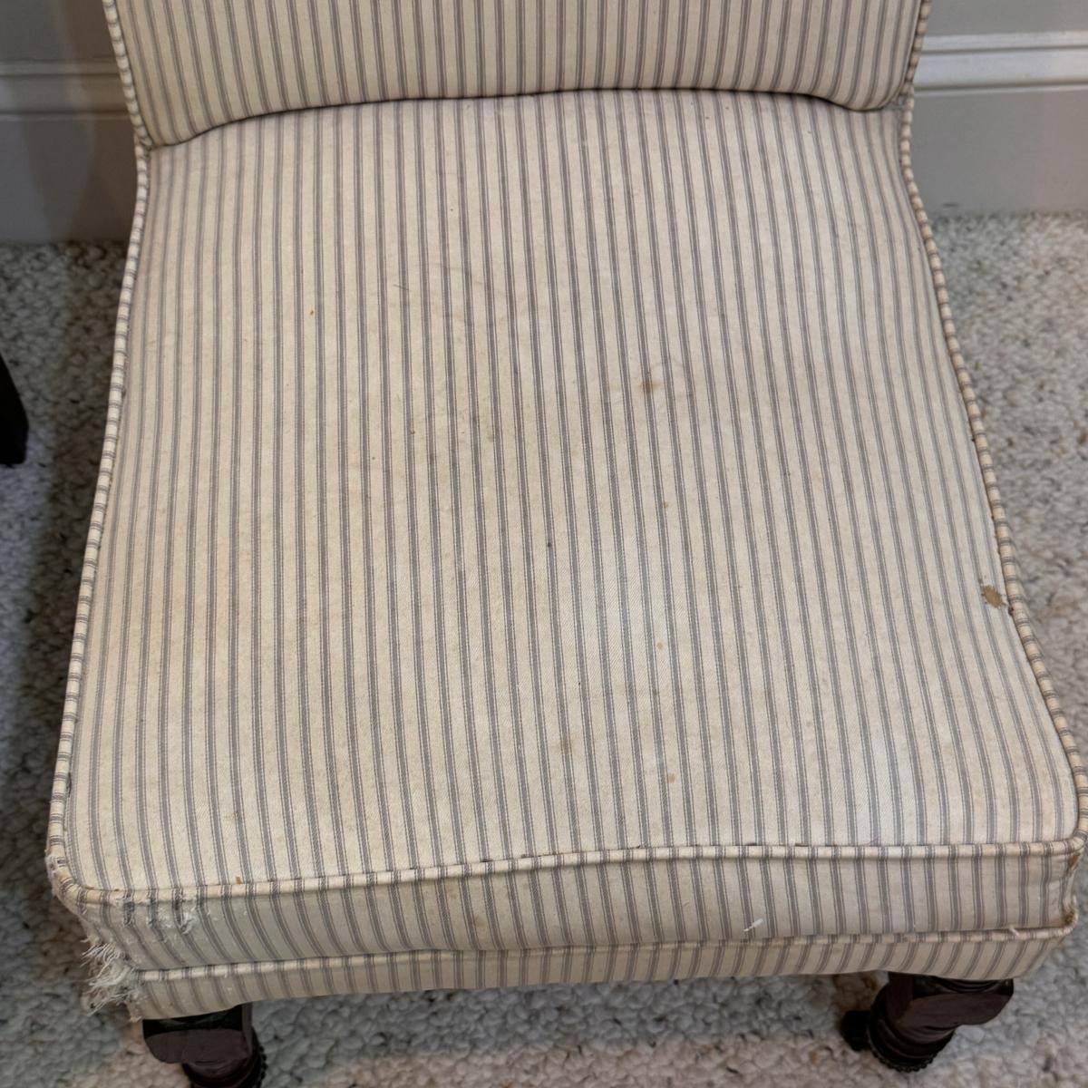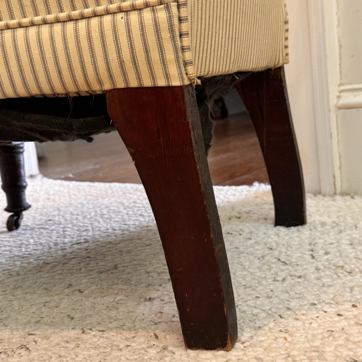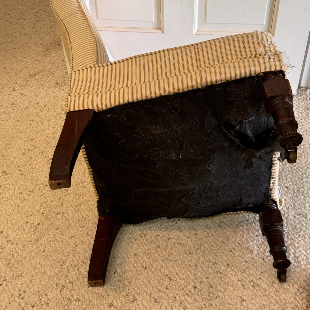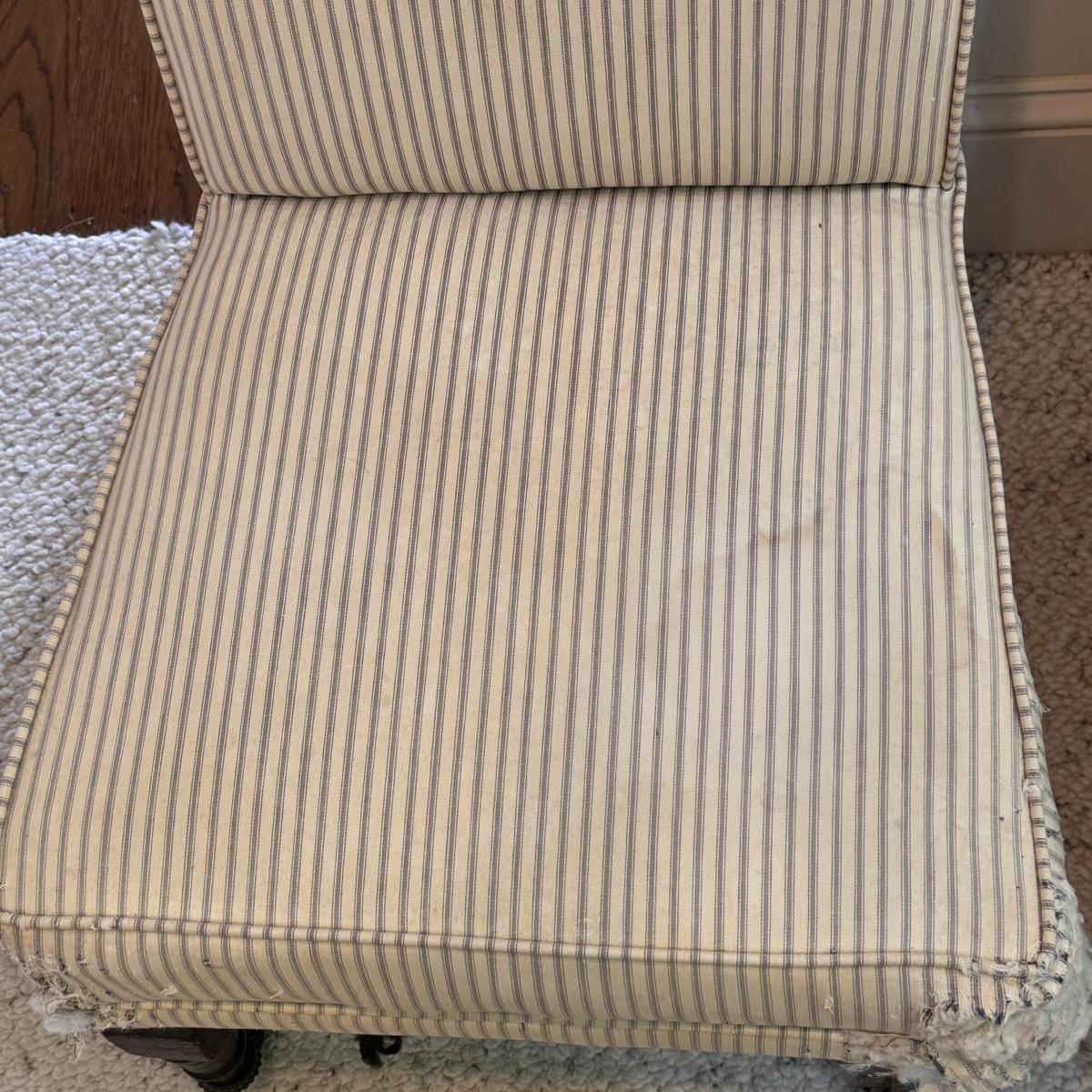 This lot includes two vintage slipper chairs. The seller claims the are from The Piedmont Inn. Due to their age, they are well worn cosmetically but appear to be sturdy structurally. Please see pictures included. The front feet on the chairs are on wheels. The legs are all wooden. The chairs individually measure 19” x 22” x 34”H. Local pickup only.