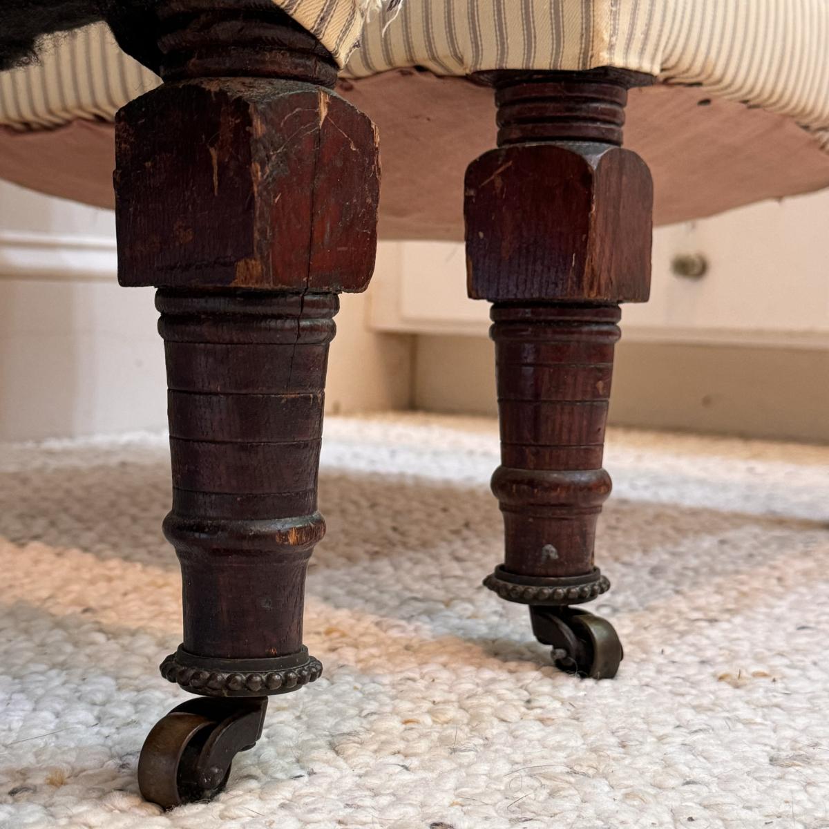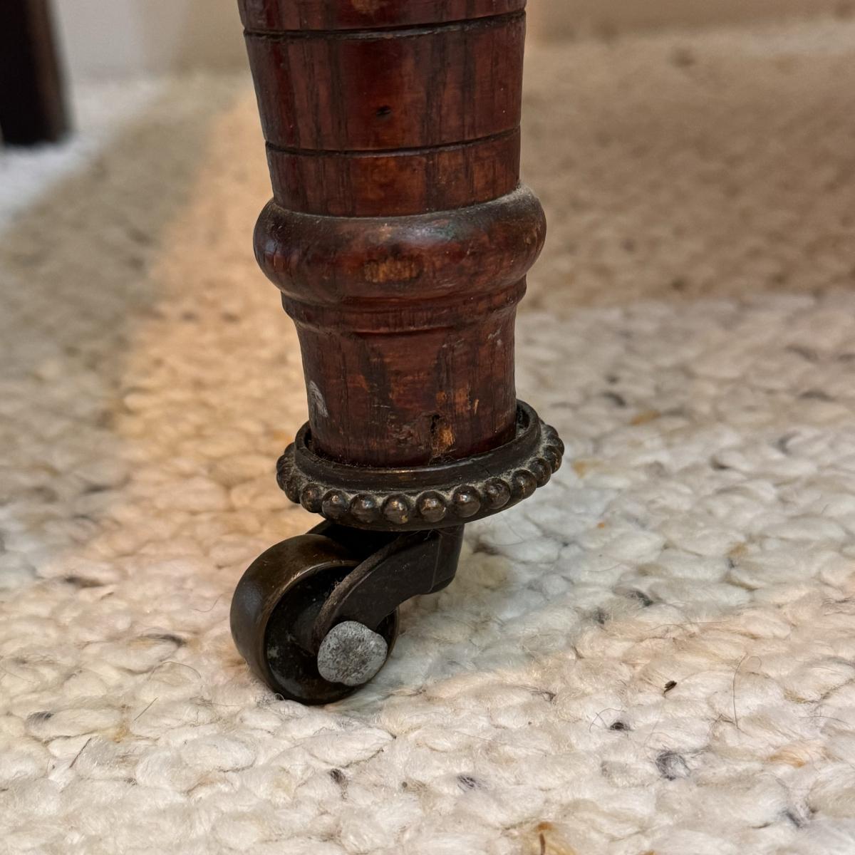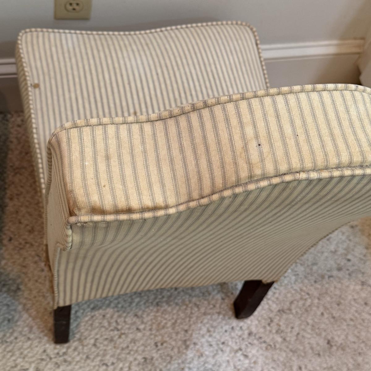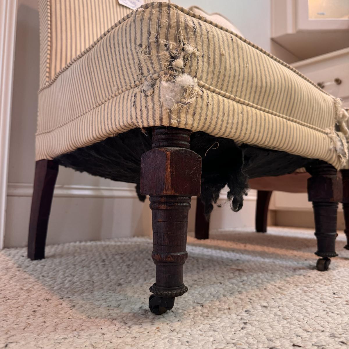 This lot includes two vintage slipper chairs. The seller claims the are from The Piedmont Inn. Due to their age, they are well worn cosmetically but appear to be sturdy structurally. Please see pictures included. The front feet on the chairs are on wheels. The legs are all wooden. The chairs individually measure 19” x 22” x 34”H. Local pickup only.