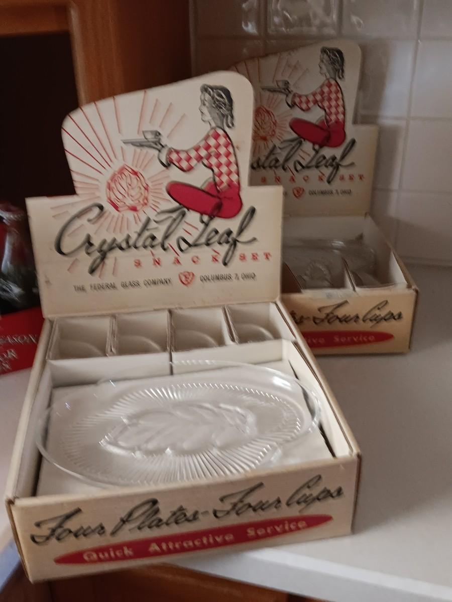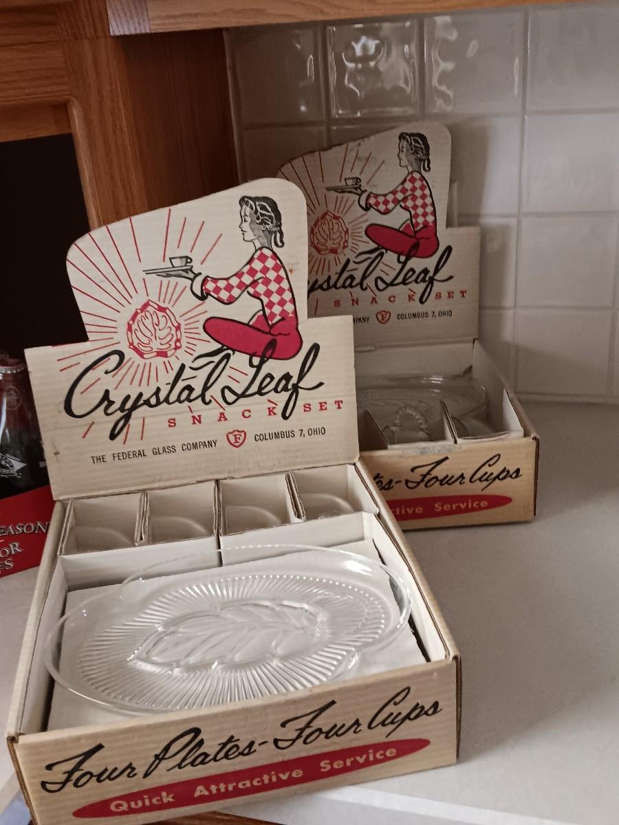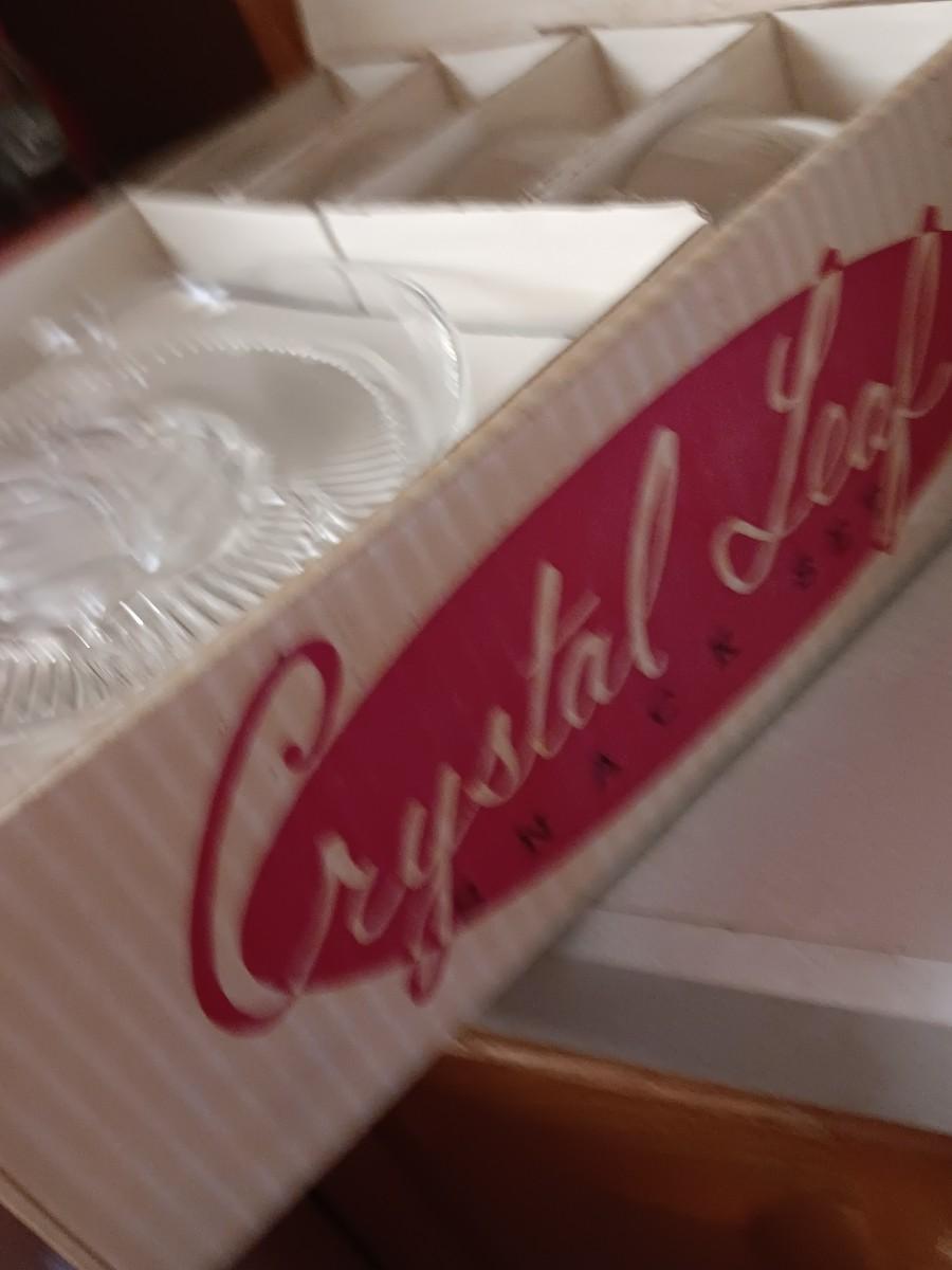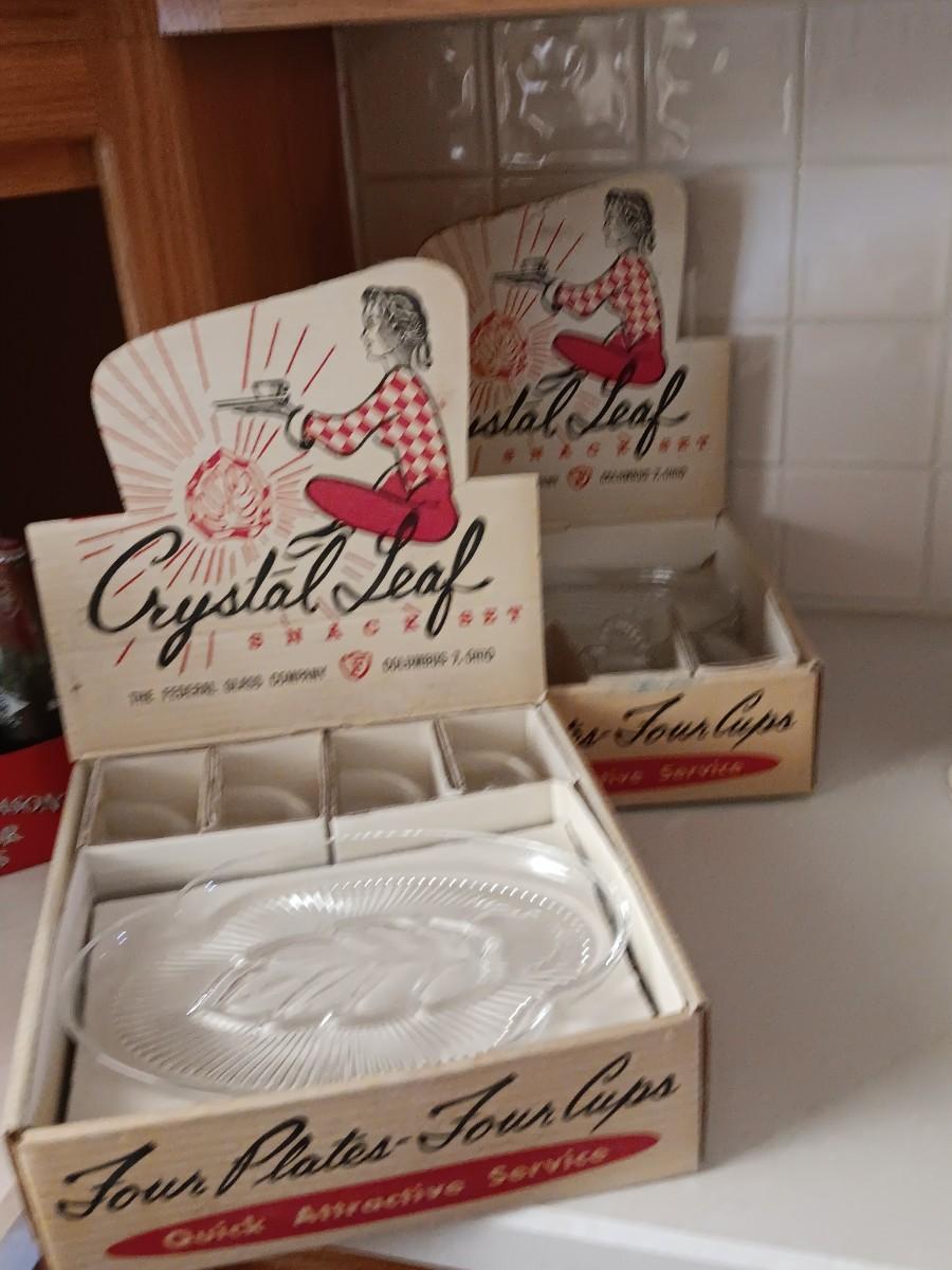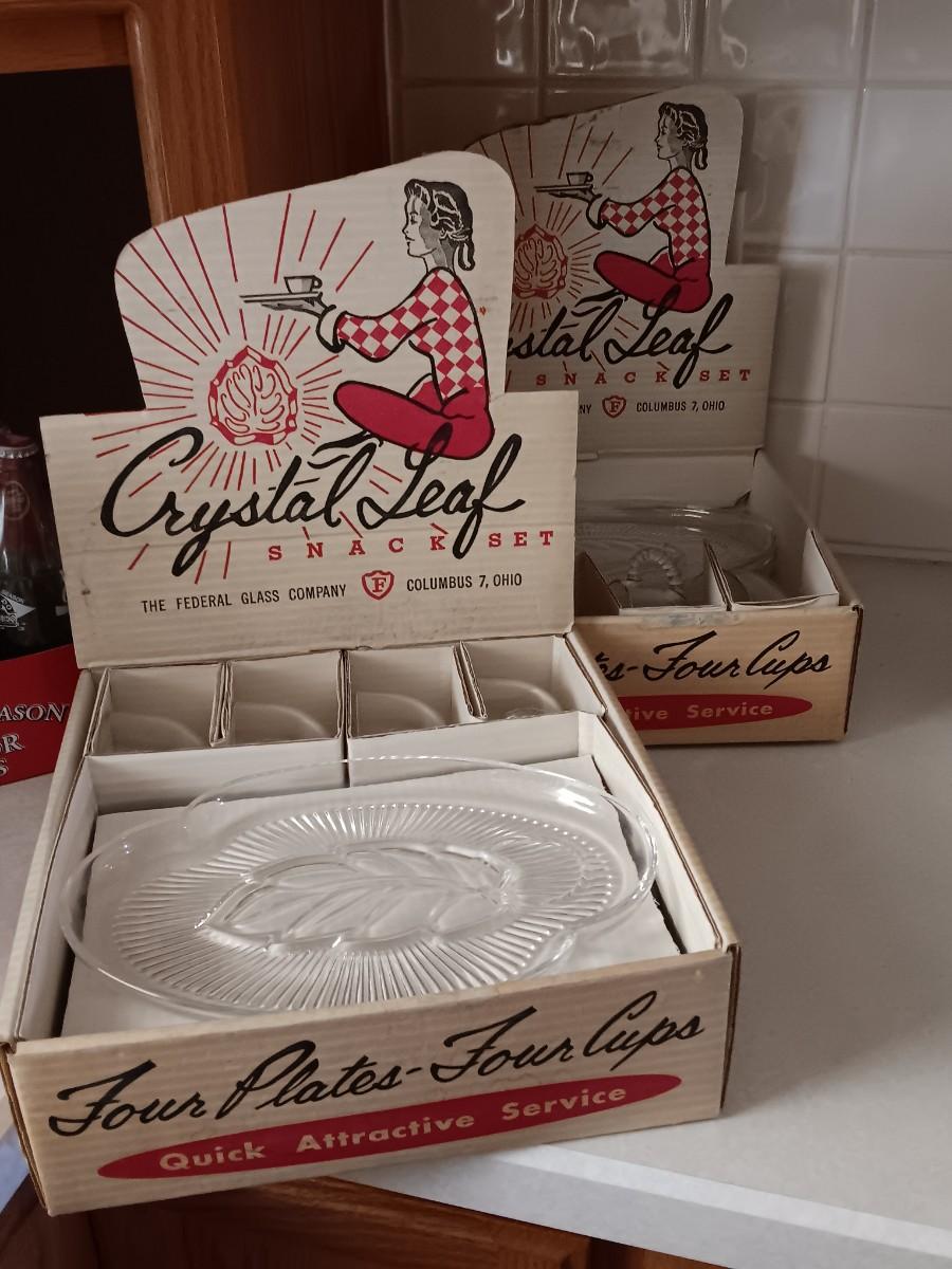 TWO VINTAGE CRYSTAL LEAF SNACK PLATES WITH MUGS