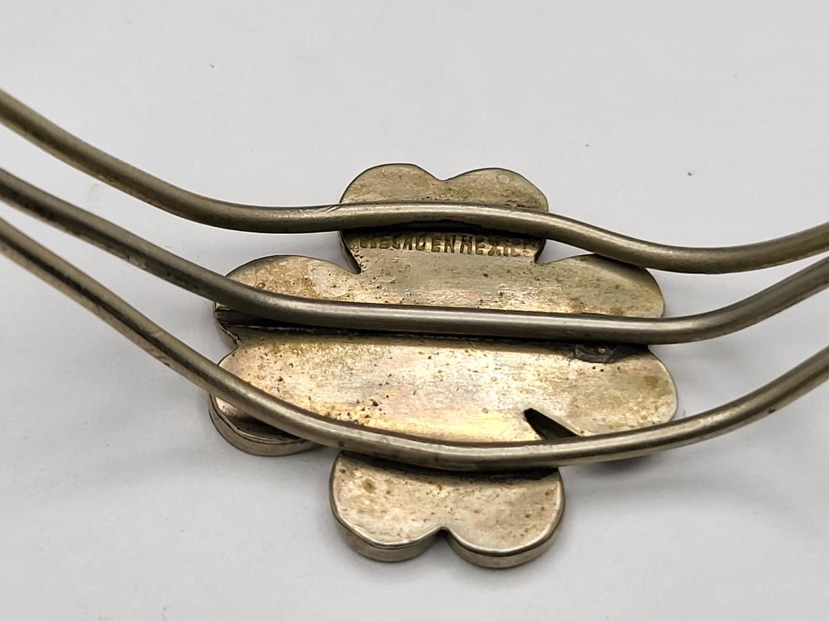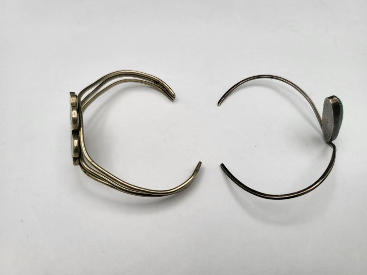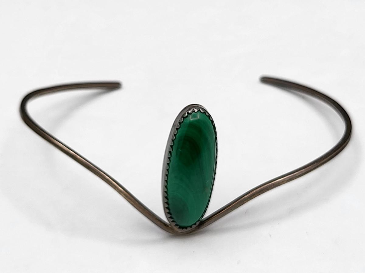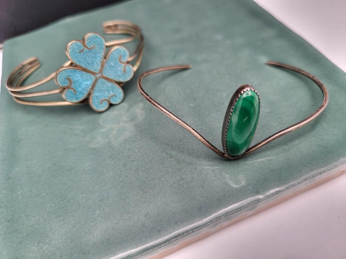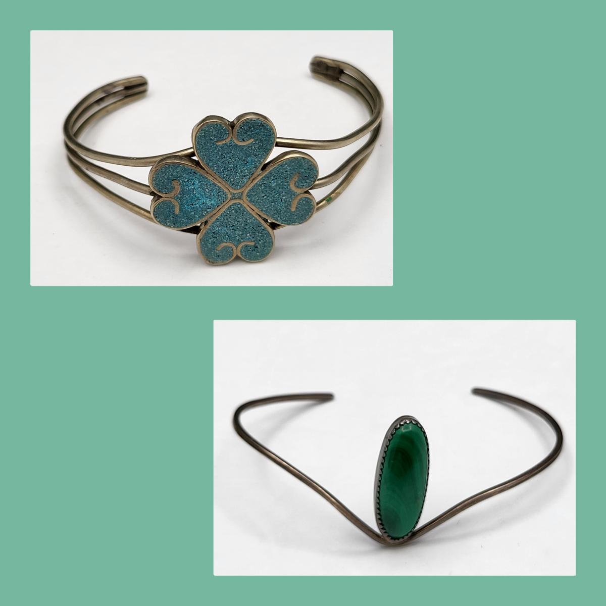 Two vintage bracelets. Oval Malachite stone, thin cuff, sterling silver bracelet. Hearts & four leaf clover cuff with crushed turquoise, made in Mexico.