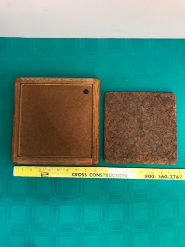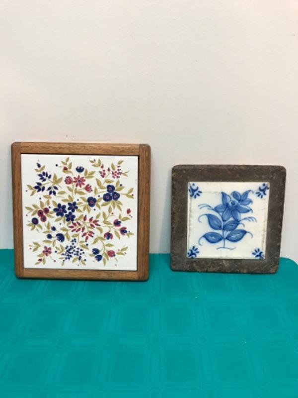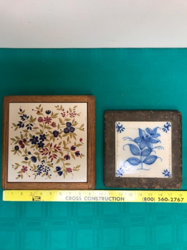 Two vintage cutting boards with floral motifs. The smaller one has a cork base, while the larger one is set in a wooden frame.