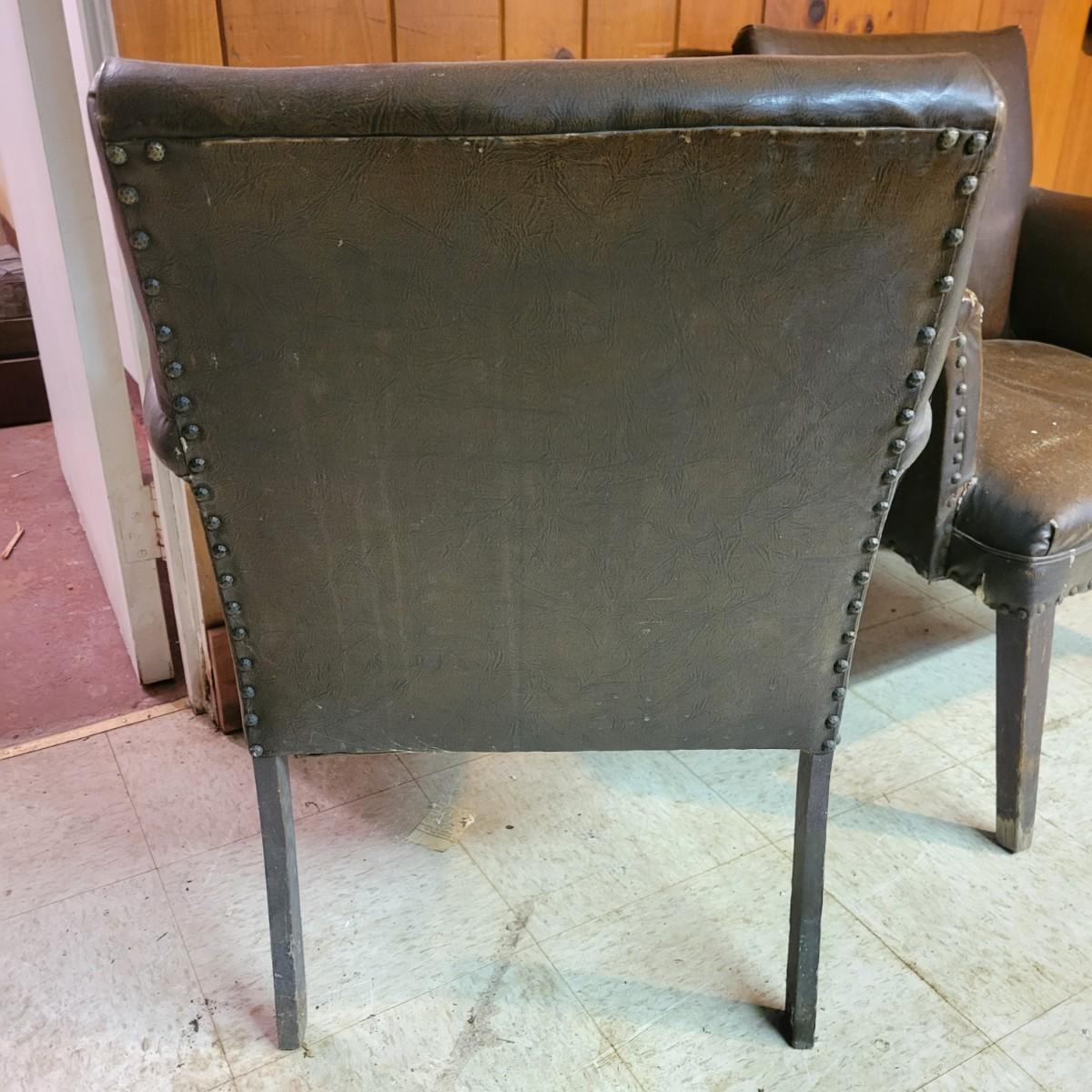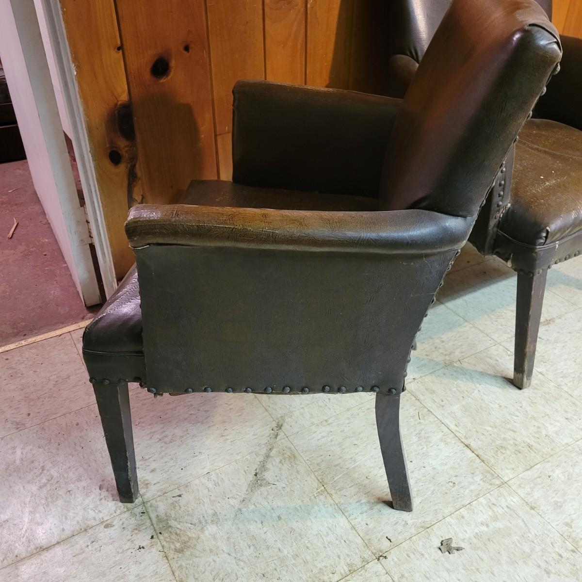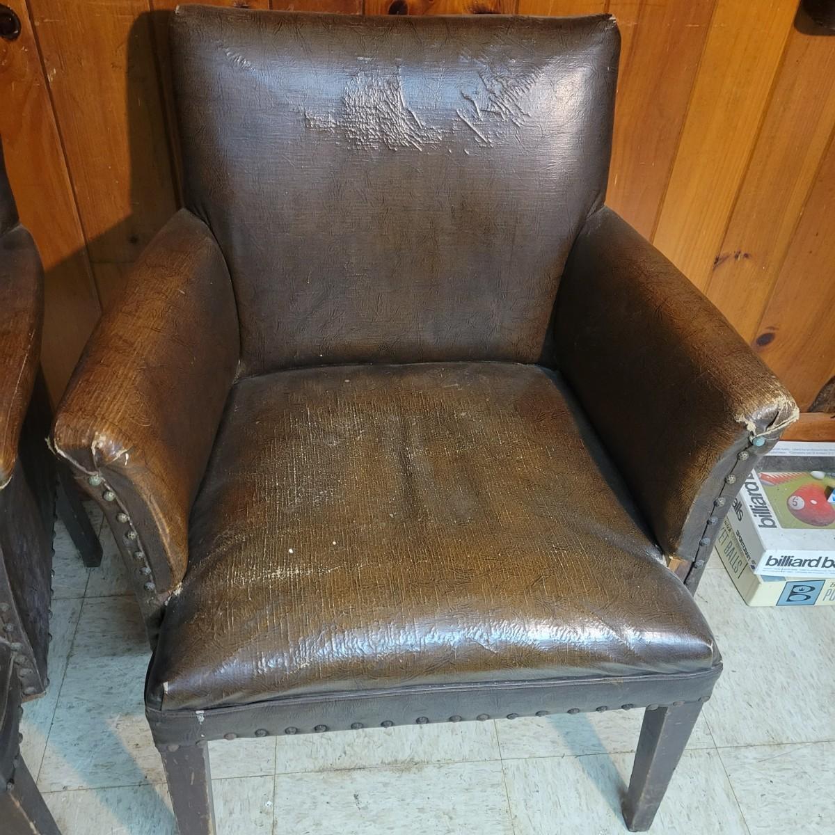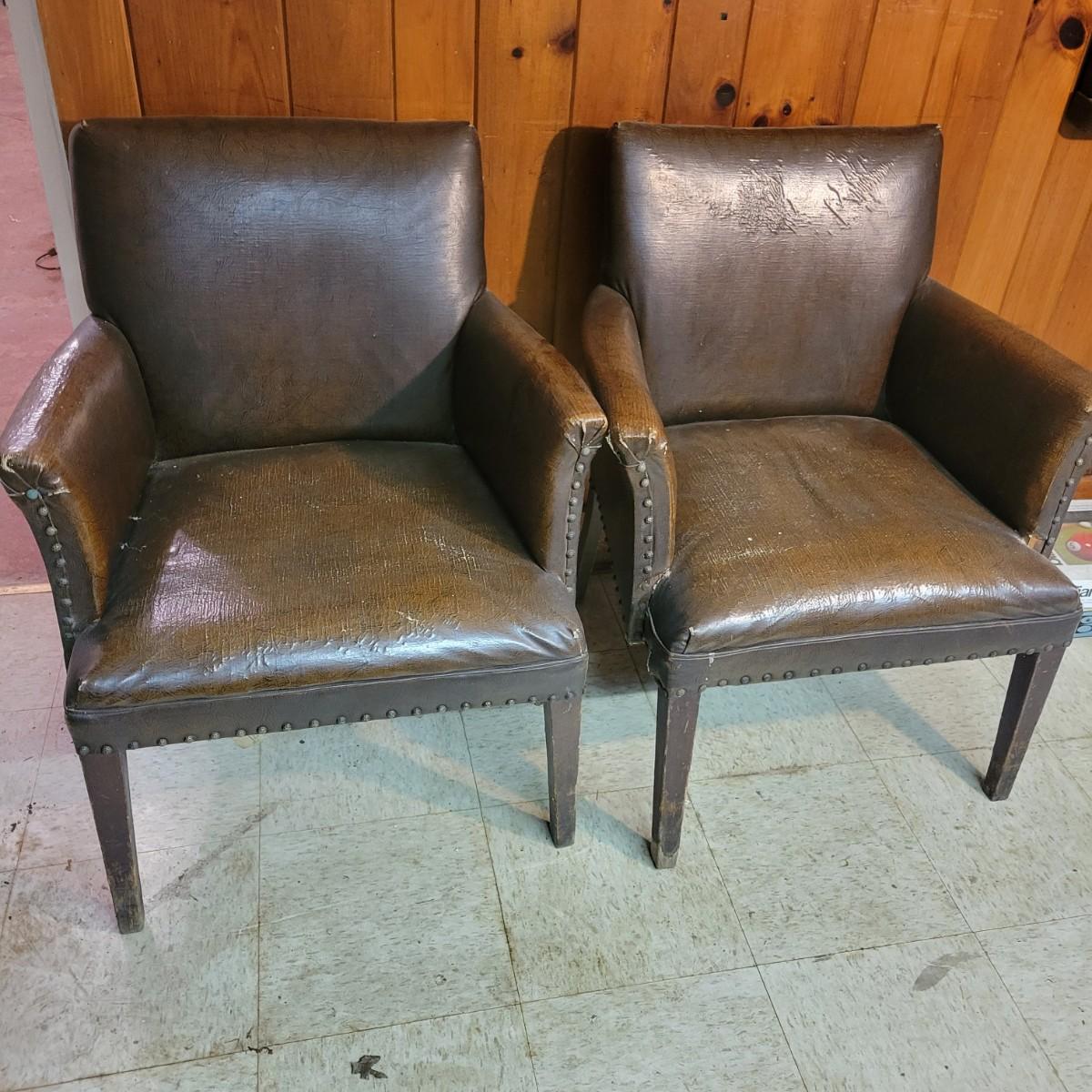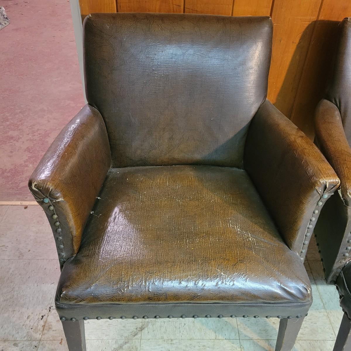 A pair of vintage faux leather chairs with brass upholstery tacks that is in fair condition. Upholstery is cracking and a little frayed. Chairs measure approximately 26" x 22" x 33". Seat height is approximately 16.5" Local pickup only