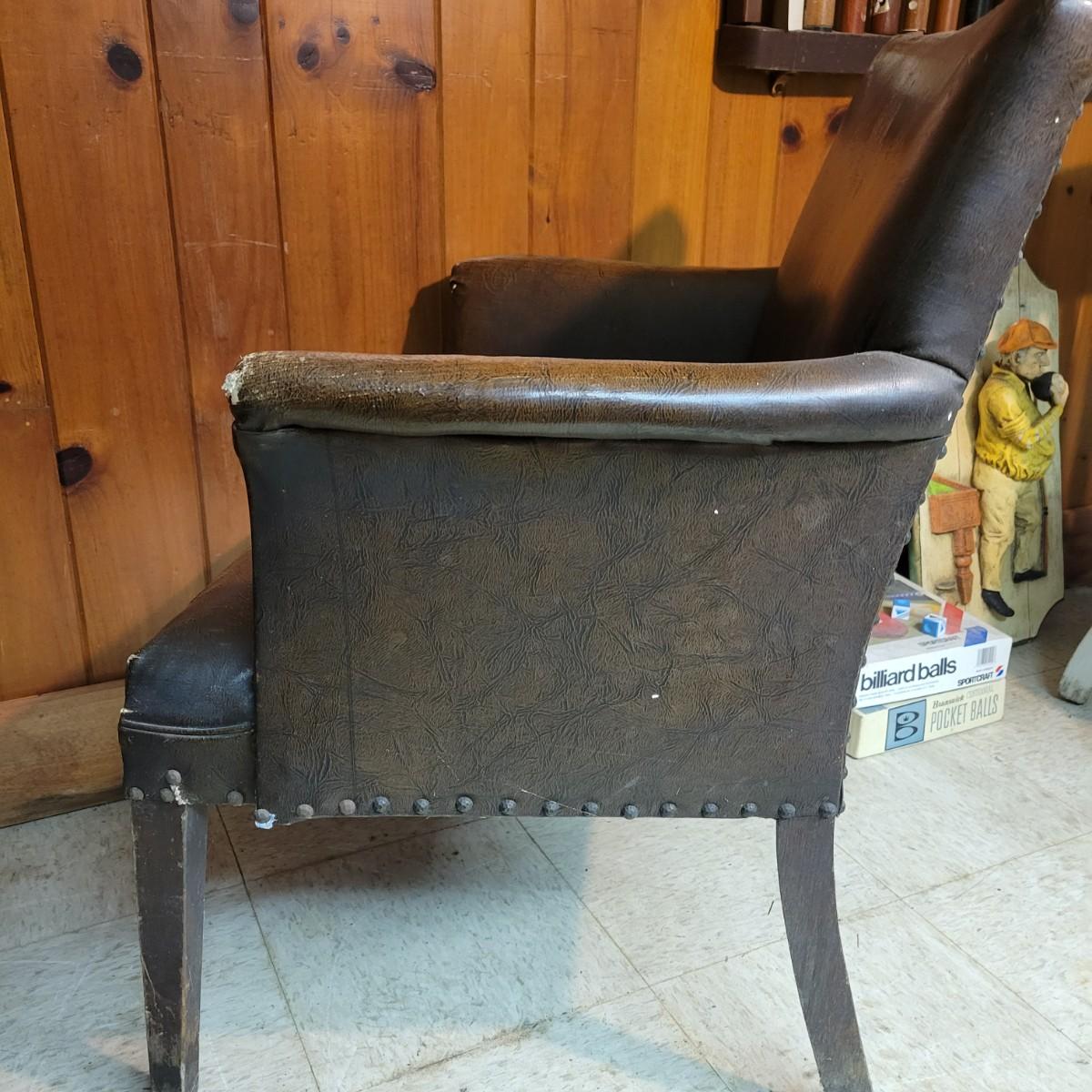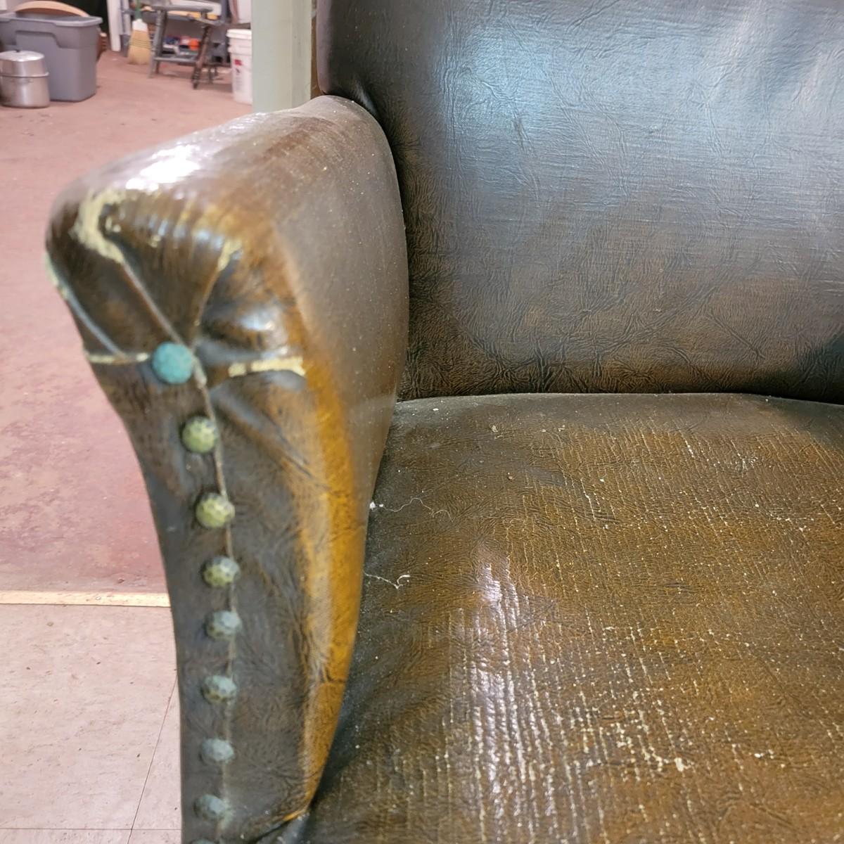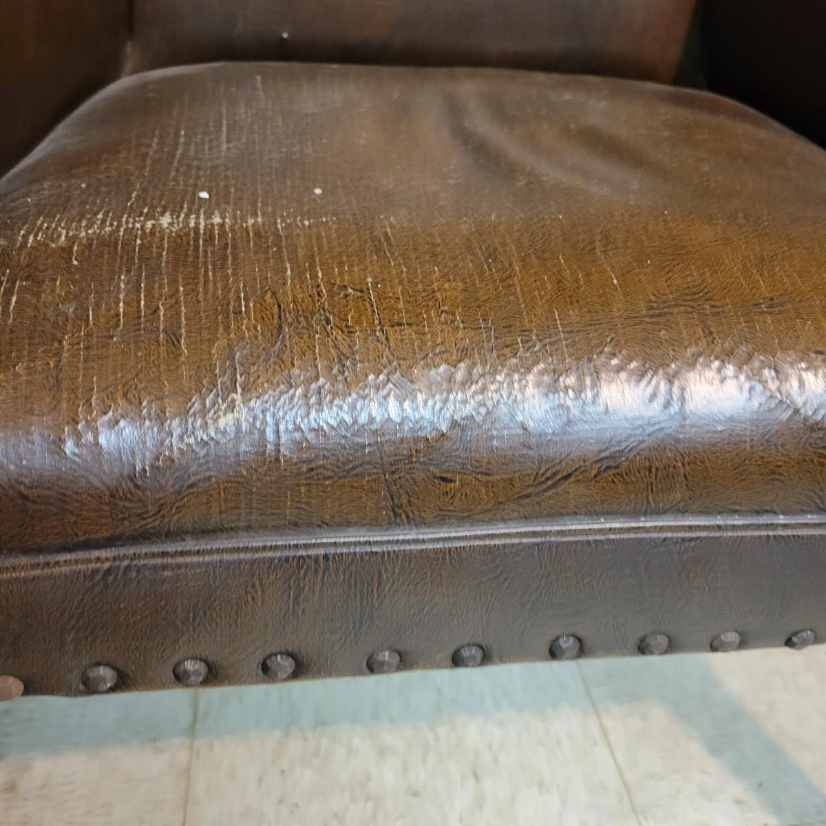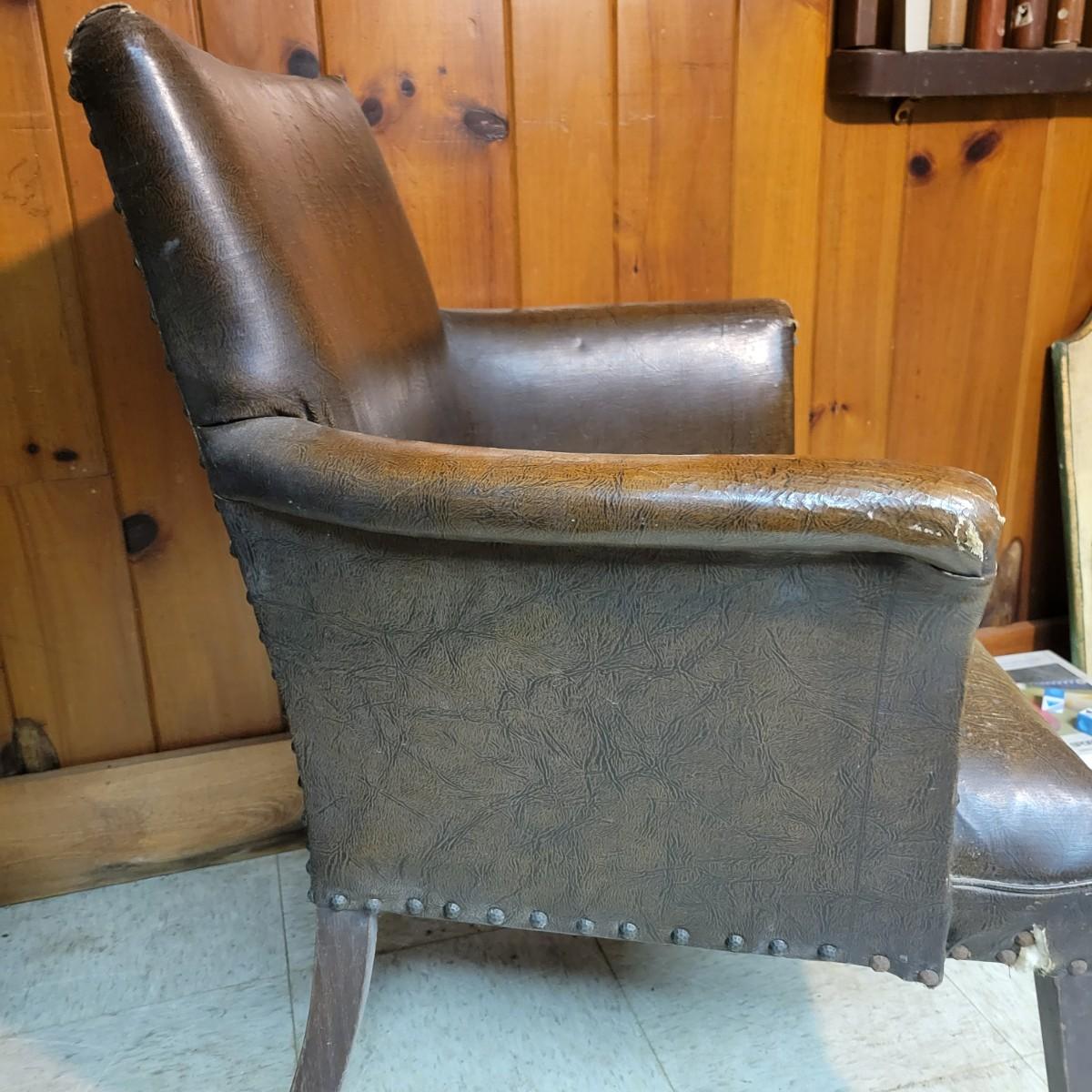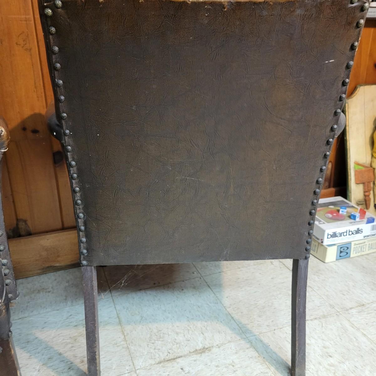 A pair of vintage faux leather chairs with brass upholstery tacks that is in fair condition. Upholstery is cracking and a little frayed. Chairs measure approximately 26" x 22" x 33". Seat height is approximately 16.5" Local pickup only