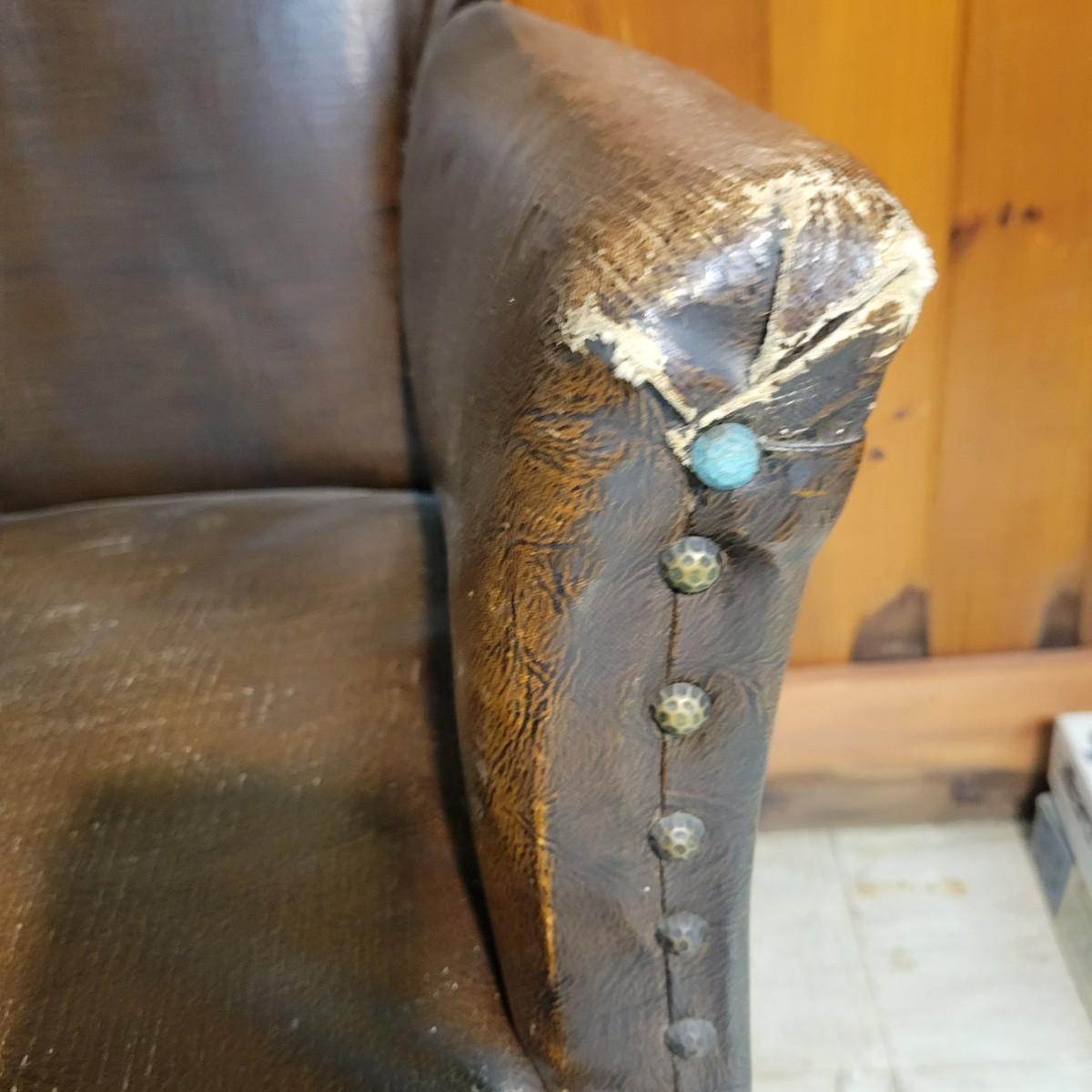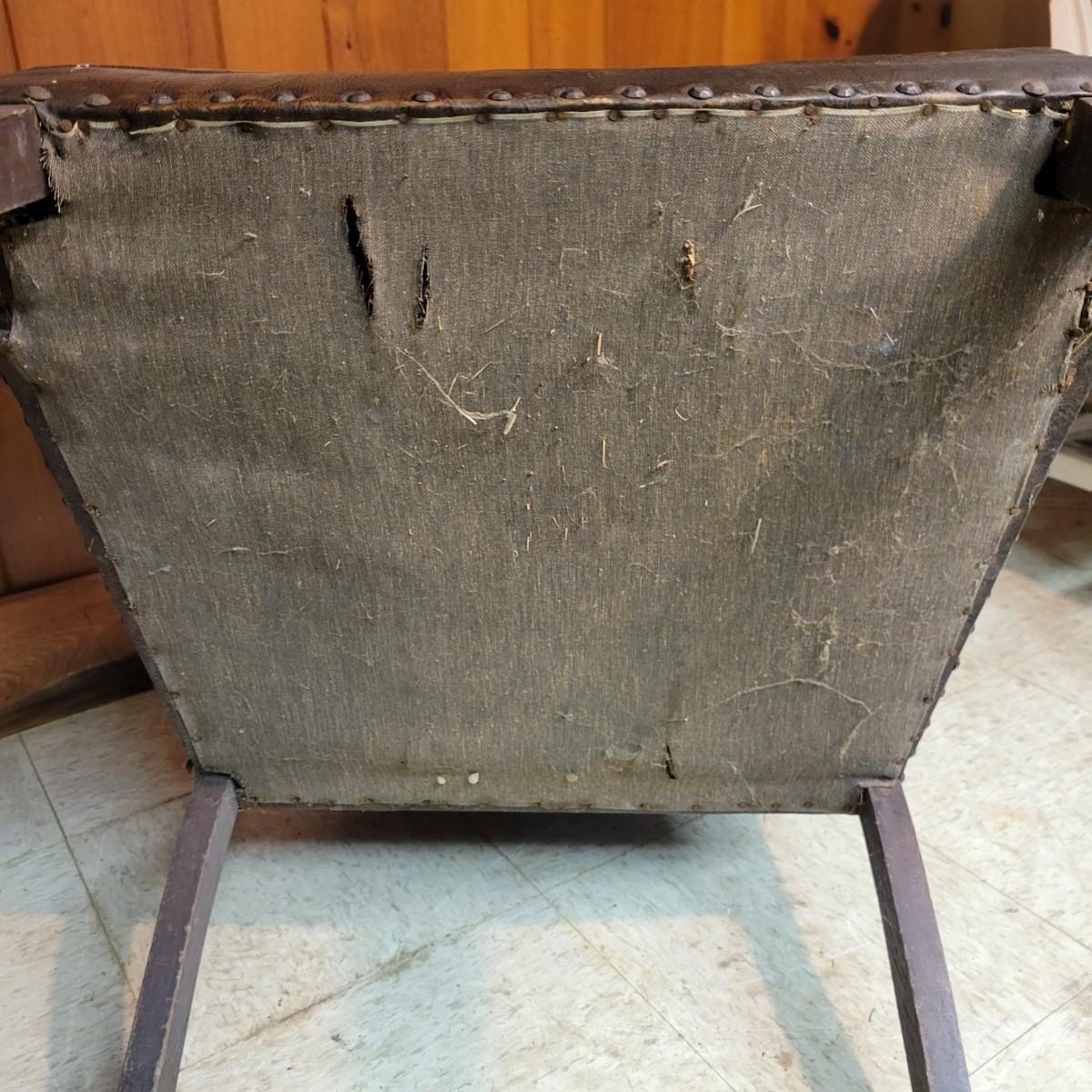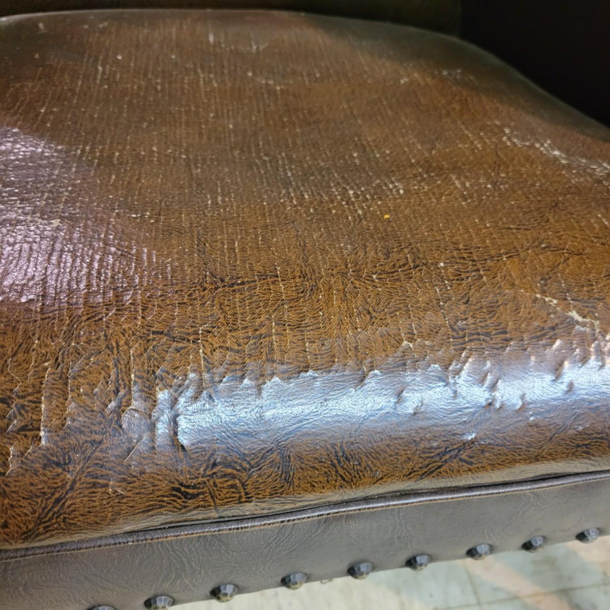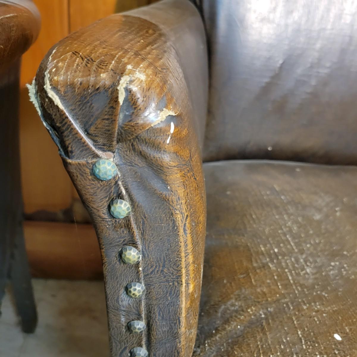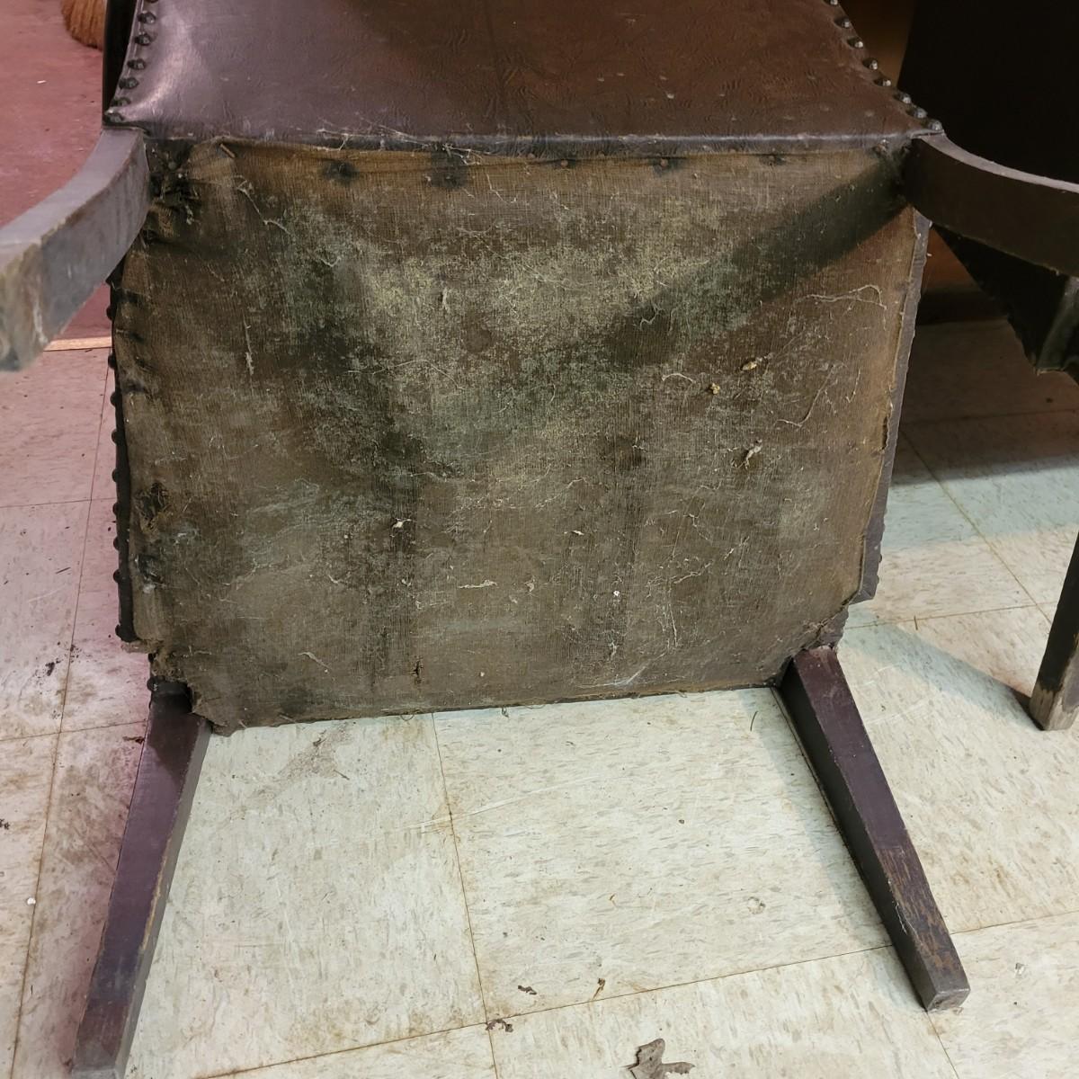 A pair of vintage faux leather chairs with brass upholstery tacks that is in fair condition. Upholstery is cracking and a little frayed. Chairs measure approximately 26" x 22" x 33". Seat height is approximately 16.5" Local pickup only