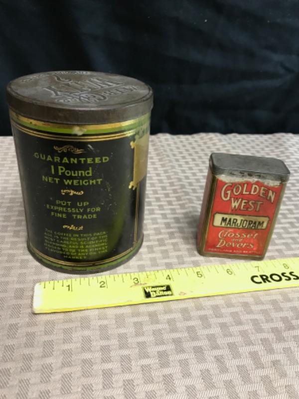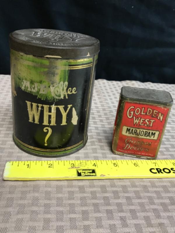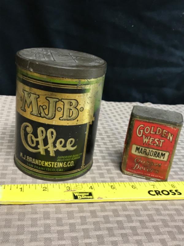 Two Vintage Tin Foodstuffs Containers: MJB Coffee & Golden West Majoram Spice