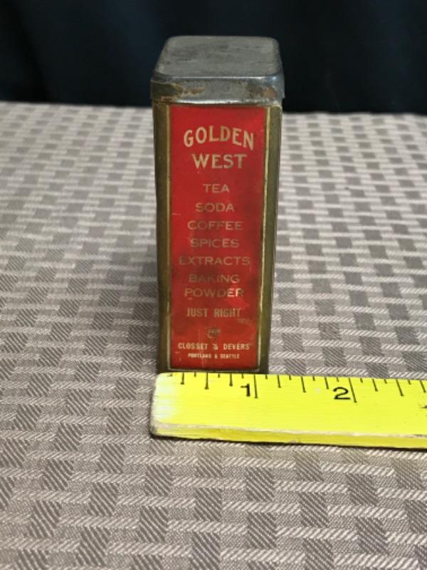 Action consists of one Golden West Grand spice container, and one MJB brand coffee can. Not recommended for foodstuff storage; being sold as a collectible only. The MJB coffee can measures 3 7/8” in diameter by 5 1/4“ in height. The spice container measures 1 1/8“ length, 2 1/4” in width, 3 1/4” in height.