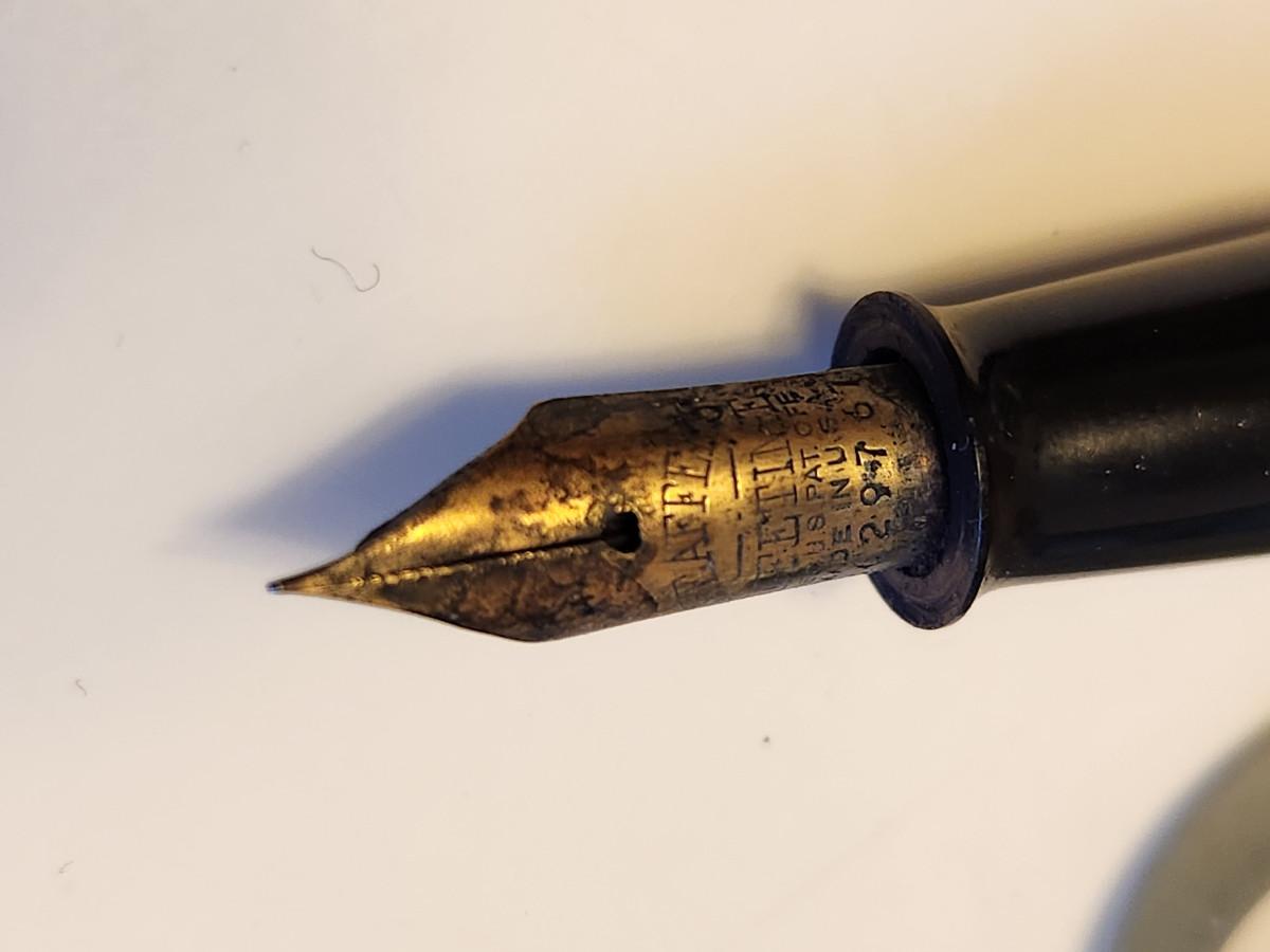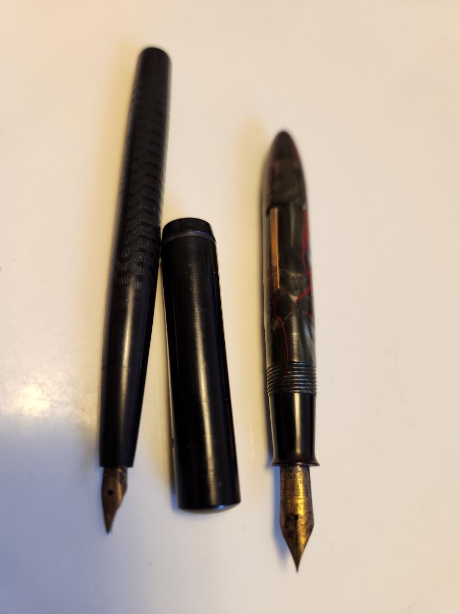 This auction lot is for Two Vintage Fountain Pens. The green pen is a Schaeffer with no top. The black pen shows no maker but does sport a 14K gold writing tip. Both for one bid - the highest and best.