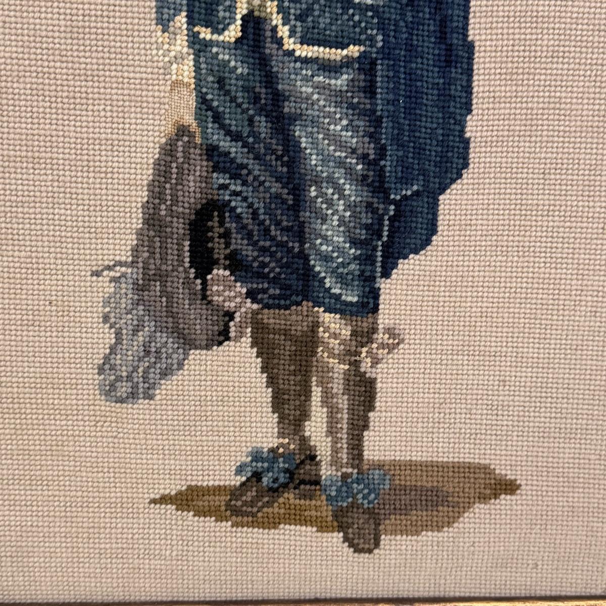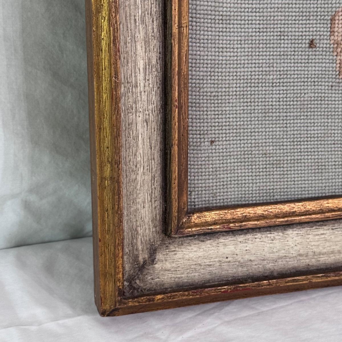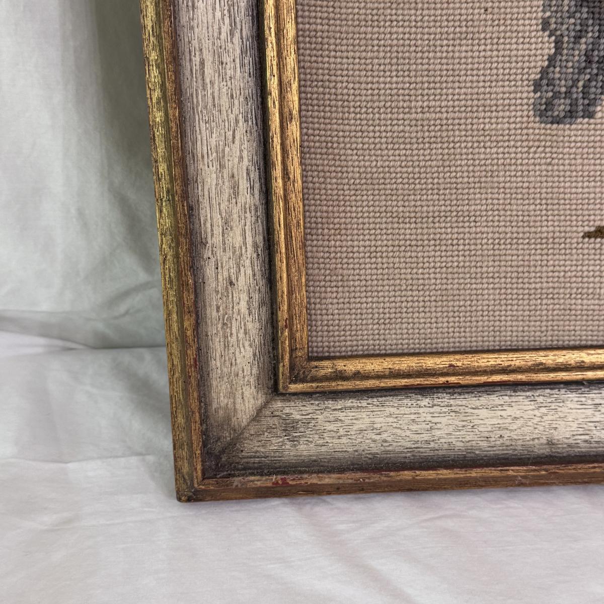 Lot includes two vintage frames needlepoints of well known works Pinkie and Blue Boy by Gainsborough. Both pieces are highlighted in a wooden frame that has been painted silver and gold. The needlepoint of Blue Boy has a string attached to the back for hanging purposes. The frames individually measure 20” x 24”H. Shipping available.