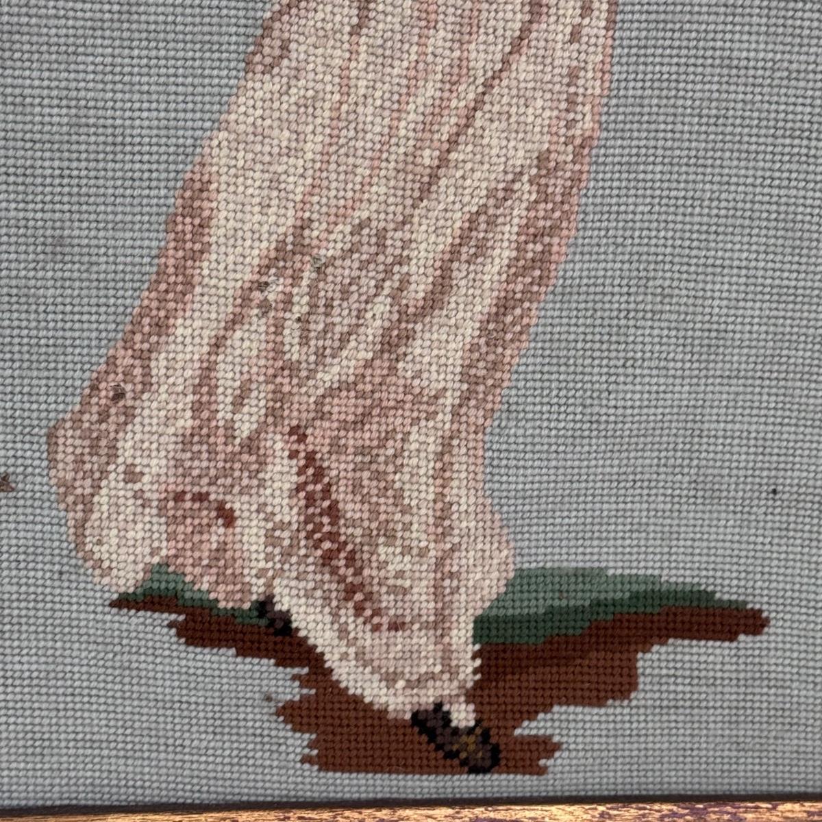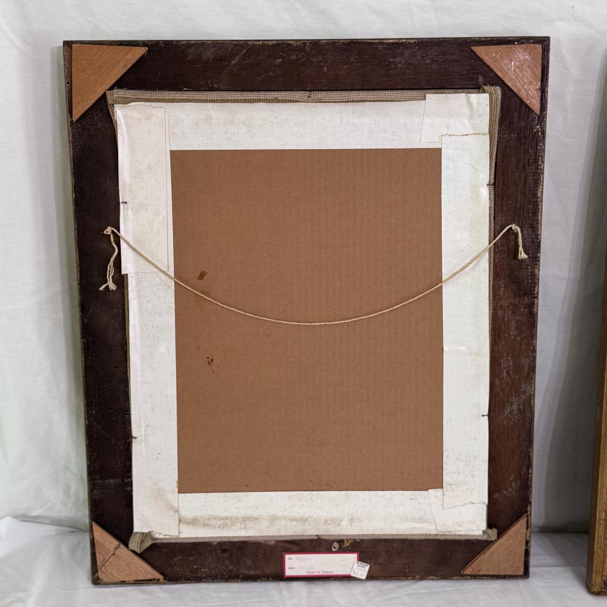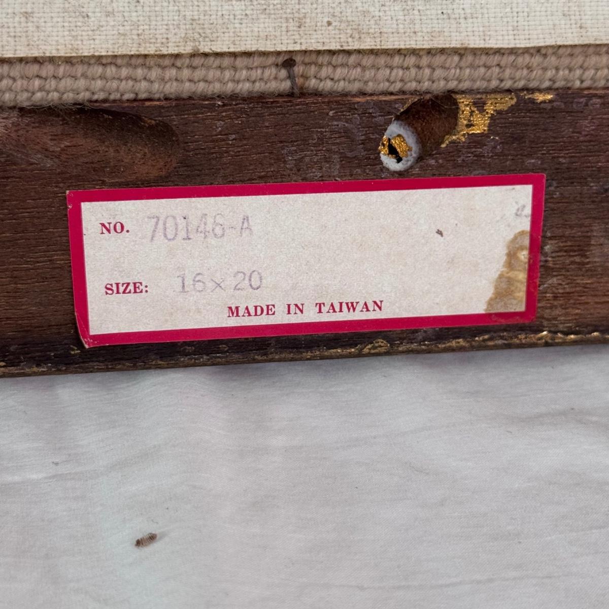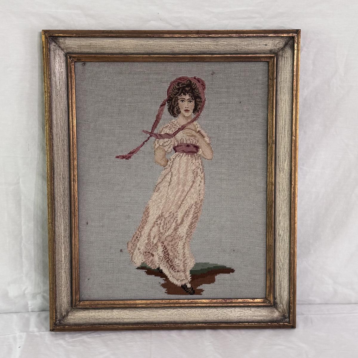Lot includes two vintage frames needlepoints of well known works Pinkie and Blue Boy by Gainsborough. Both pieces are highlighted in a wooden frame that has been painted silver and gold. The needlepoint of Blue Boy has a string attached to the back for hanging purposes. The frames individually measure 20” x 24”H. Shipping available.