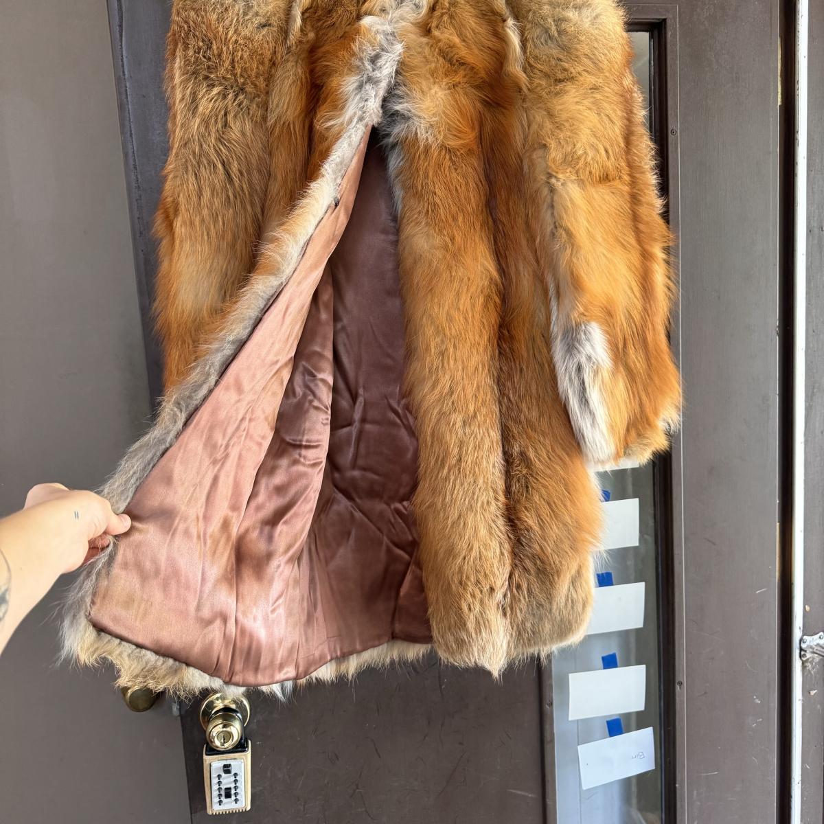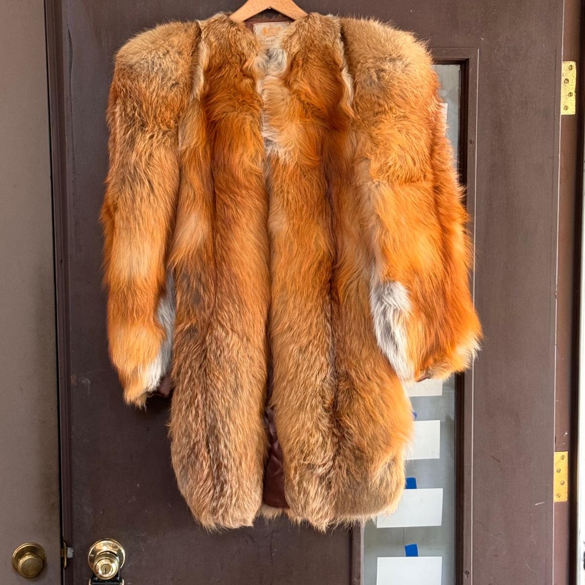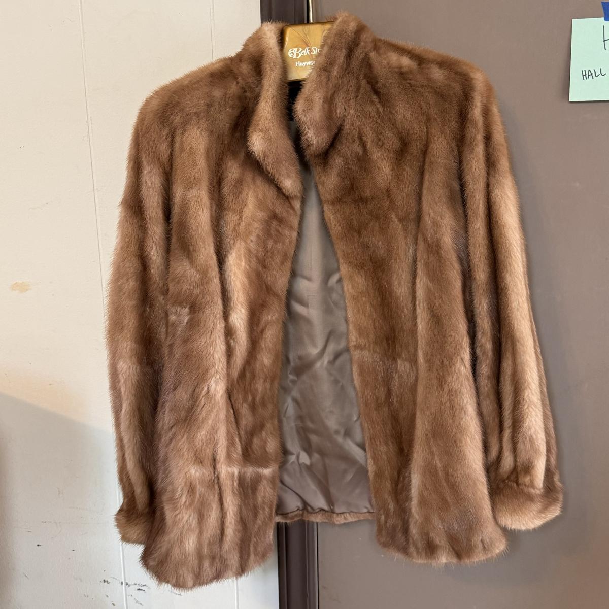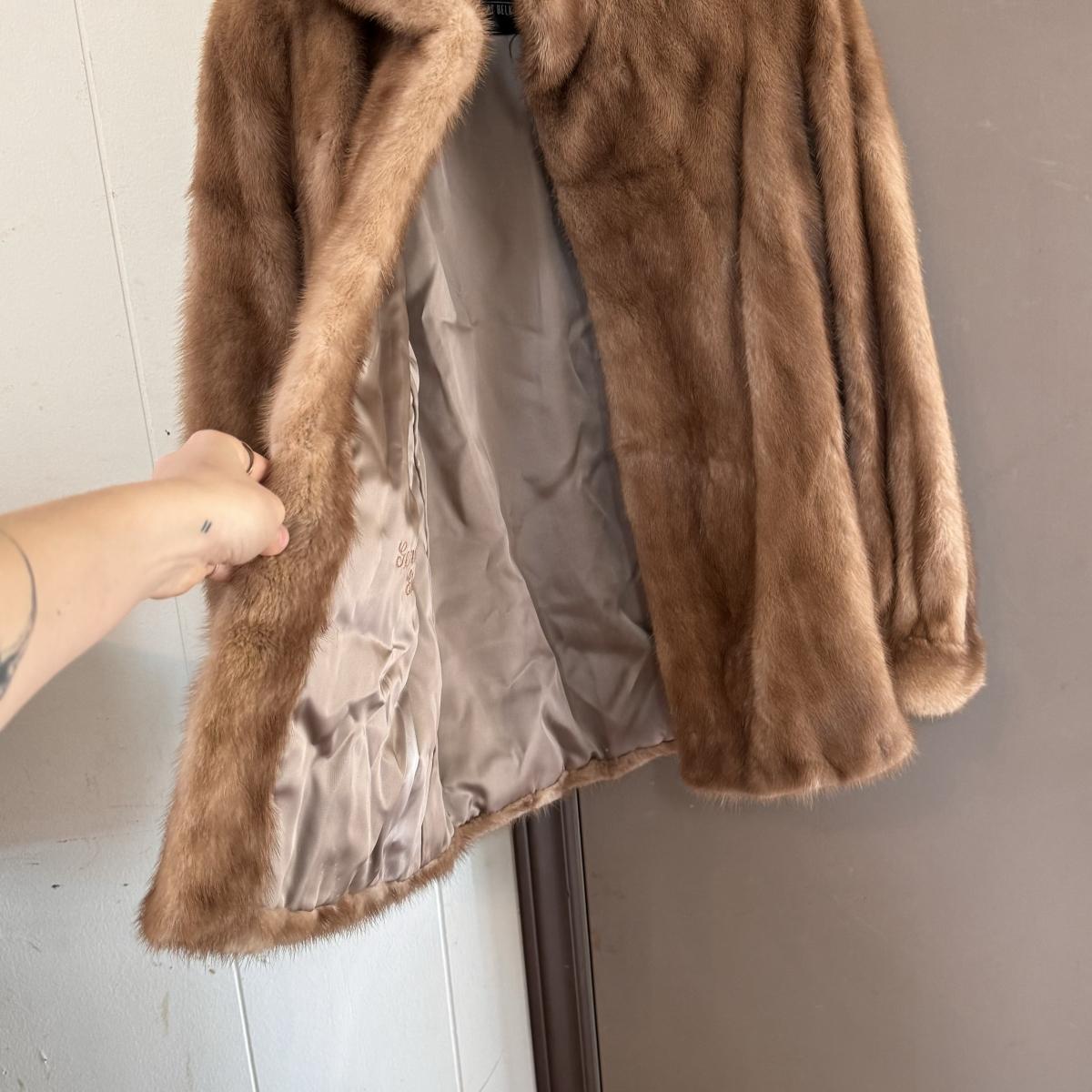 This lot includes one vintage fur coat from Enman’s Asheville, NC and another from Evans Furs at Belk. The first coat pictured has very broad shoulders. The coat itself measures 23” x 35”H. The second coat pictured has pockets and measures 22” x 29”H. There are no details listed about the fur on either coat. Shipping available.