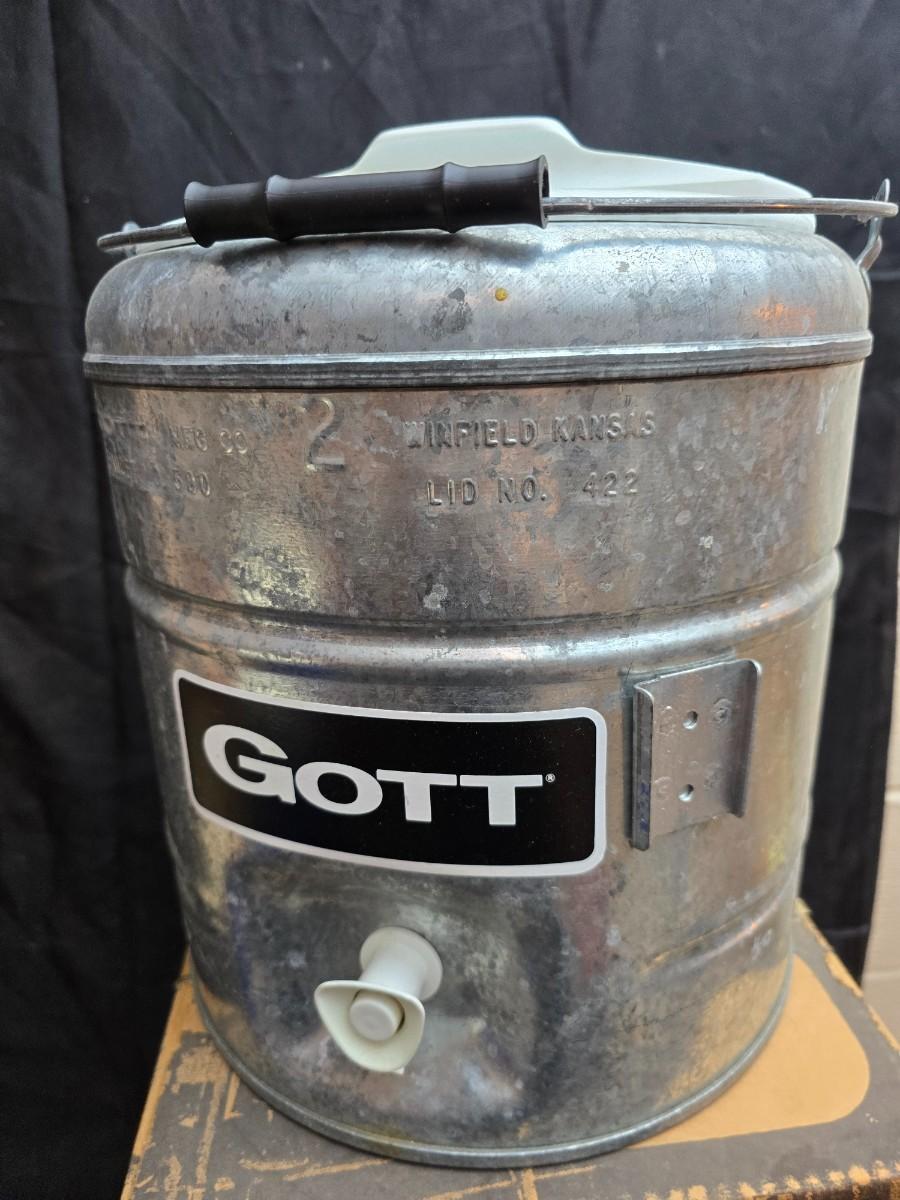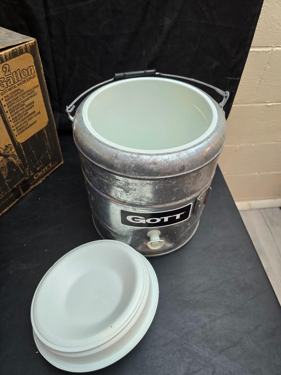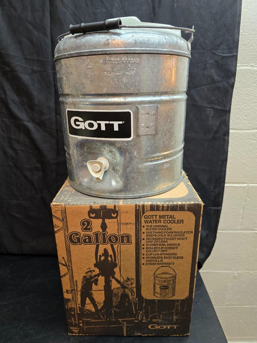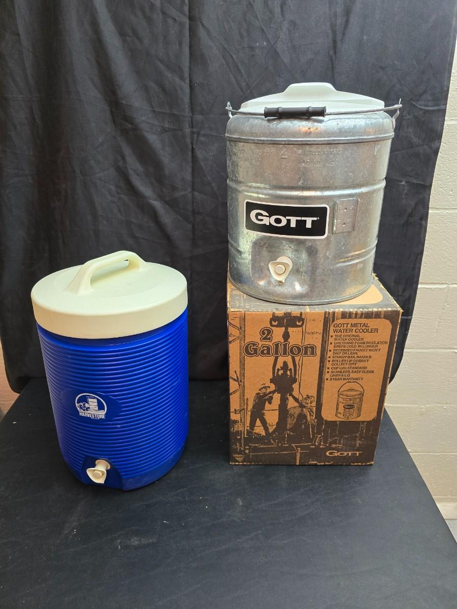 Two vintage Gott water coolers - 2 Gallon metal galvanized water cooler and a 2-gallon Gott blue plastic cooler
