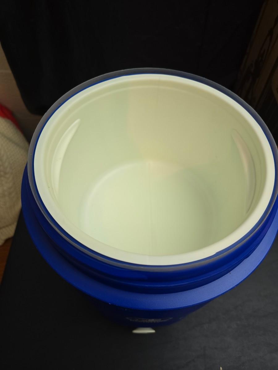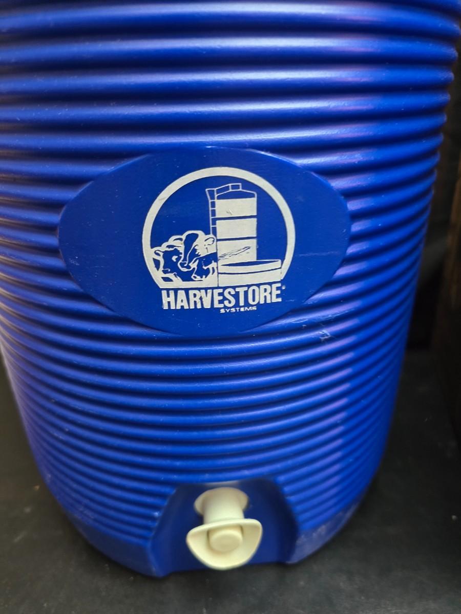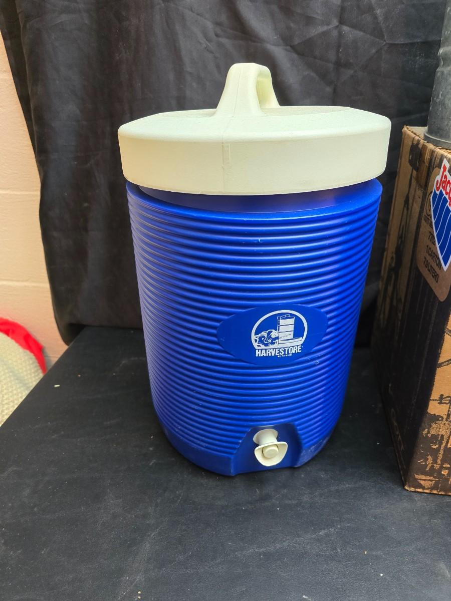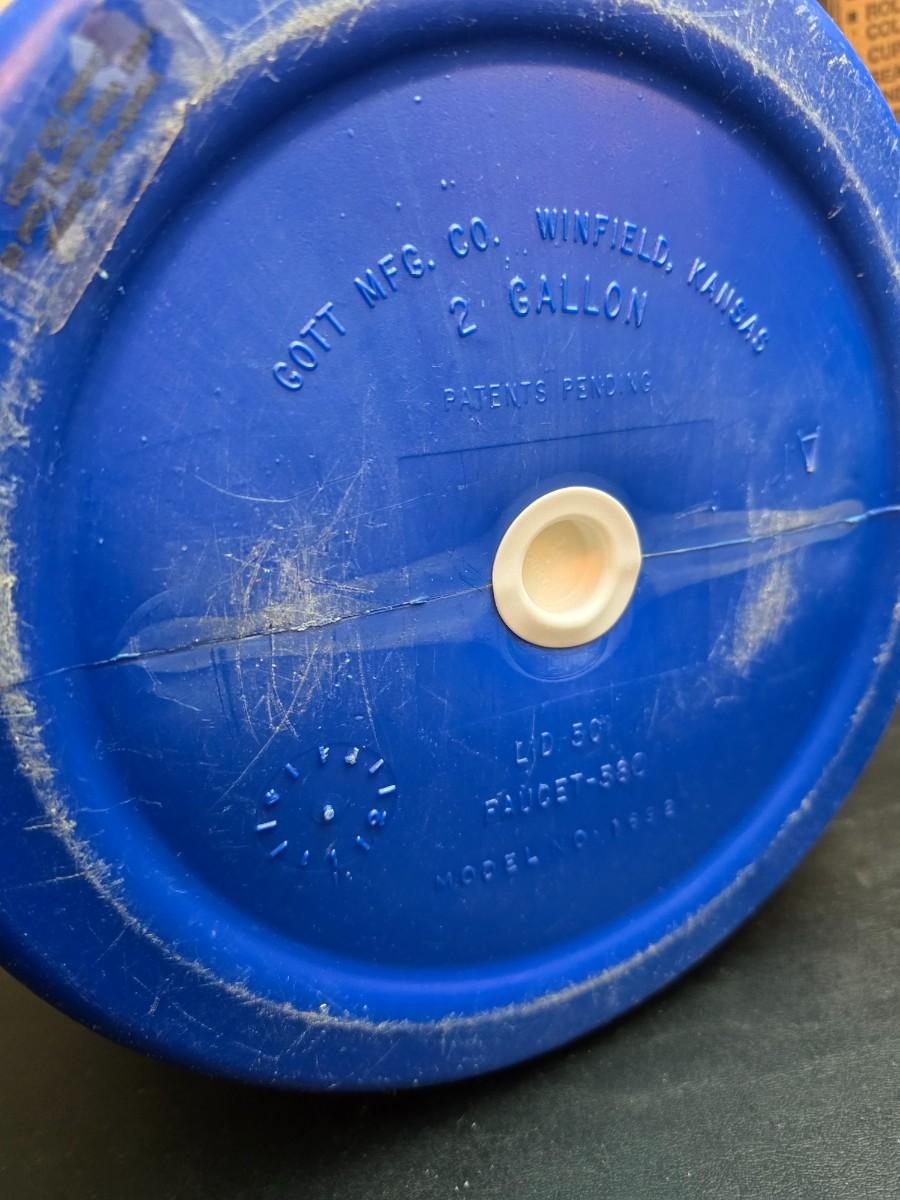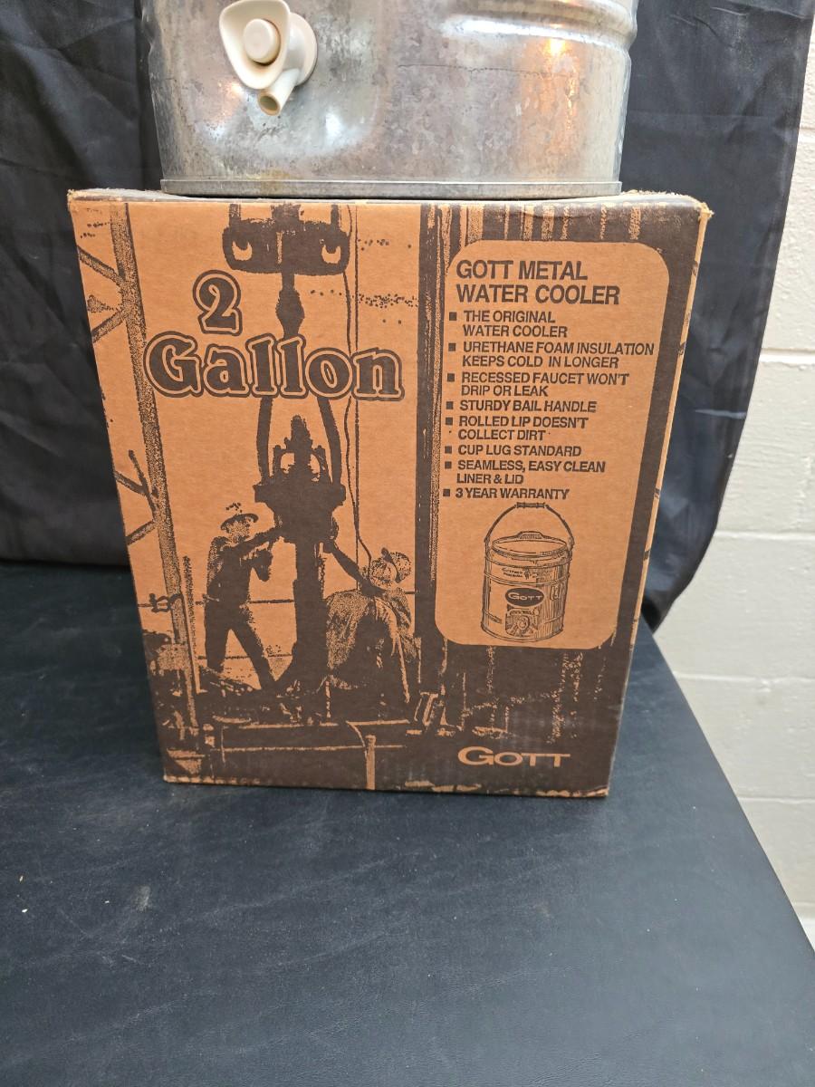 Two vintage Gott water coolers - 2 Gallon metal galvanized water cooler and a 2-gallon Gott blue plastic cooler