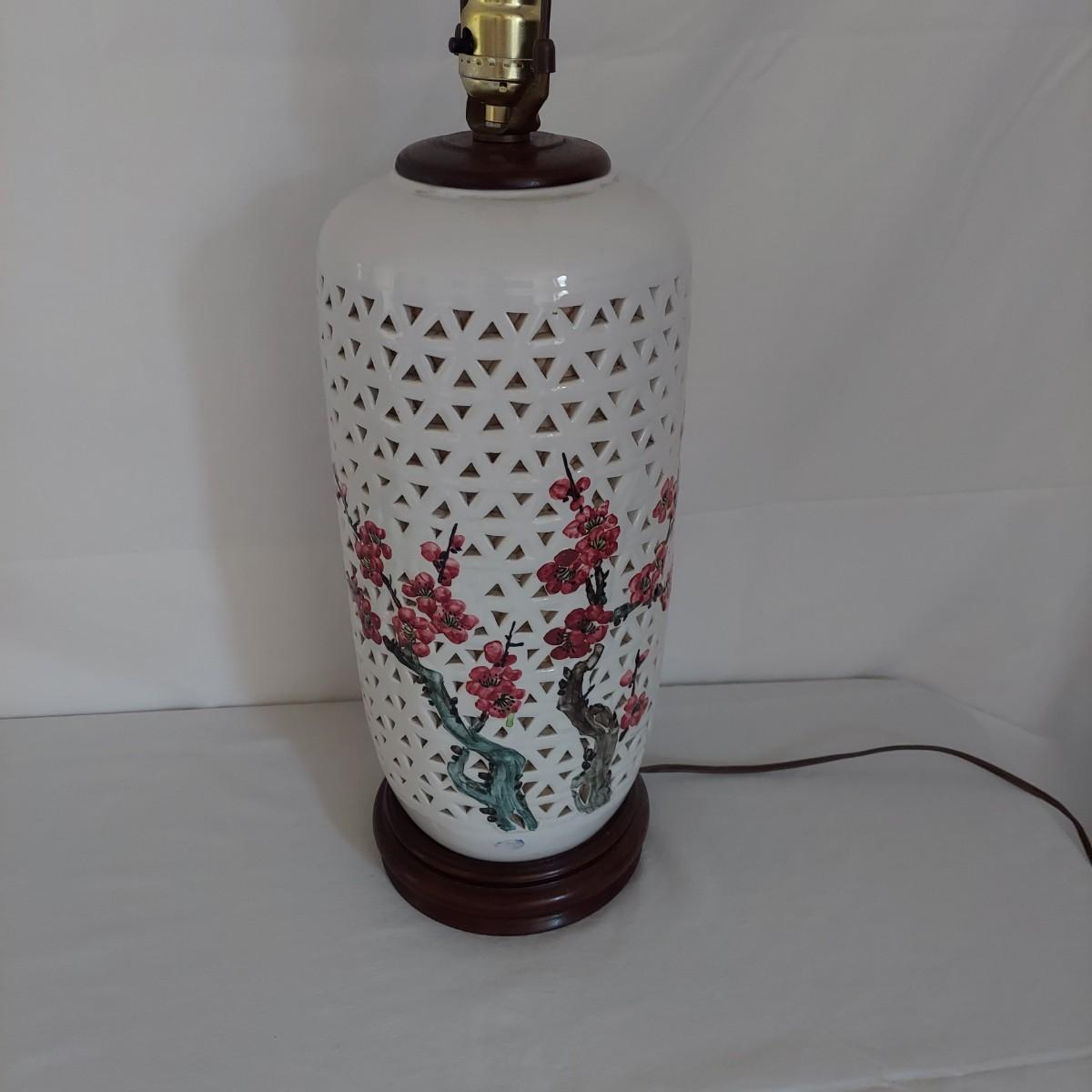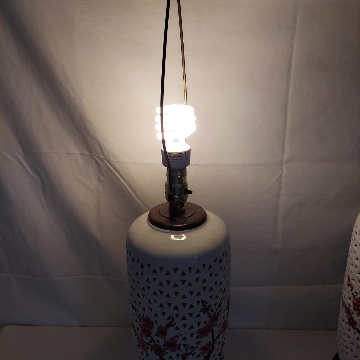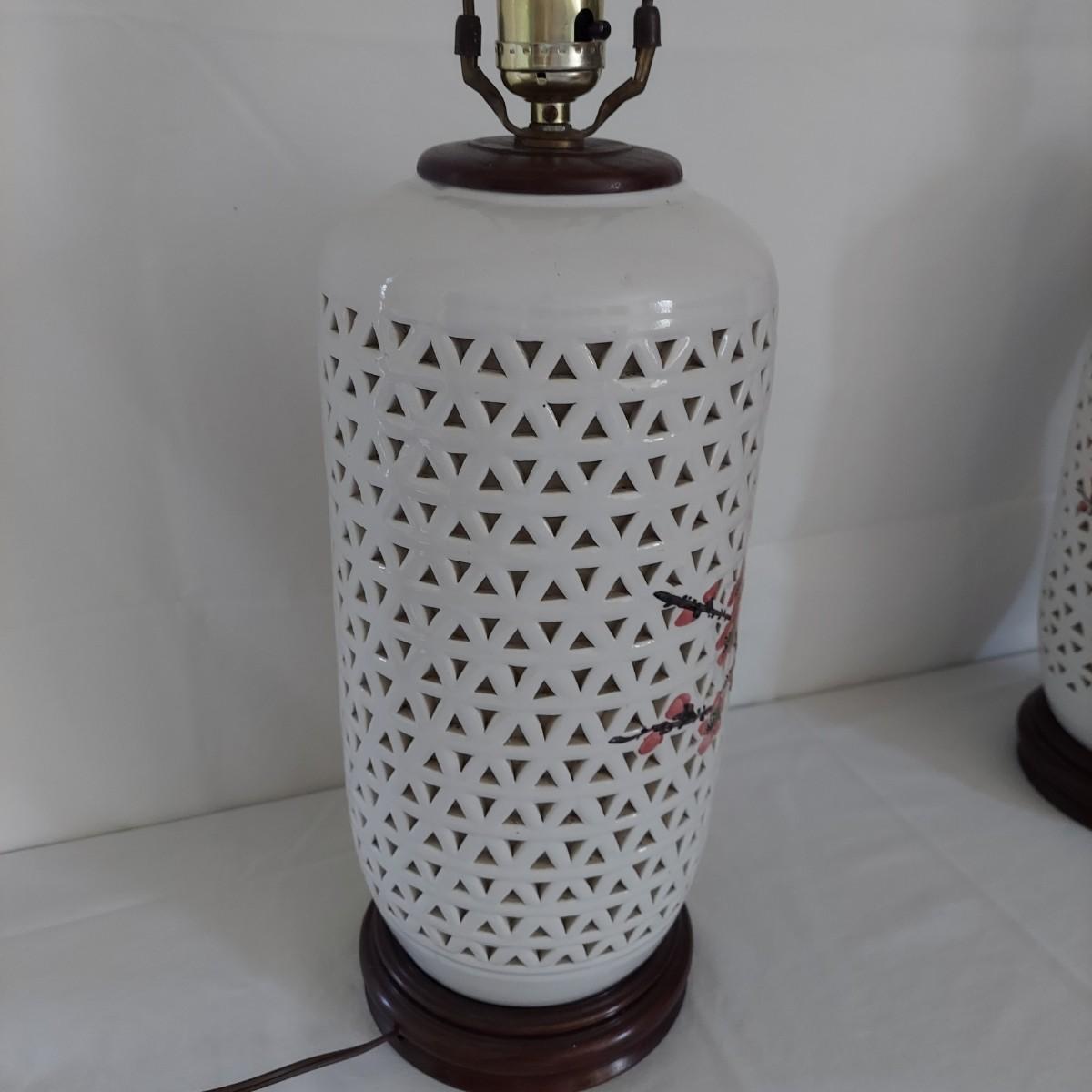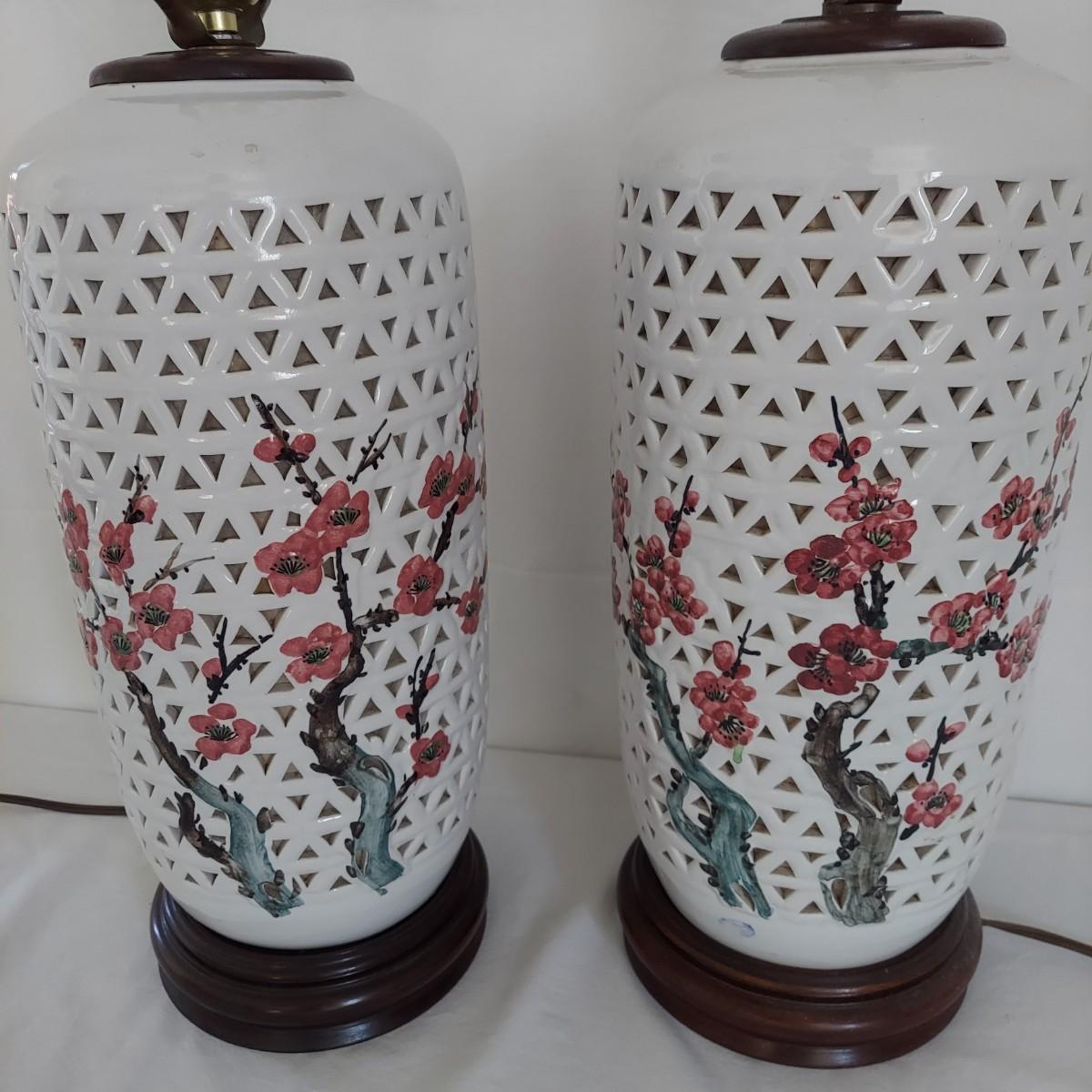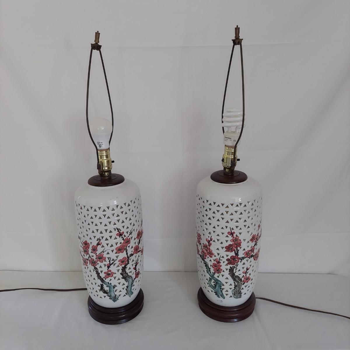 Two ceramic lamps with triangle cutout design on a wood base. White glaze with cherry blossoms that appear to be hand painted. These do not have shades. Each measures 6.5" x 30.5"H. They were plugged in and each powered on. Local Pickup Only.