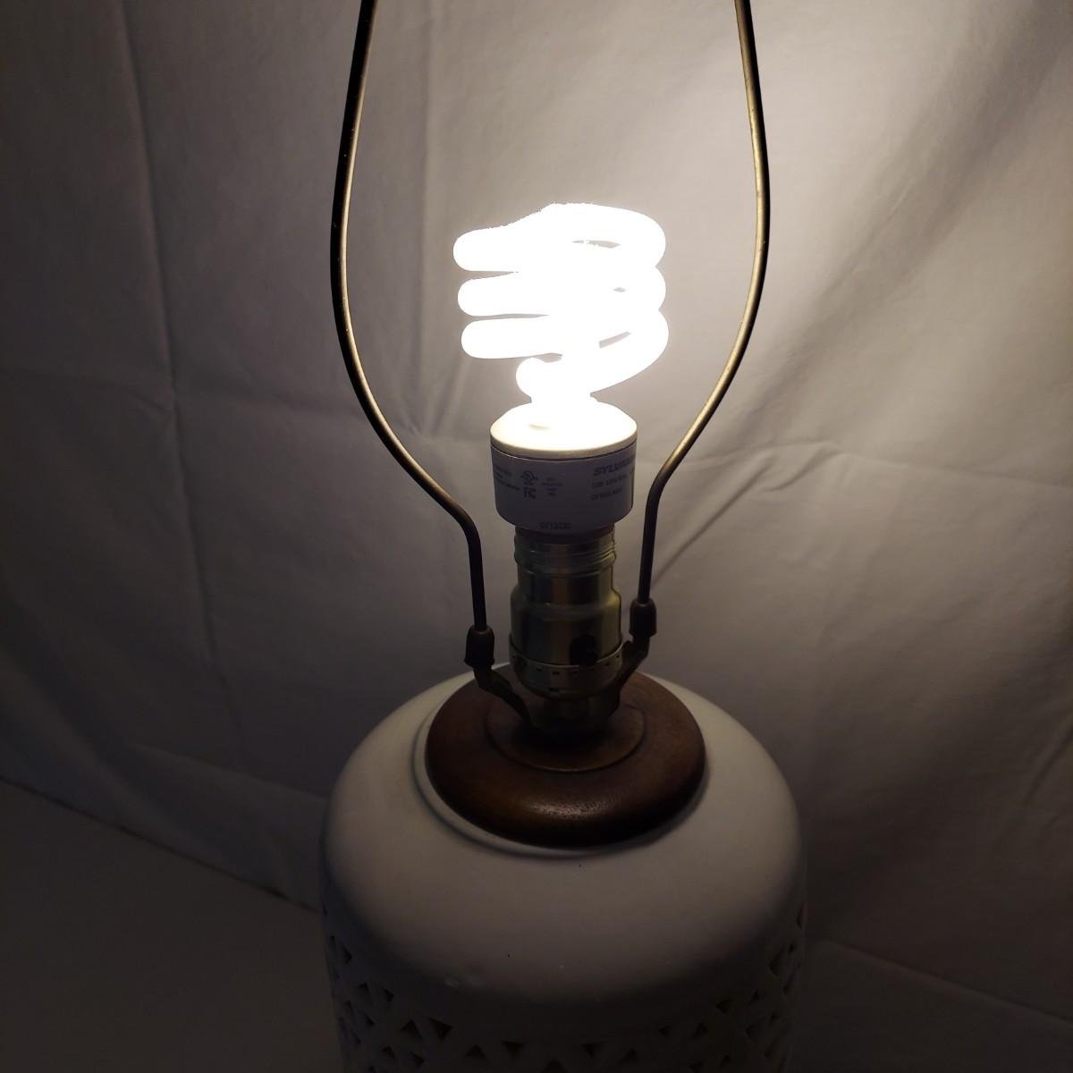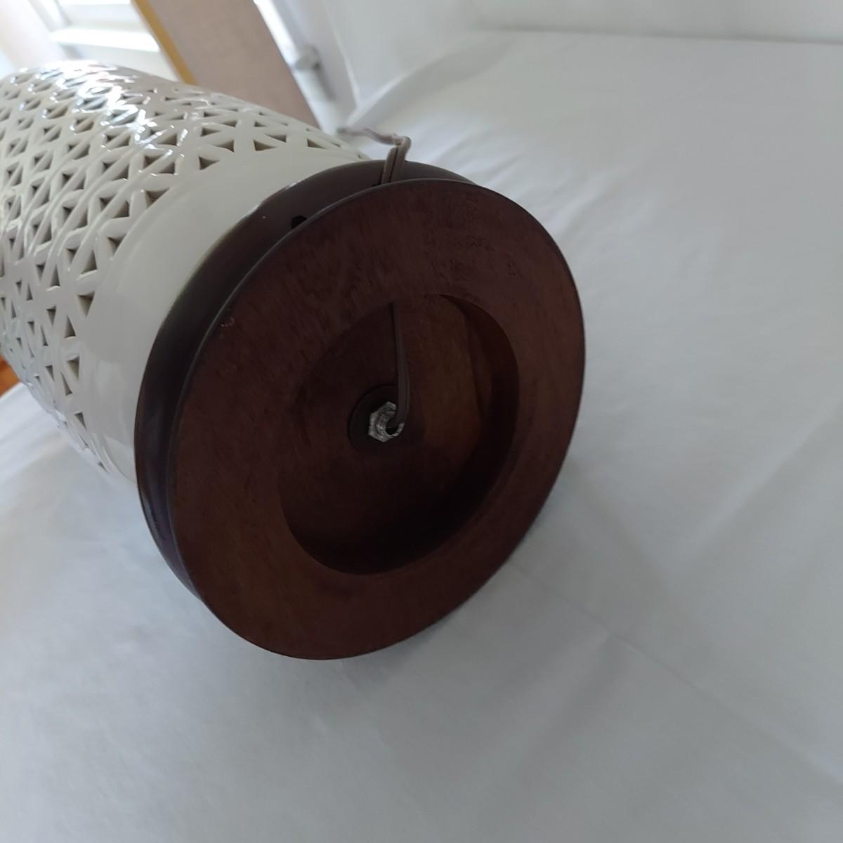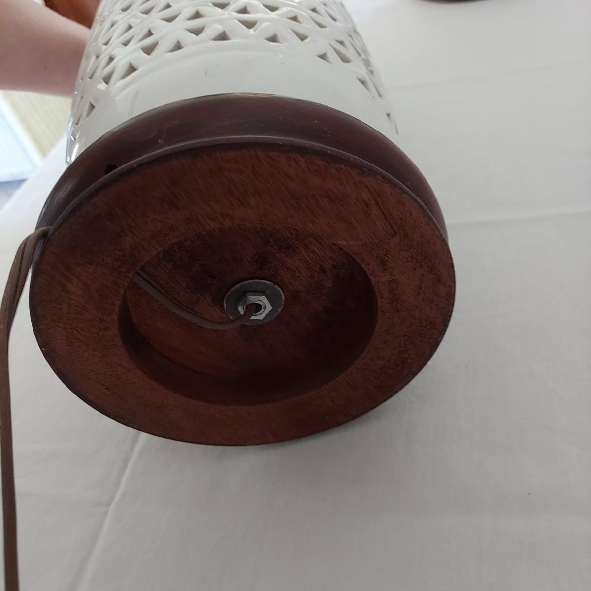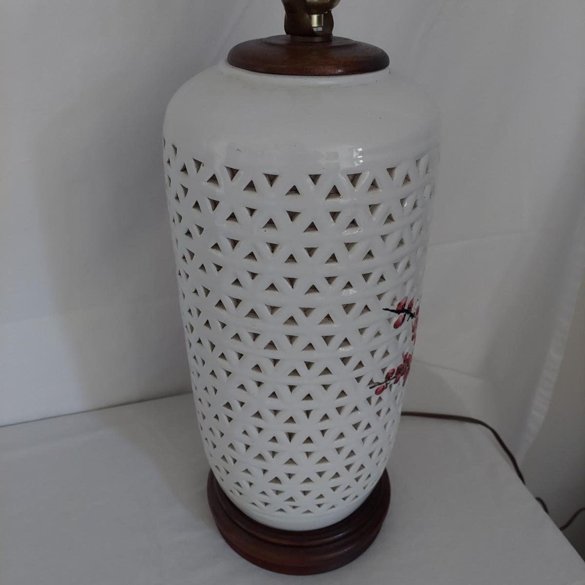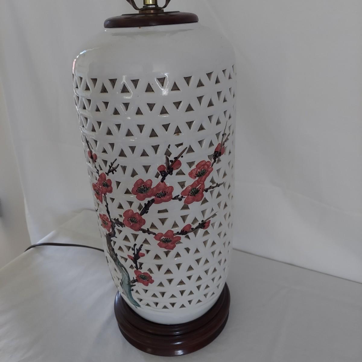 Two ceramic lamps with triangle cutout design on a wood base. White glaze with cherry blossoms that appear to be hand painted. These do not have shades. Each measures 6.5" x 30.5"H. They were plugged in and each powered on. Local Pickup Only.
