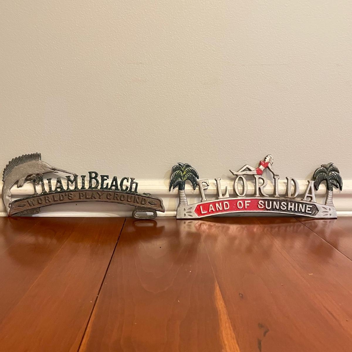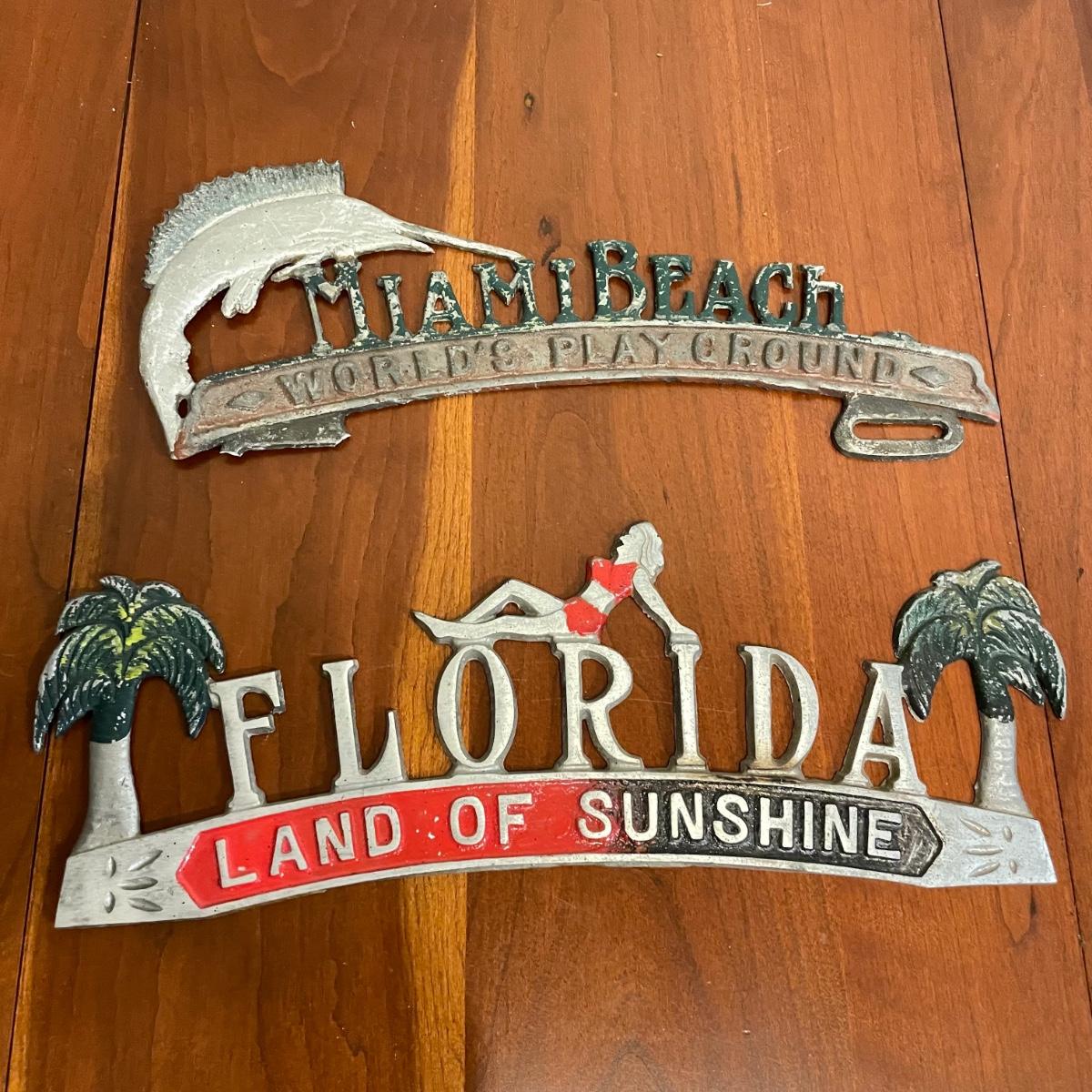 Two Vintage Metal Florida License Plate Toppers (GL - SS)