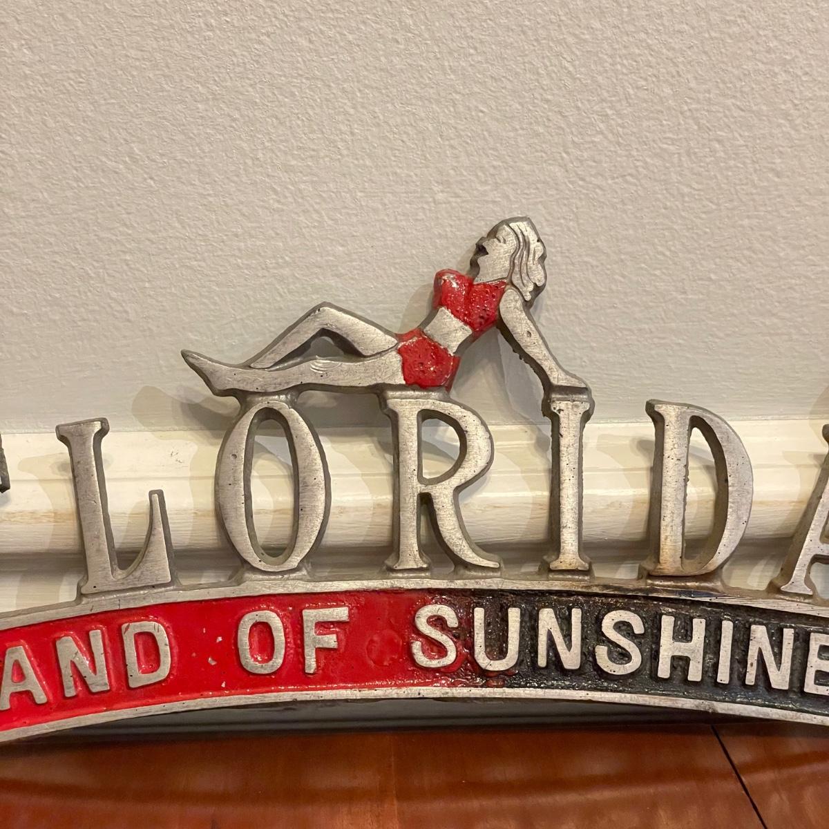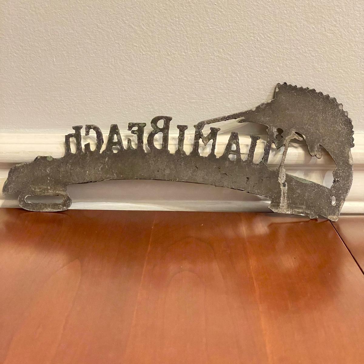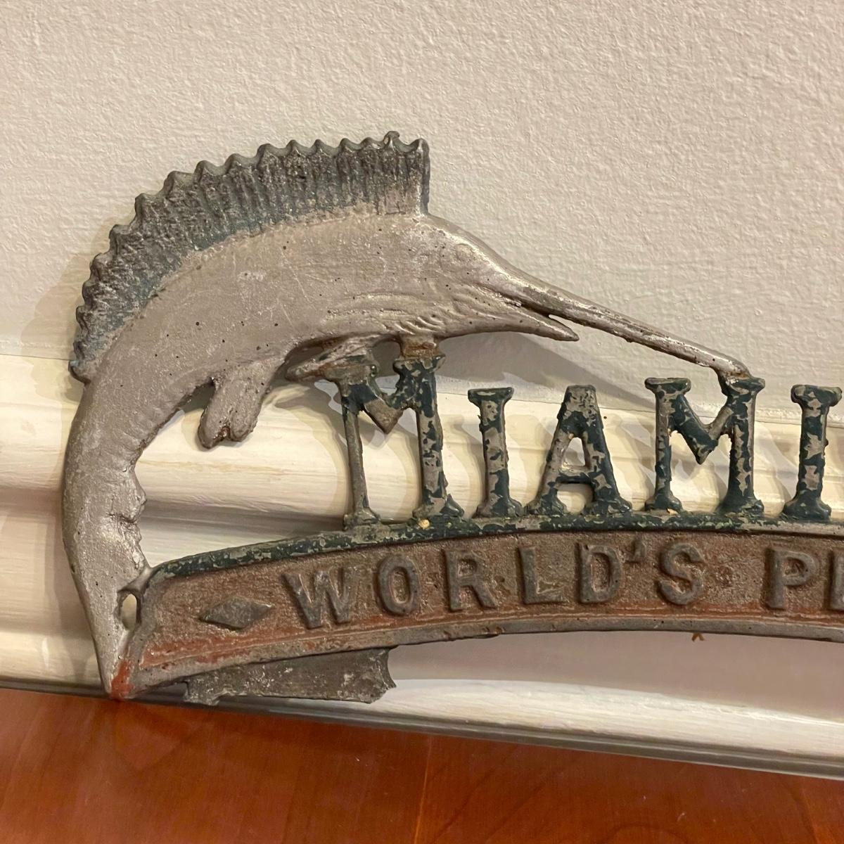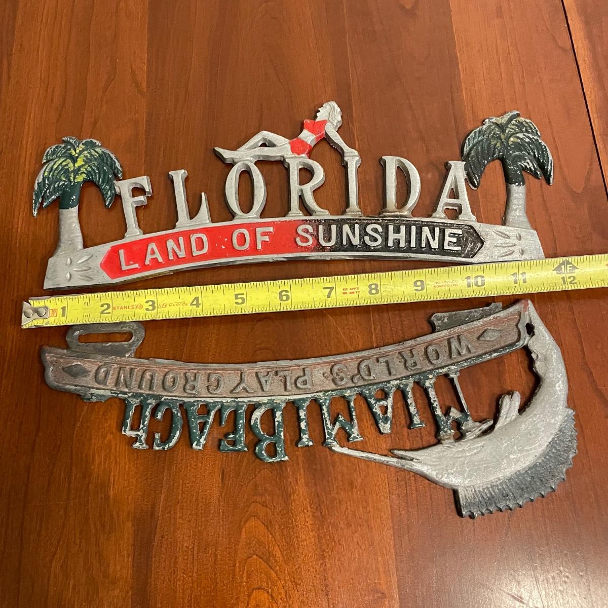 Two fun vintage metal signs. Likely made as license plate topper. “Florida Land of Sunshine” metal sign with red and green paint along with Miami Beach World’s Playground with hints of green paint and a swordfish. See images. Shipping available.