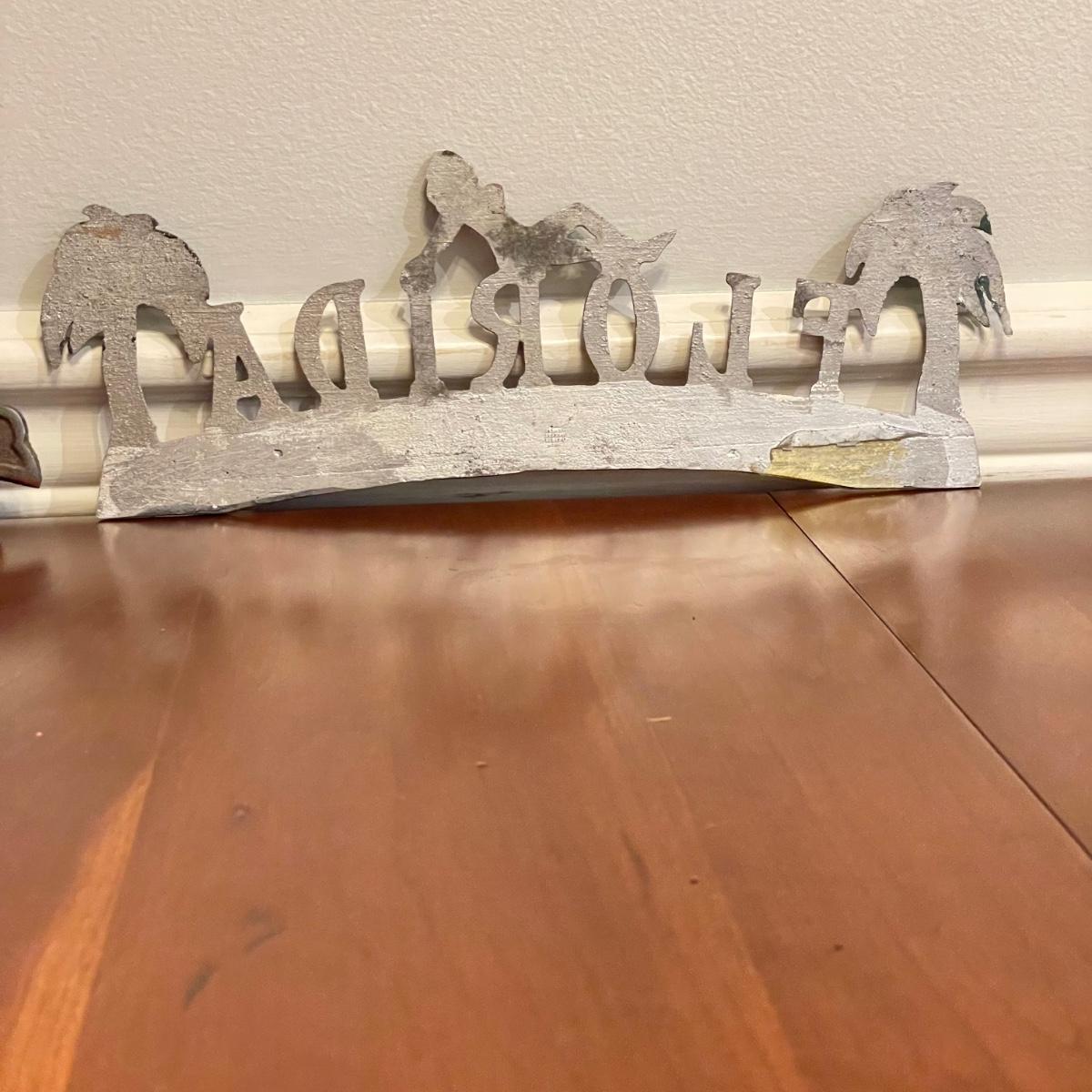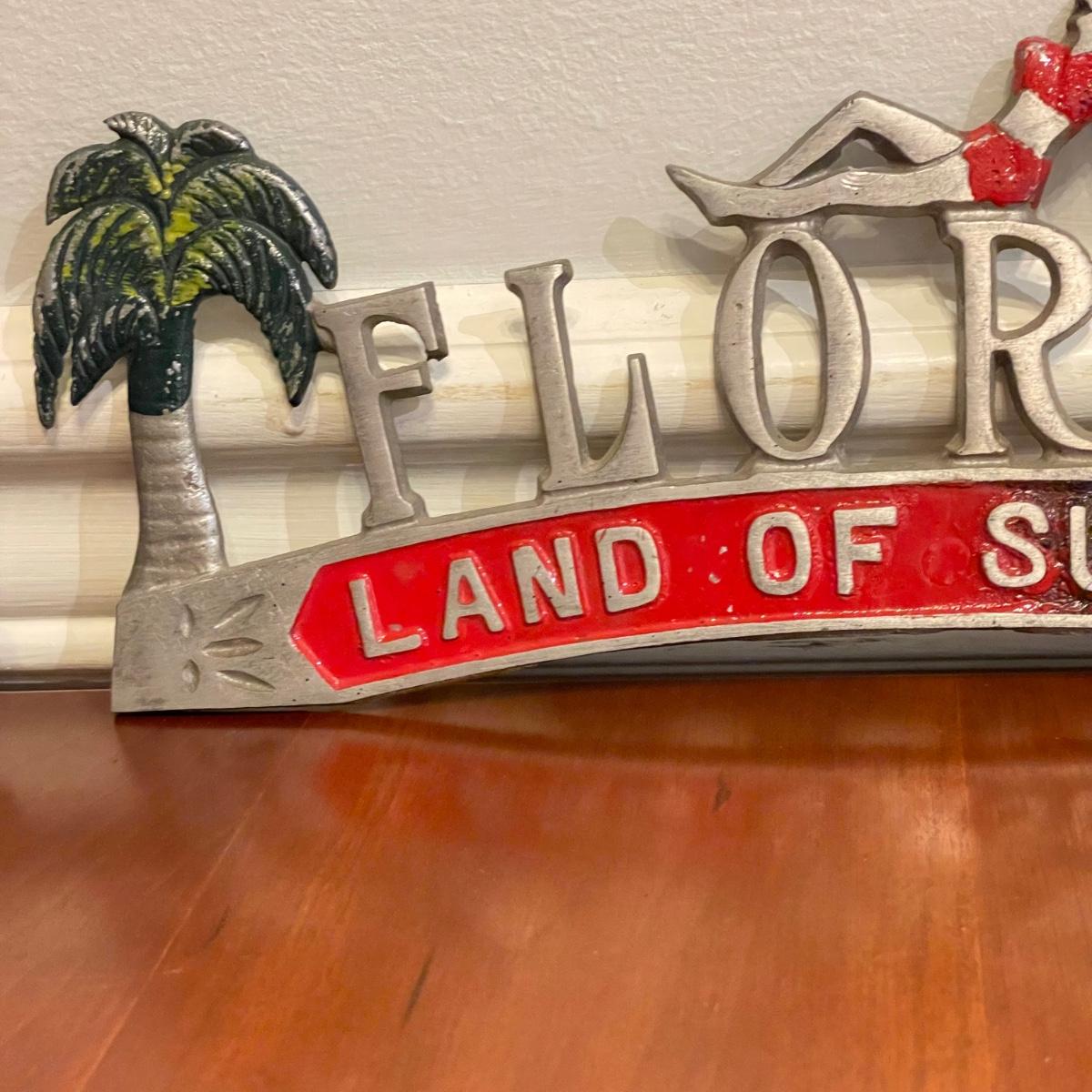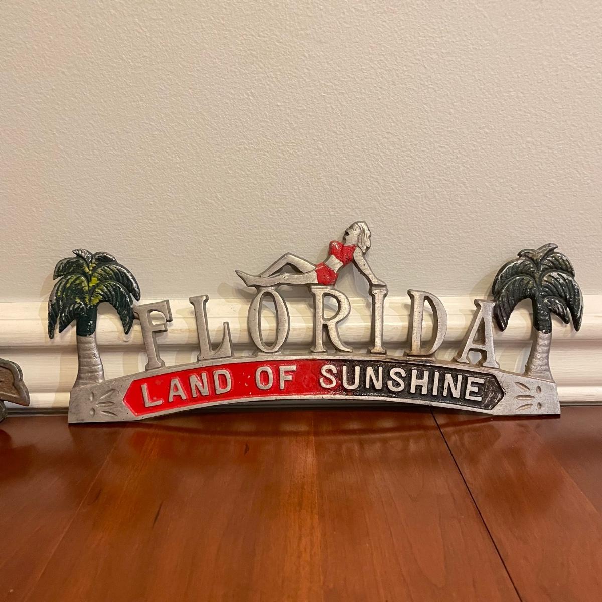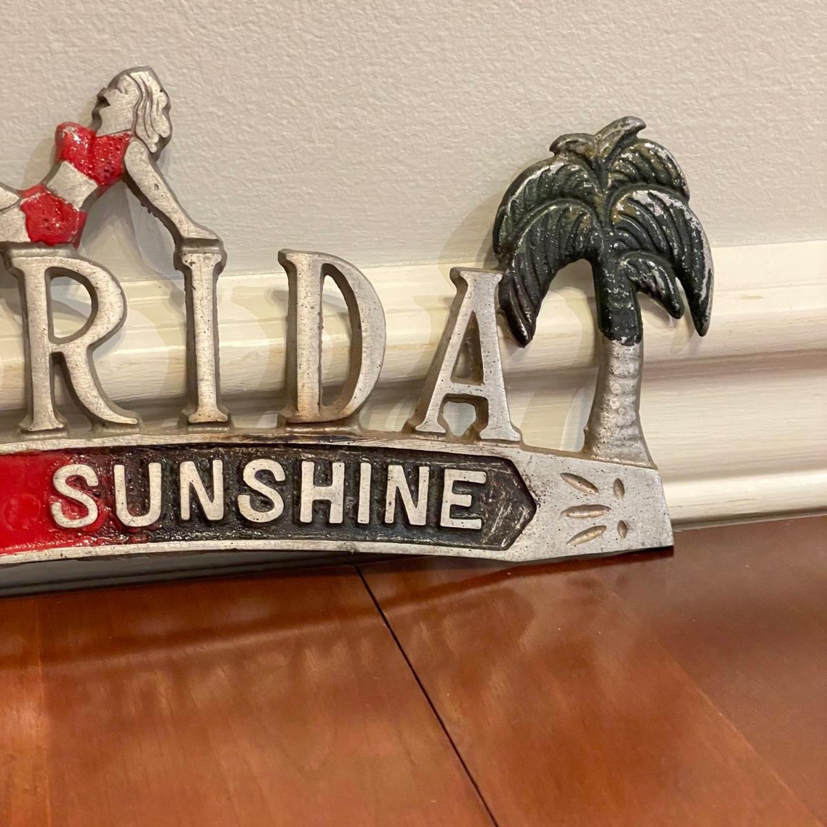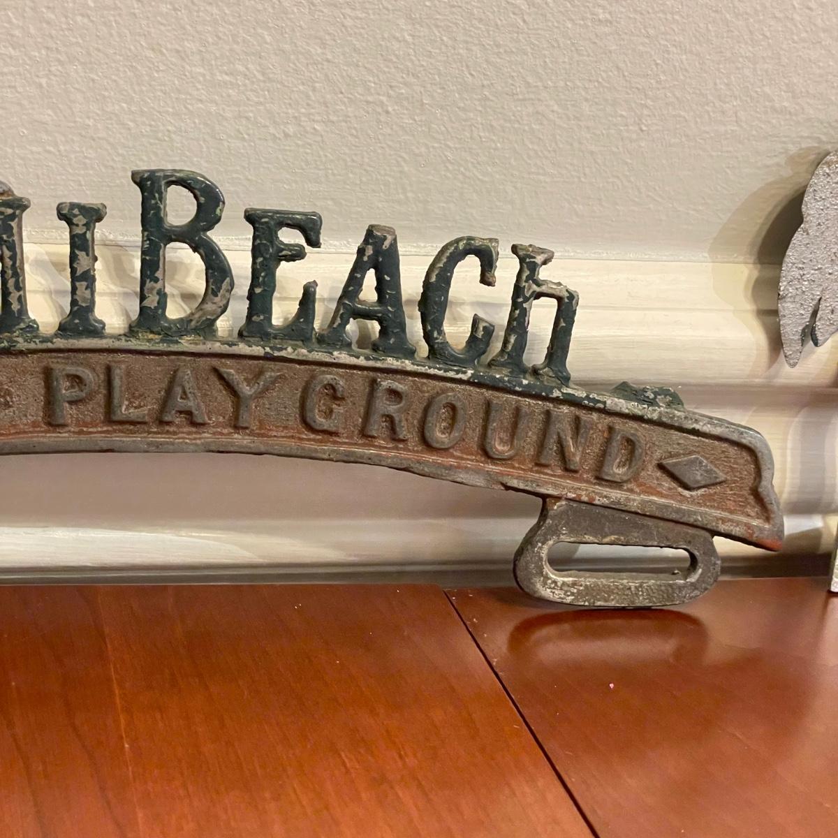 Two fun vintage metal signs. Likely made as license plate topper. “Florida Land of Sunshine” metal sign with red and green paint along with Miami Beach World’s Playground with hints of green paint and a swordfish. See images. Shipping available.