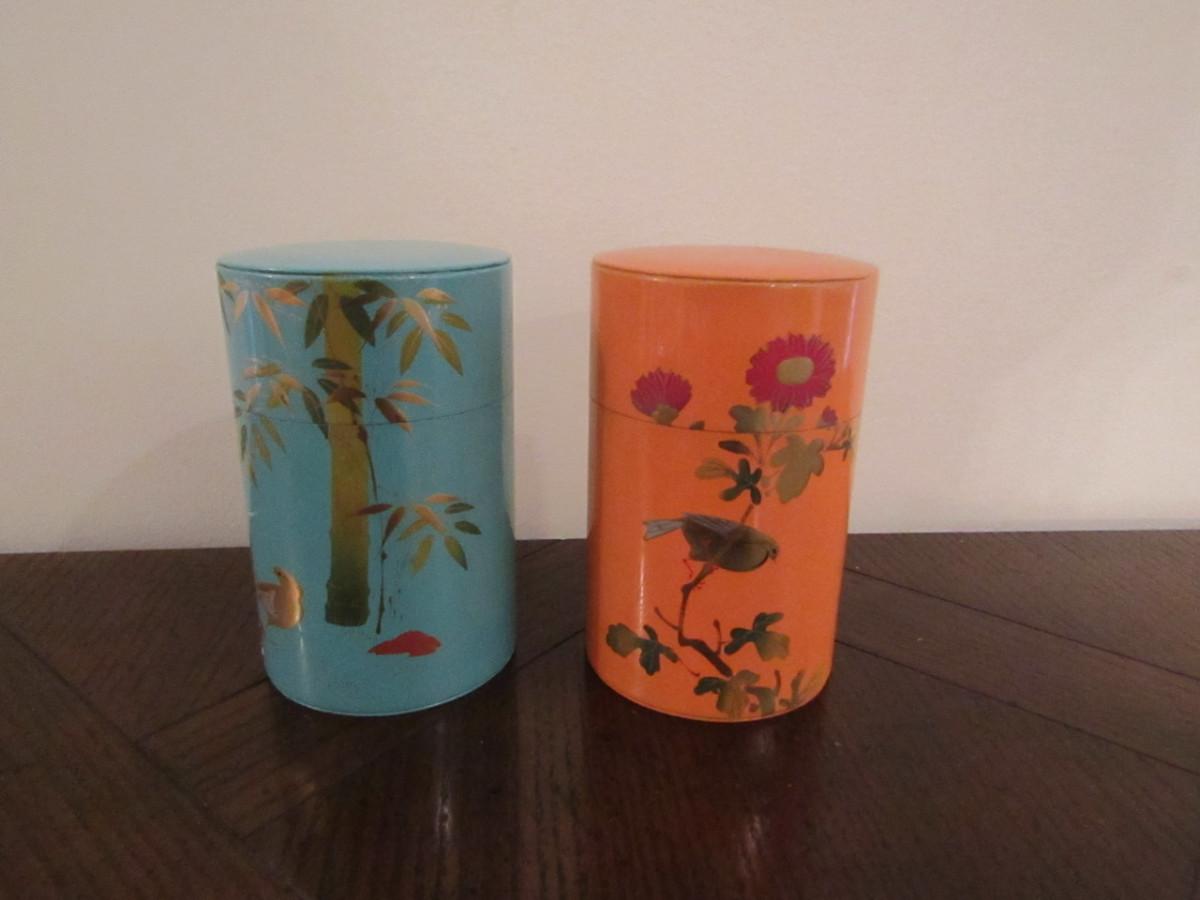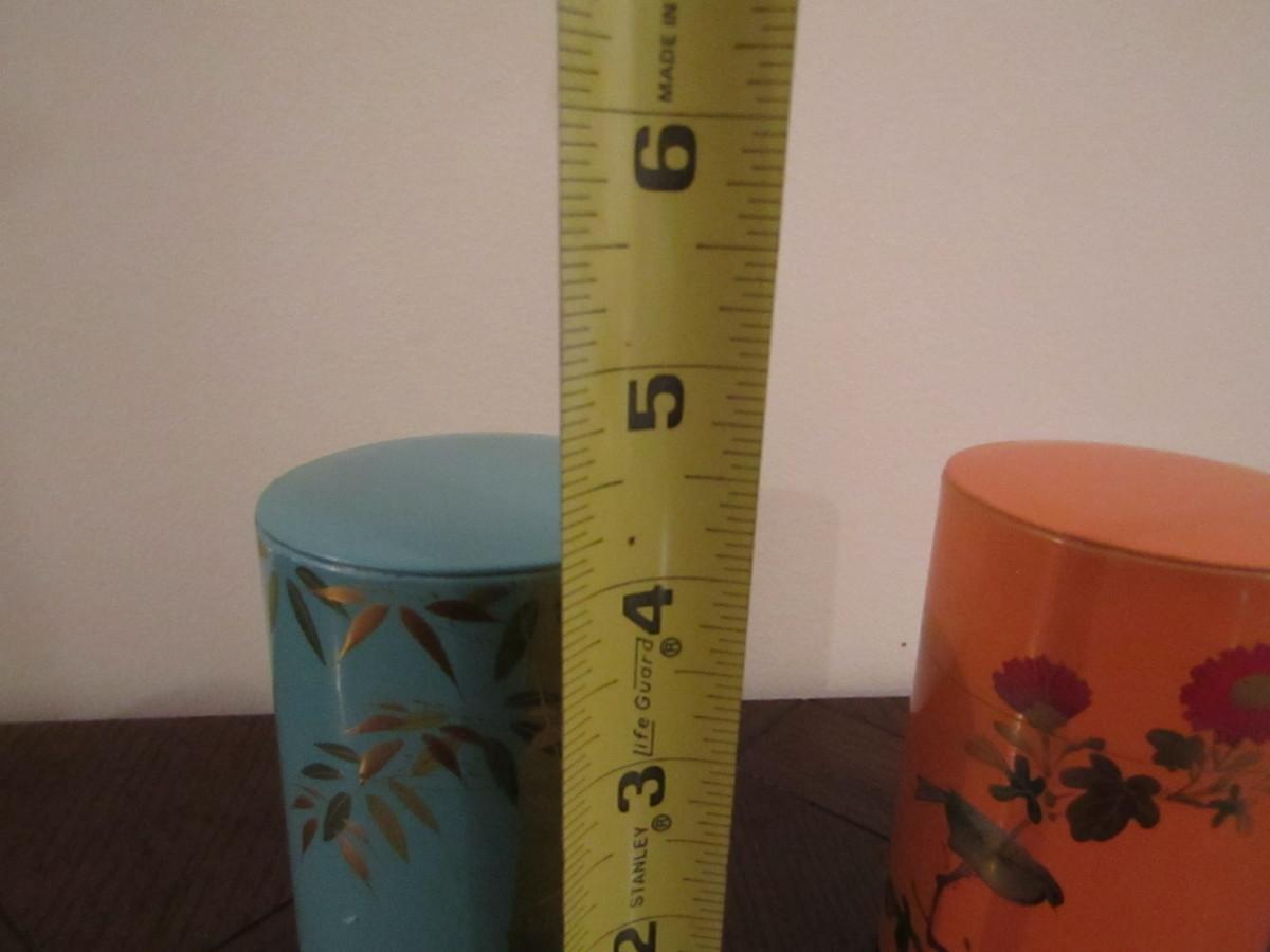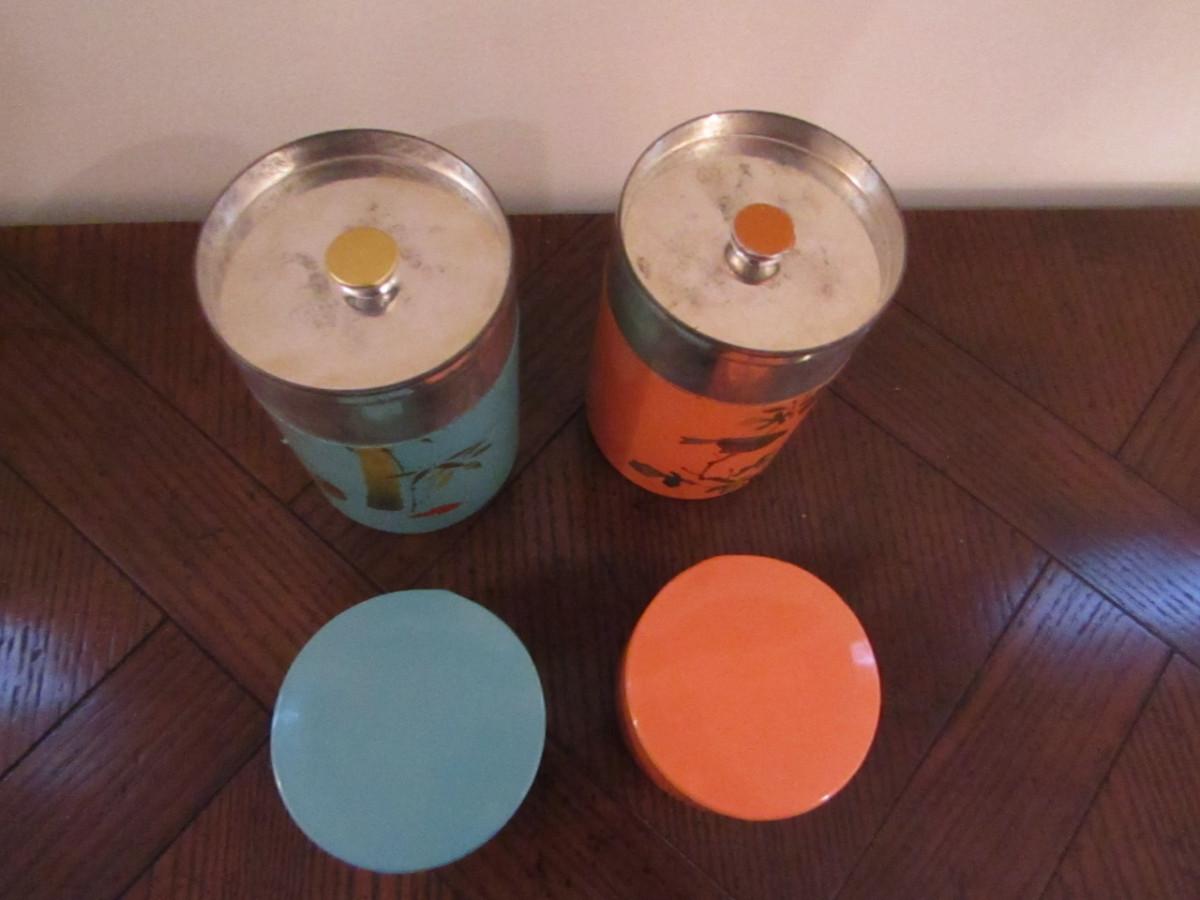 Two Vintage Metal Tins- Nice Coloring with Floral Motif- Approx 4 1/4" Tall, 2 1/2" in Diameter