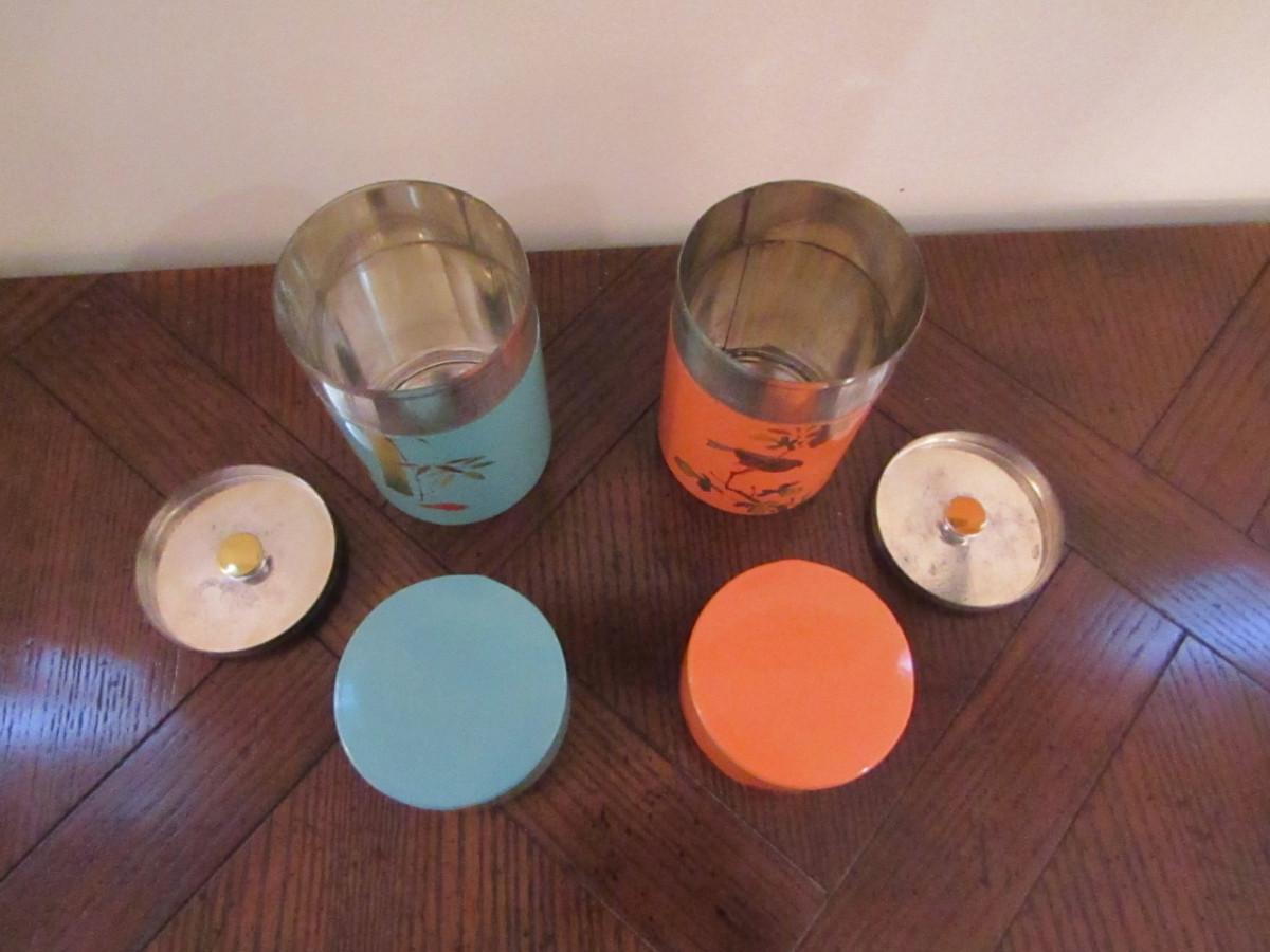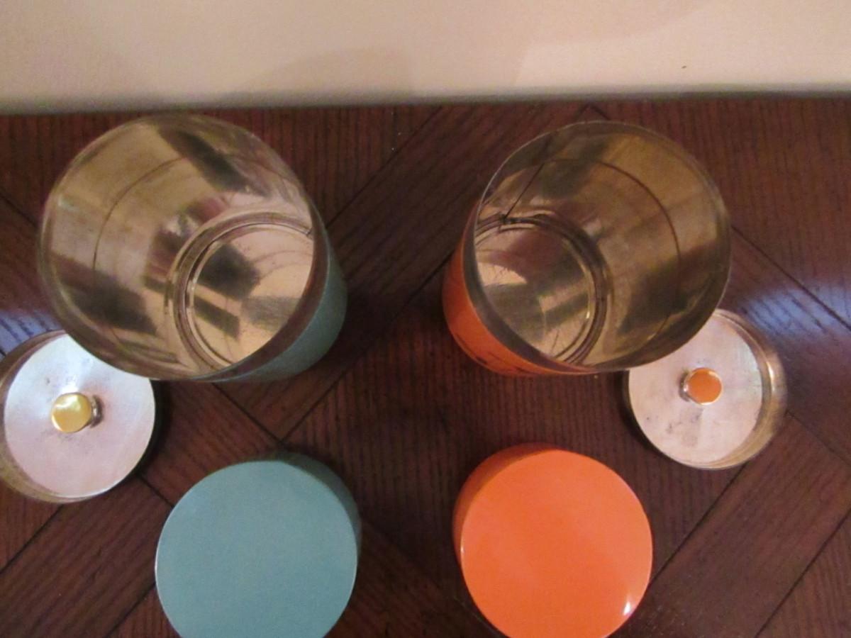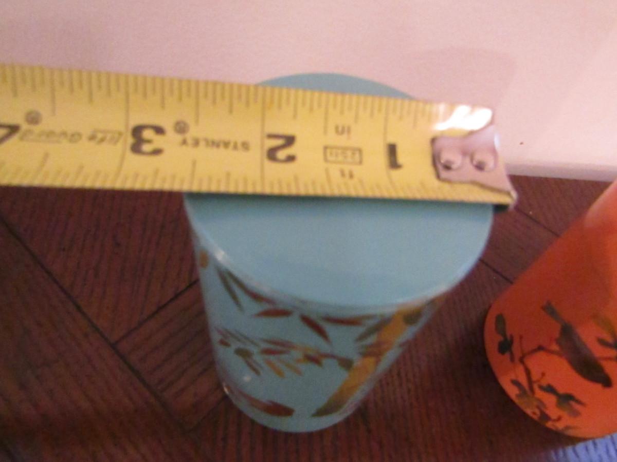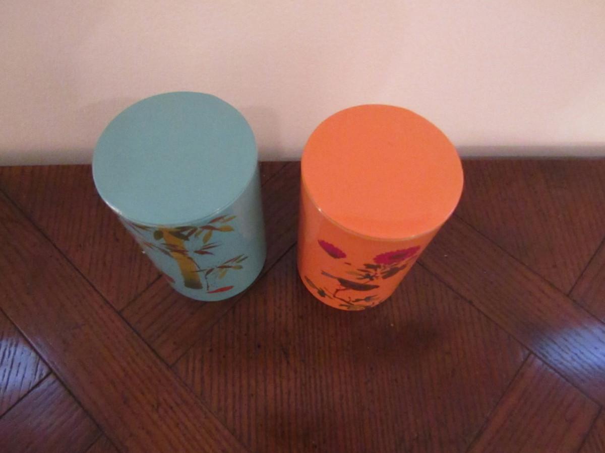 Two Vintage Metal Tins- Nice Coloring with Floral Motif- Approx 4 1/4" Tall, 2 1/2" in Diameter
