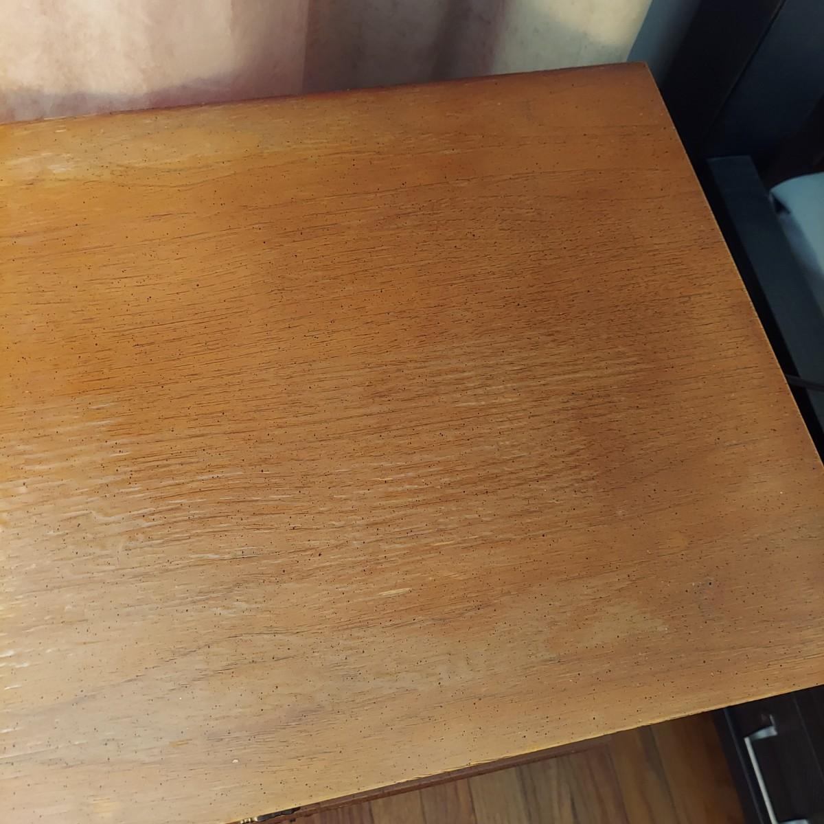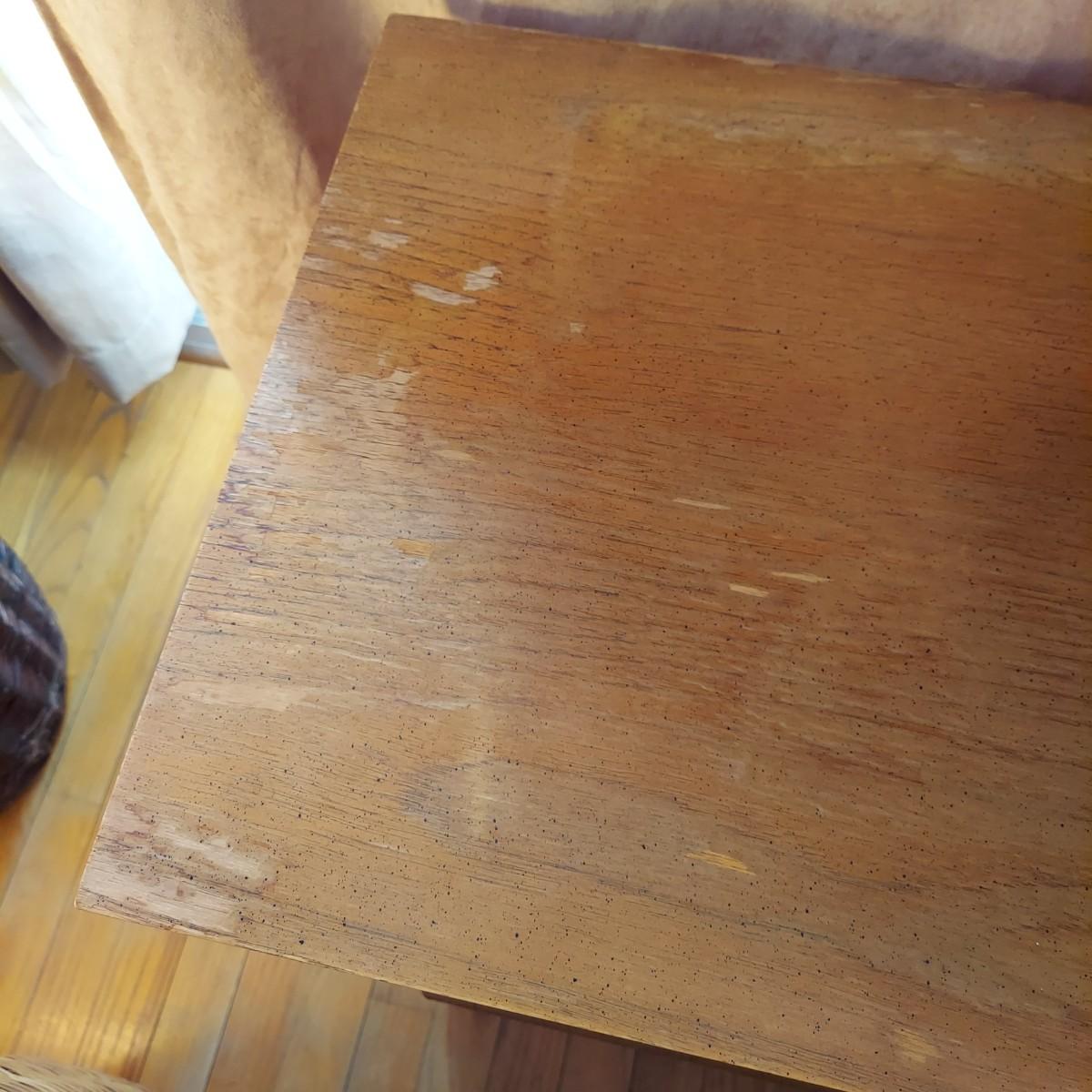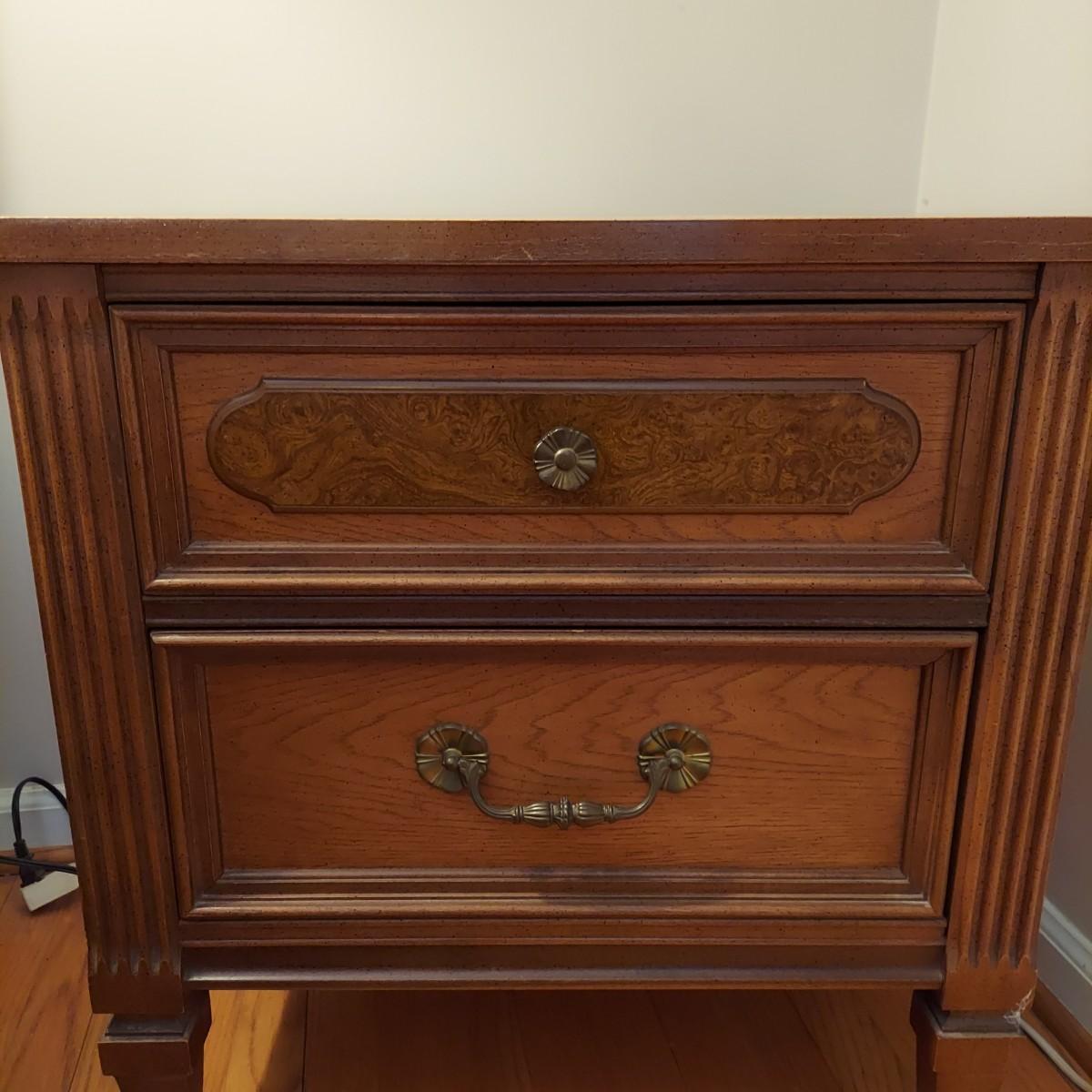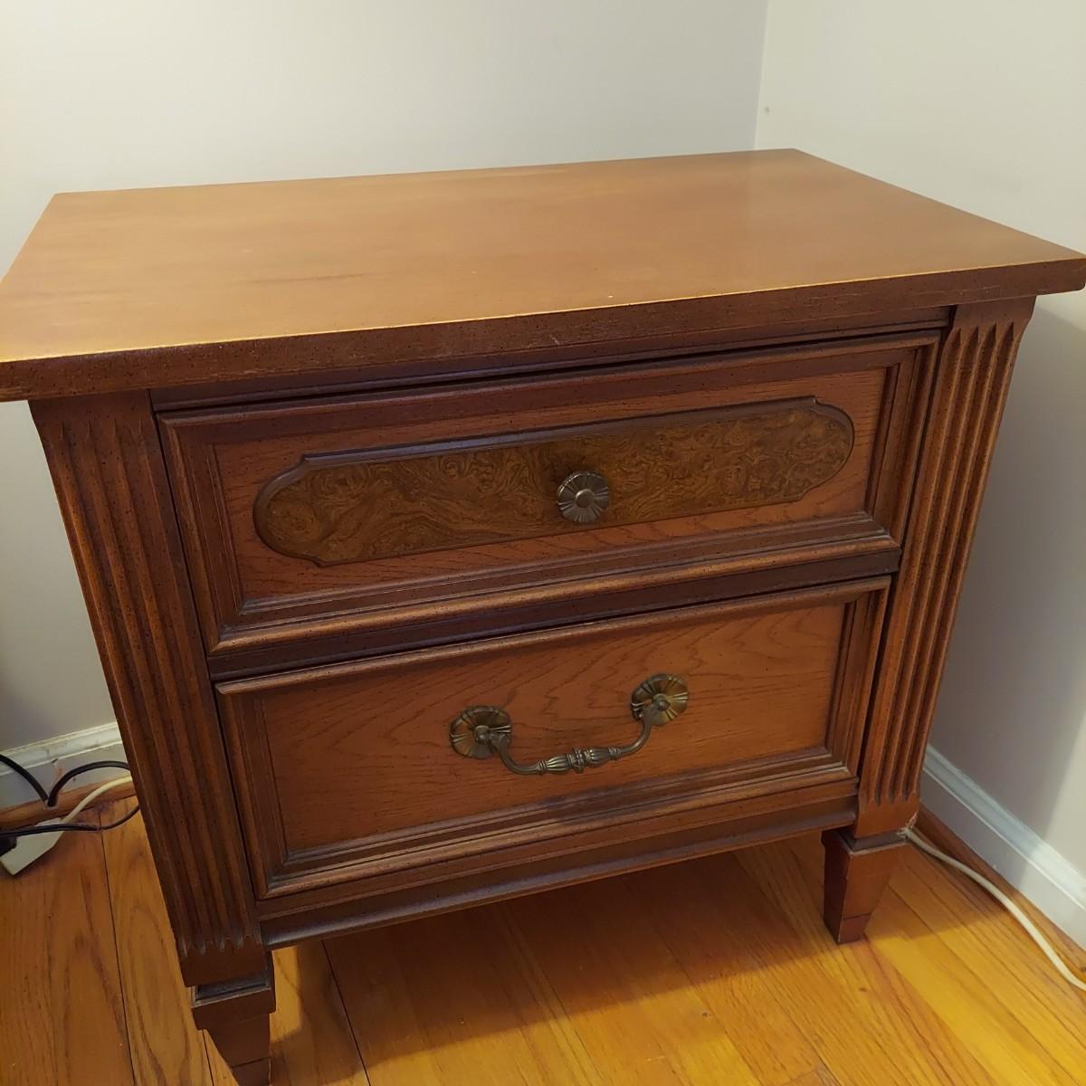 Two matching vintage wooden nightstands. Each has two drawers. They each measure 25” x 15.5” x 25"H. They match a chest on chest style dresser, and a china hutch in other lots. The finish is peeling quite a bit on the top of one. Appears to be sun damage. Please see photos for details. Local Pickup Only