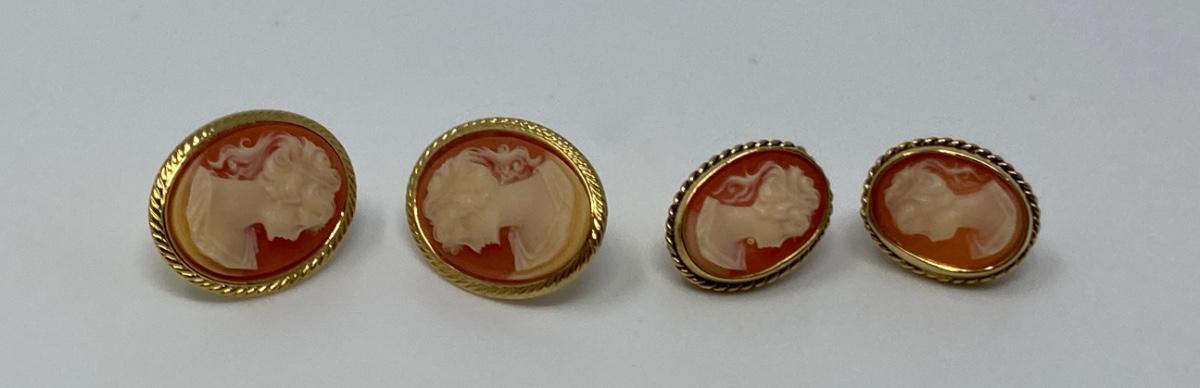 Two Vintage Pairs of Cameo Earrings. The Pair On The Left Is Unmarked. The Pair On The Right Is Marked 14KT High Gold Electroplated (HGE) By Lind
