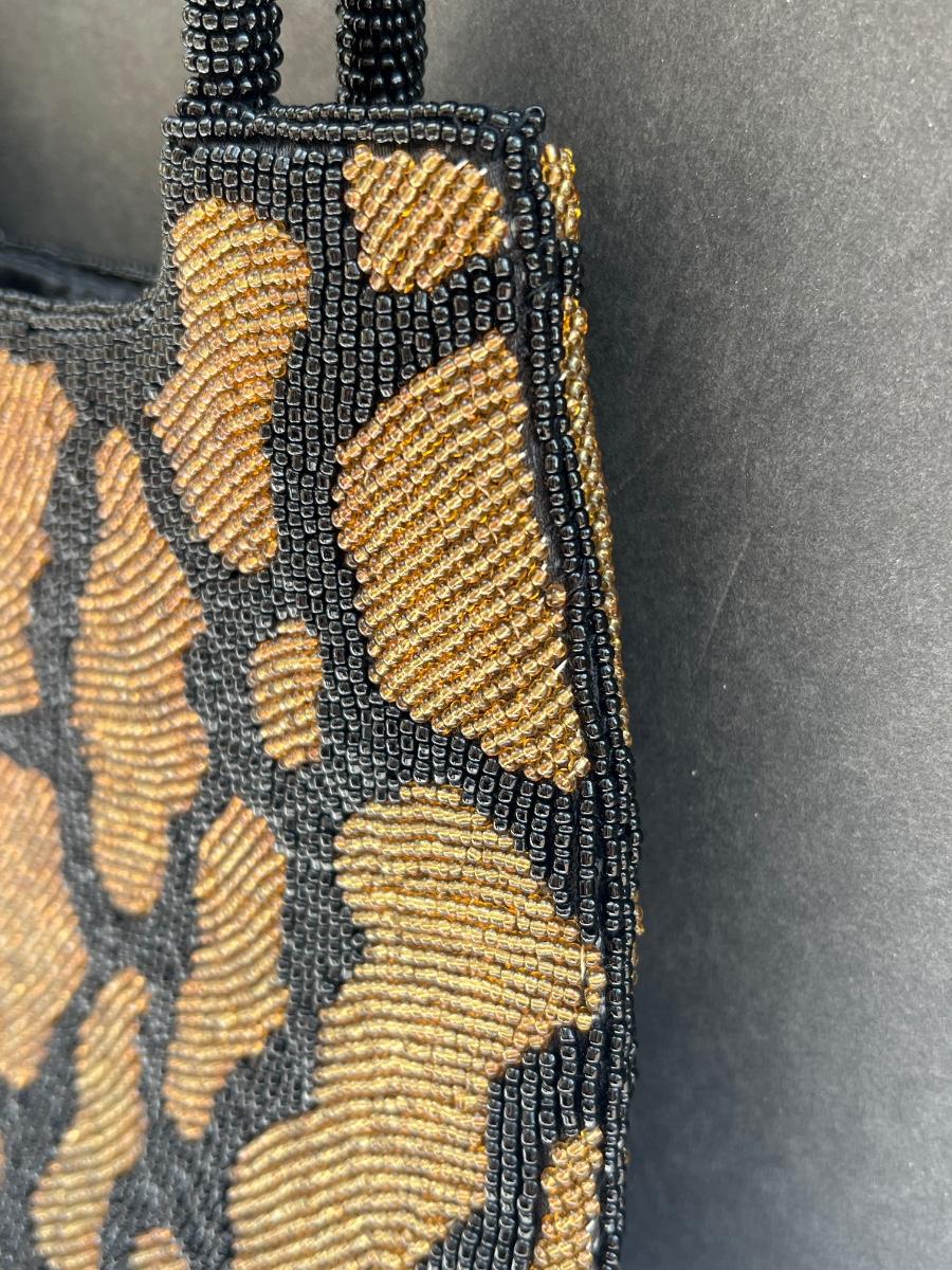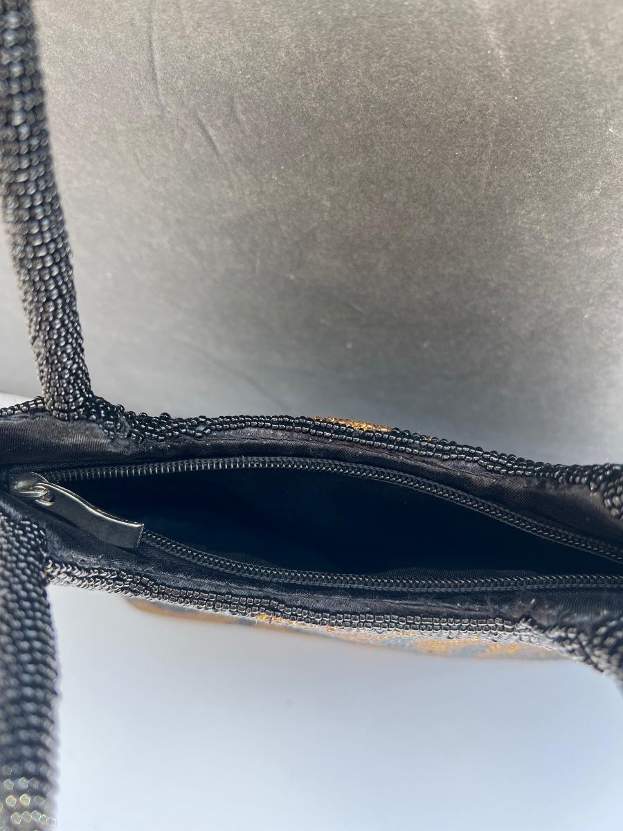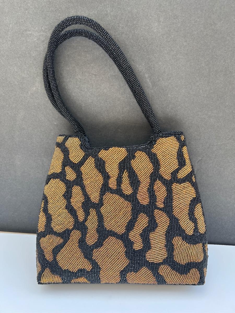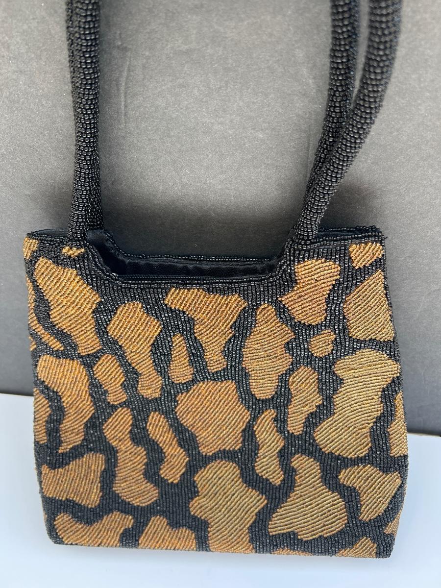 Hardly used completely beaded black and bronze animal pattern handbag with a small package of extra beads. Zips at top. Has inner zipped pocket. 9” x 9.5”