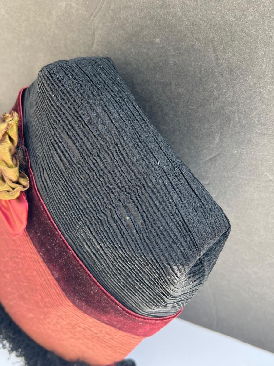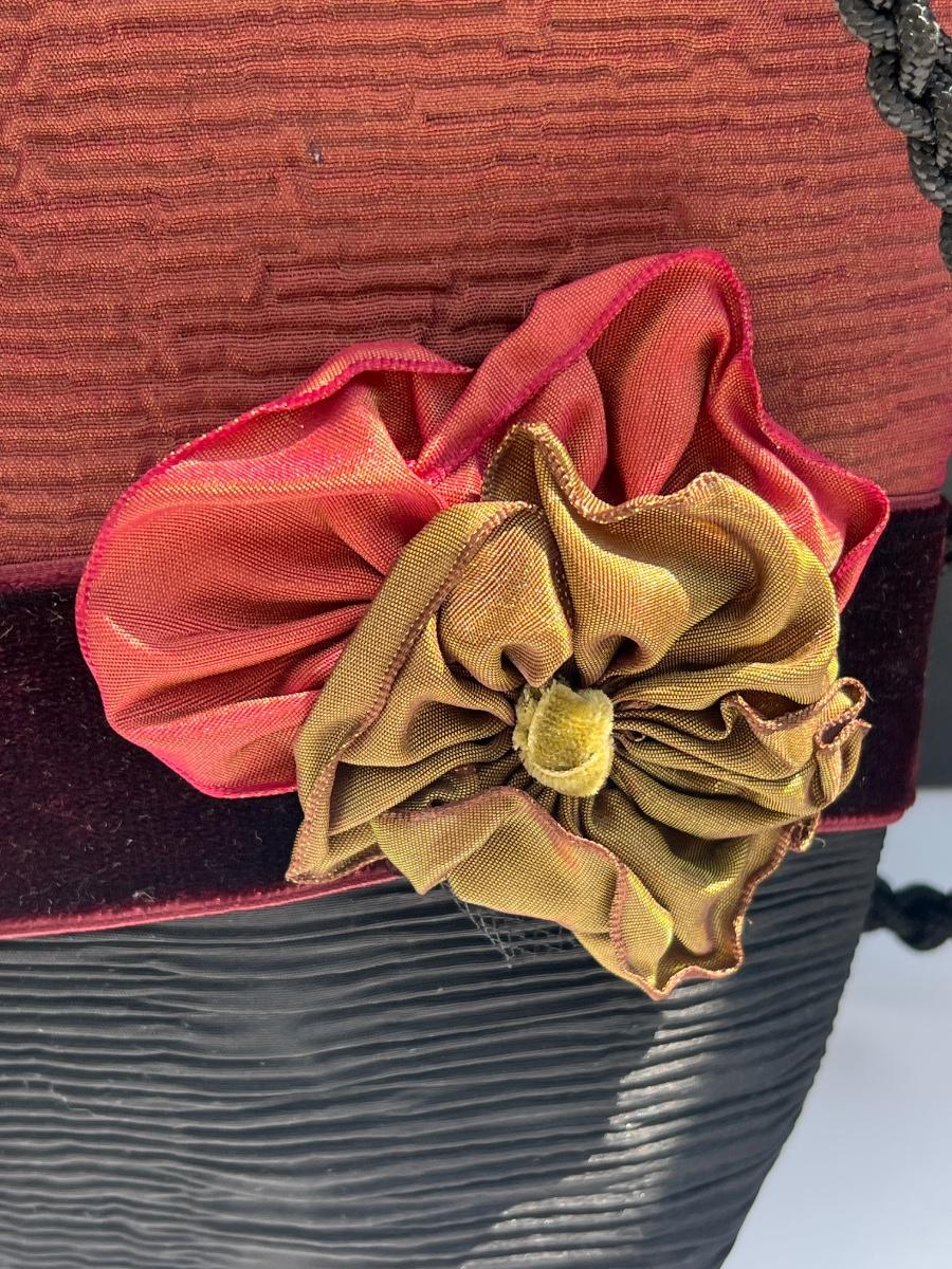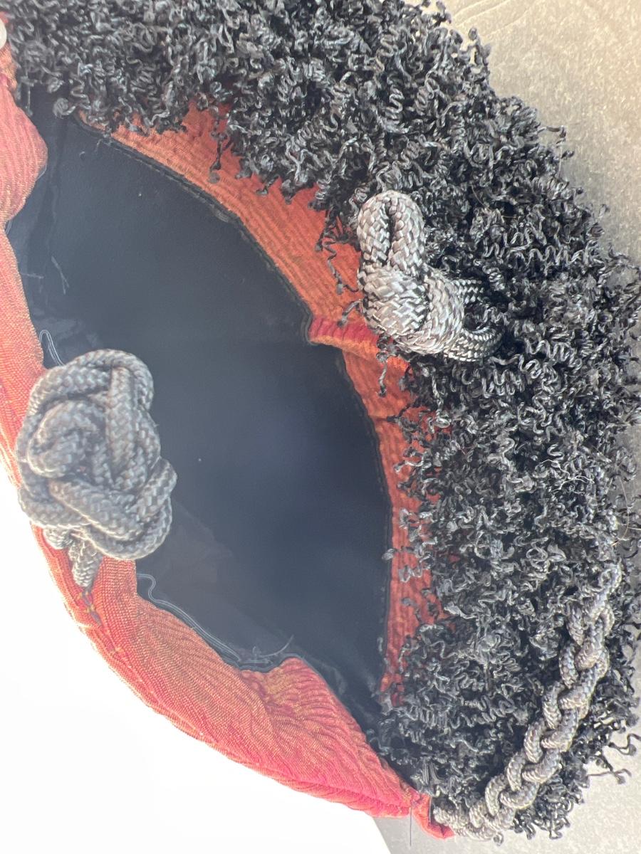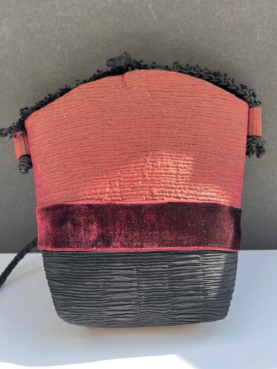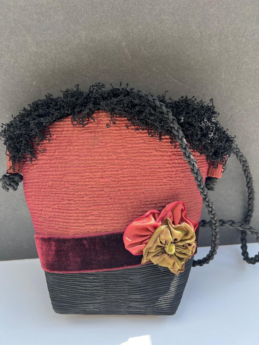 Stylish Parisian style fabric bag with fringed trim and velvet ribbon and fabric floral applique. Knot & loop closure. Zipper pocket inside.