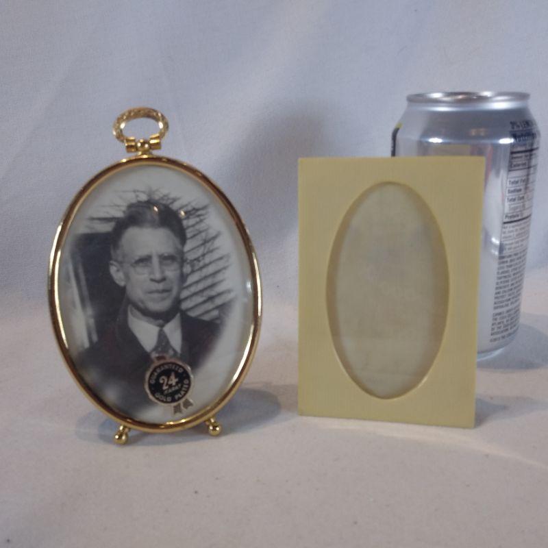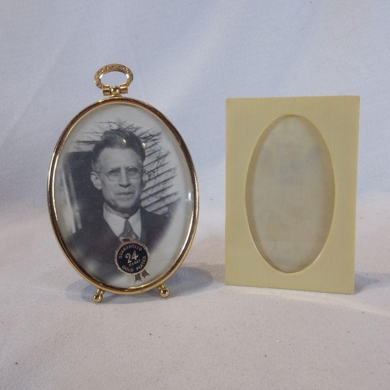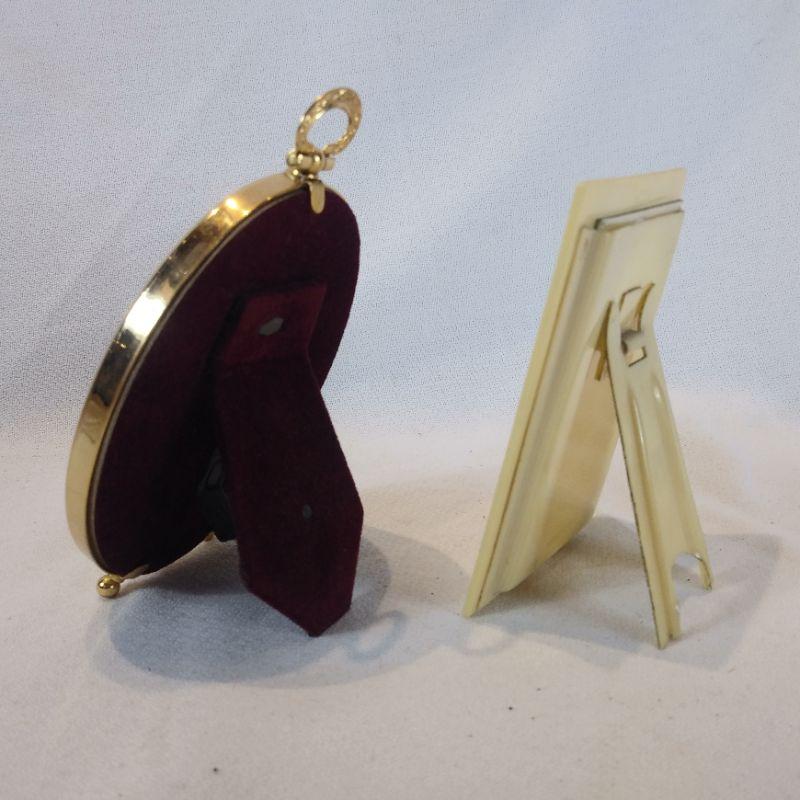 This is a nice offering of two older picture frames. One is a unique 24K gold-plated oval shape with bow glass - extremely nice and would never needs polishing. It measures 5-inches tall. The second frame is comprised of celluloid with a glass insert to guard the photo. It is rectangle with an oval opening and is in very good condition. It is 4-inches tall.