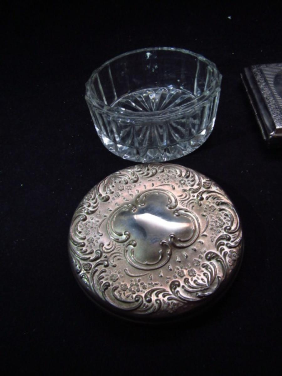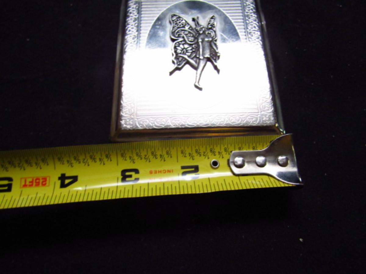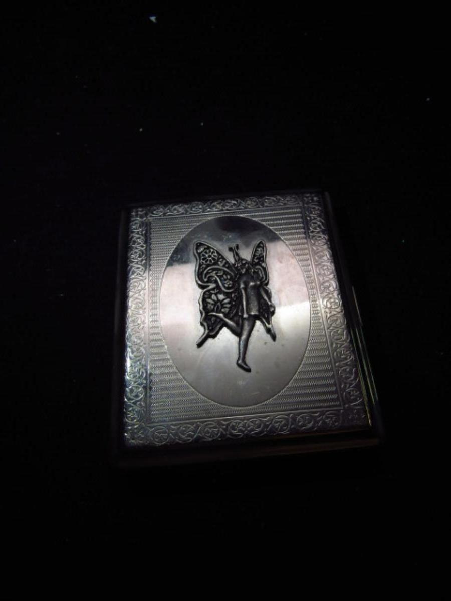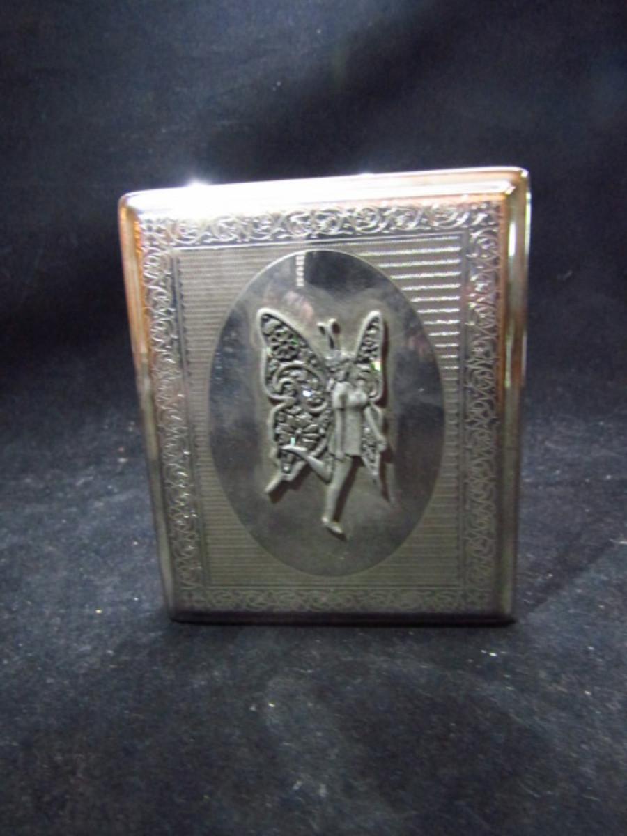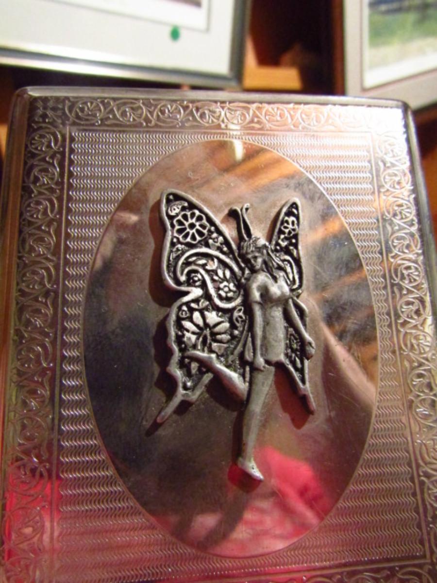 Two Vintage Pieces- Metal Case with Fairy Accent and Glass Vanity Jar with Mirrored Lid (#566)