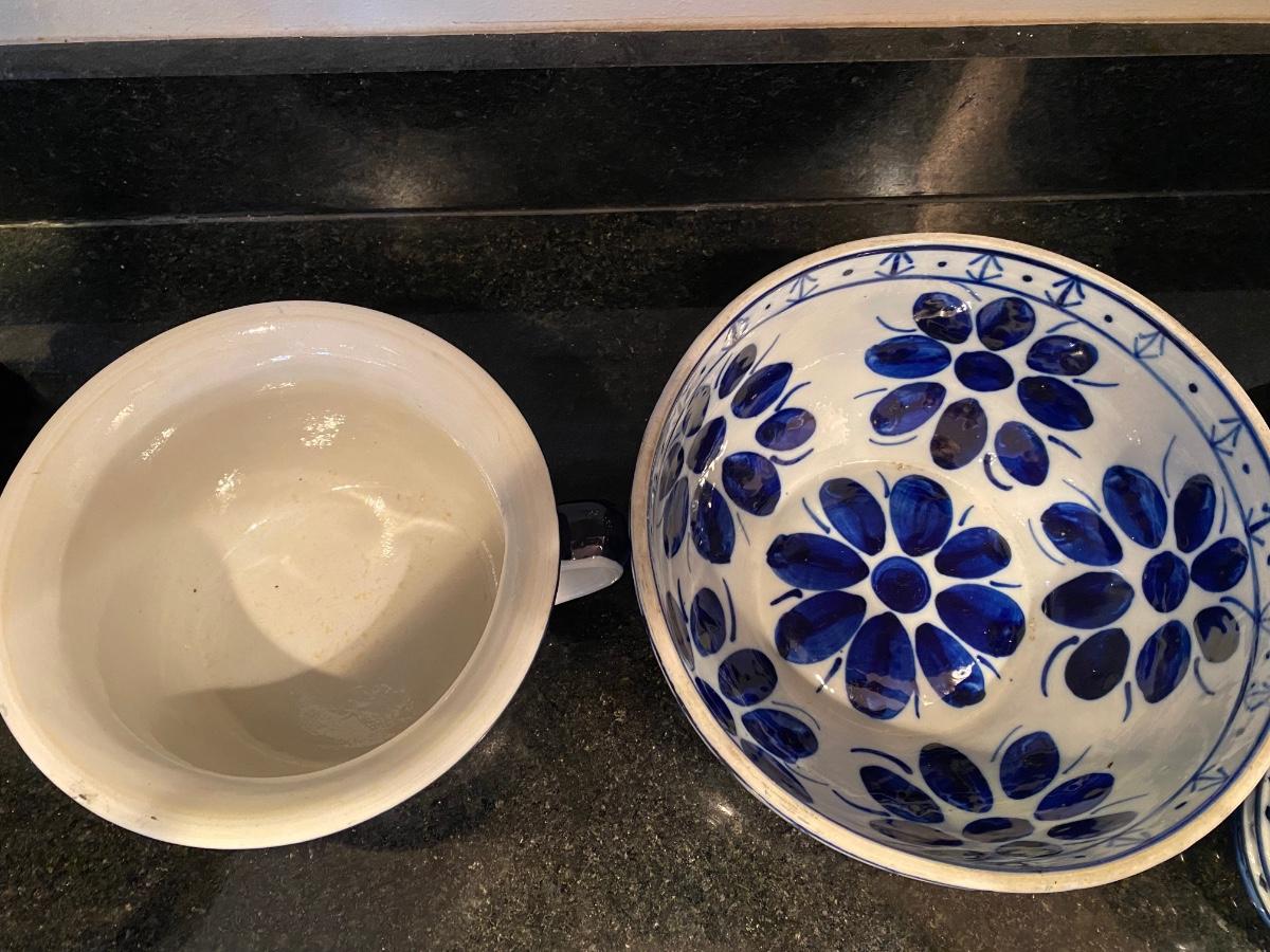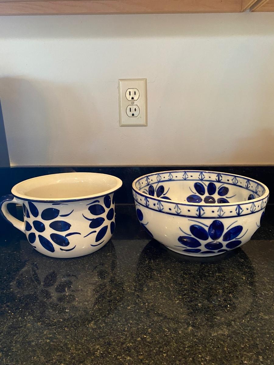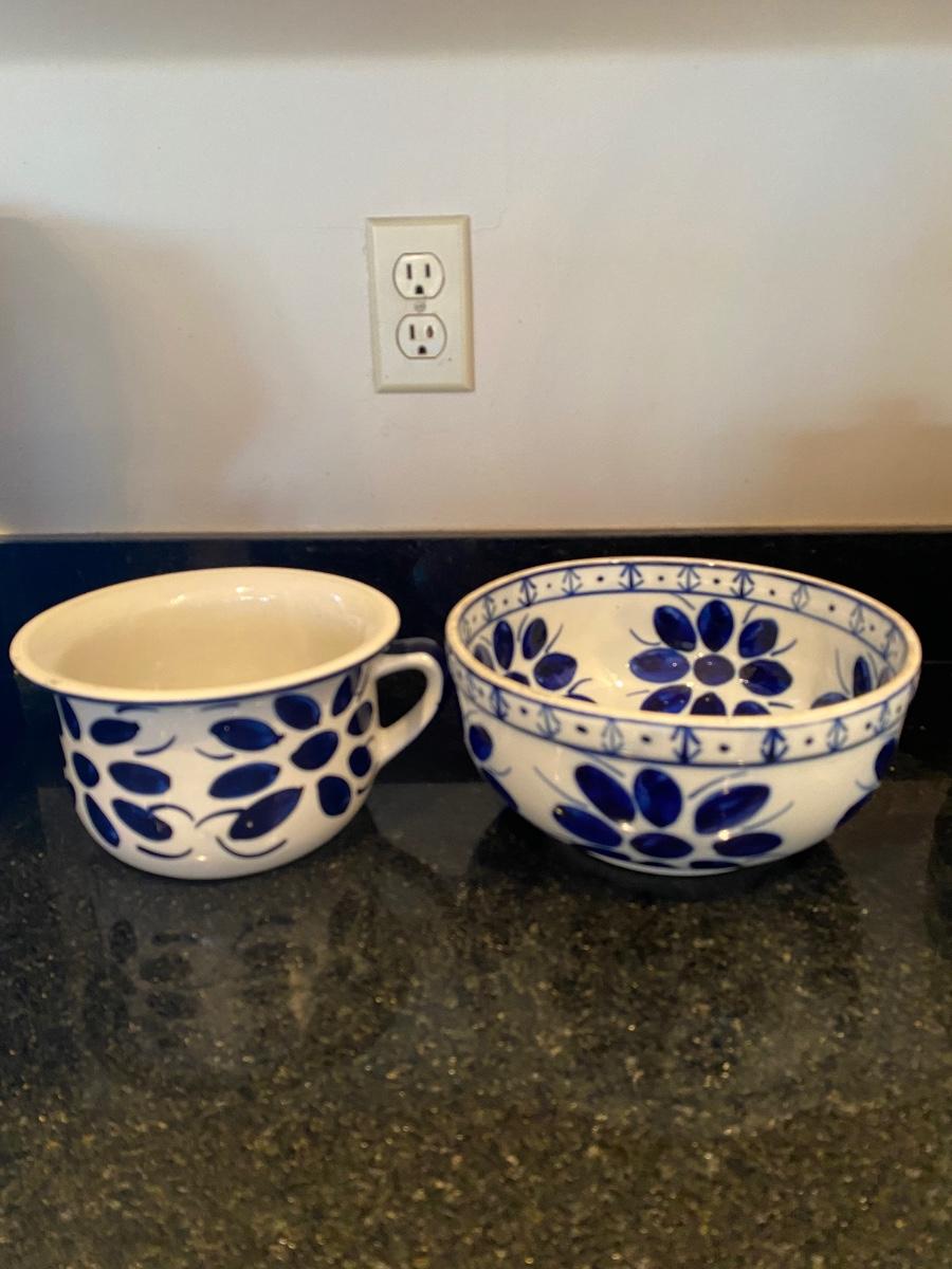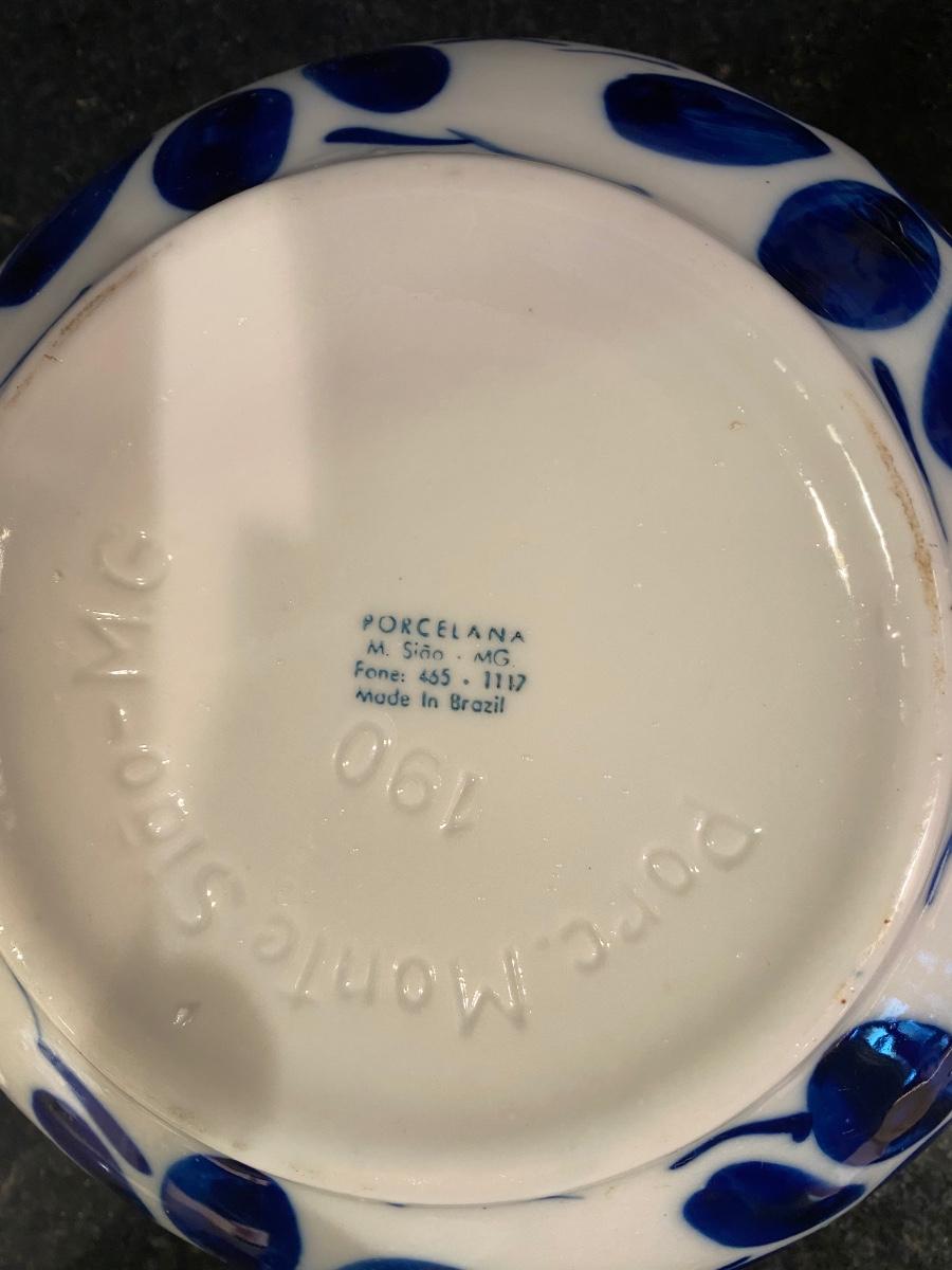 Two vintage porcelain bowls from Brazil. The handled bowl is approx 7-1/2w x 4-1/2h. Larger bowl is approx 9-1/2w x 4-1/2h. Exc condition