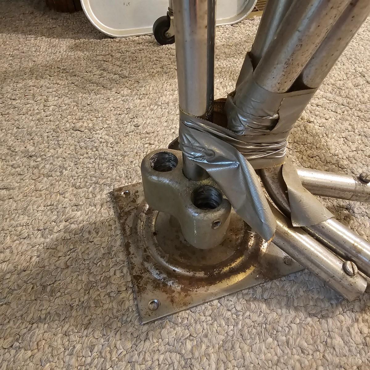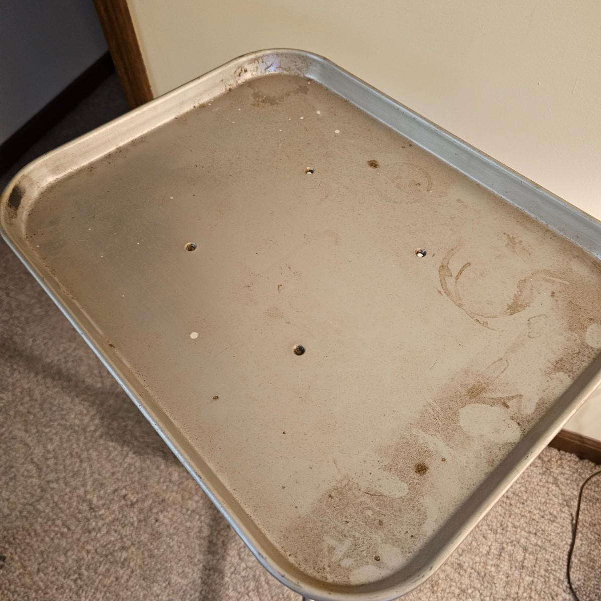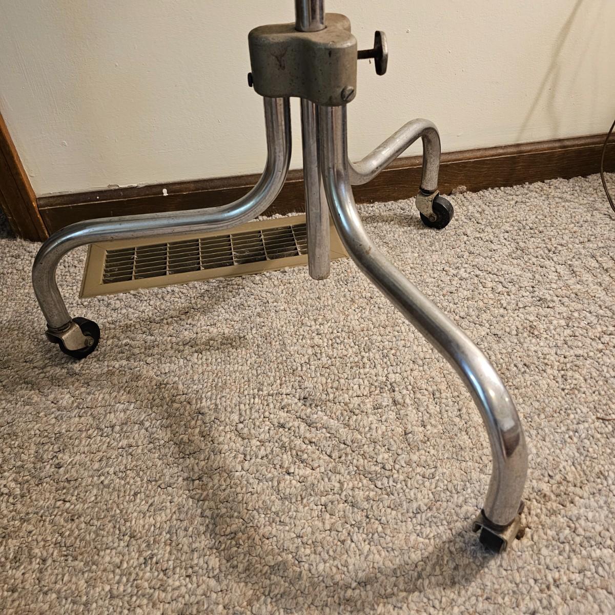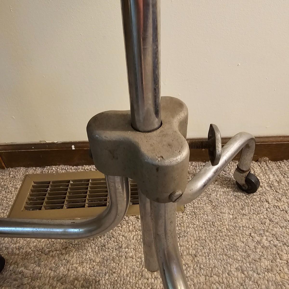 A pair of tripod leg rolling medical trays. Legs and upright stems are steel, trays are aluminum. Note that one unit is not assembled, we did not verify piece will be intact when assembled. Piece measures 21" x 18" x 34"H, has some height adjustment. Surface rust and grime on legs and stem. See photos for details. Local pickup only.