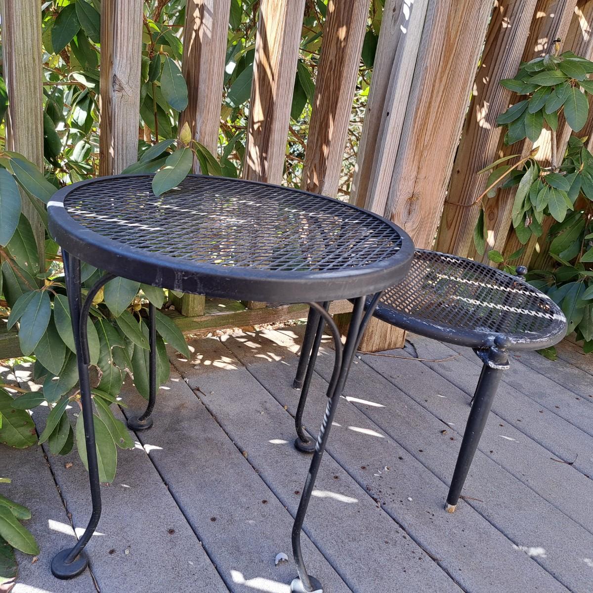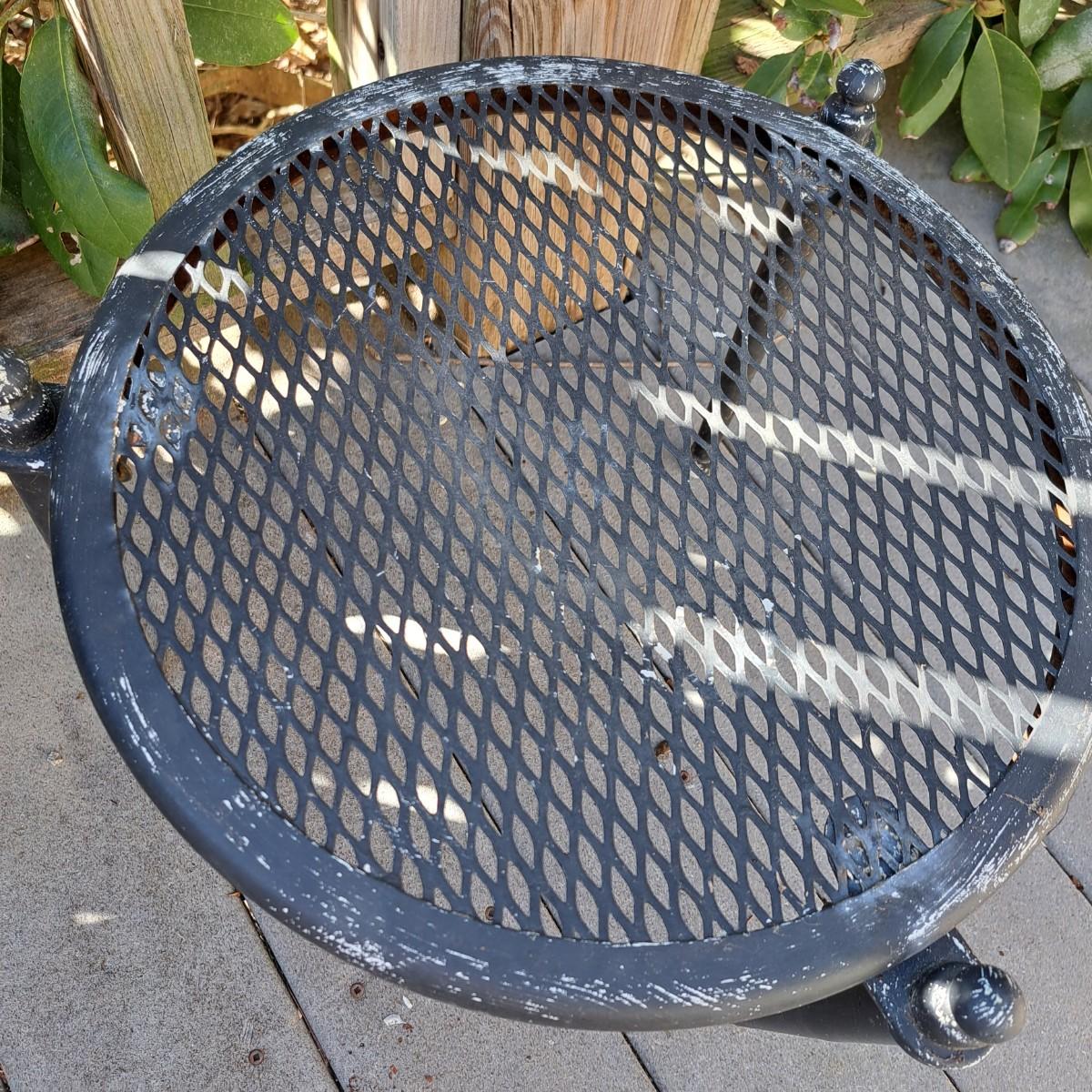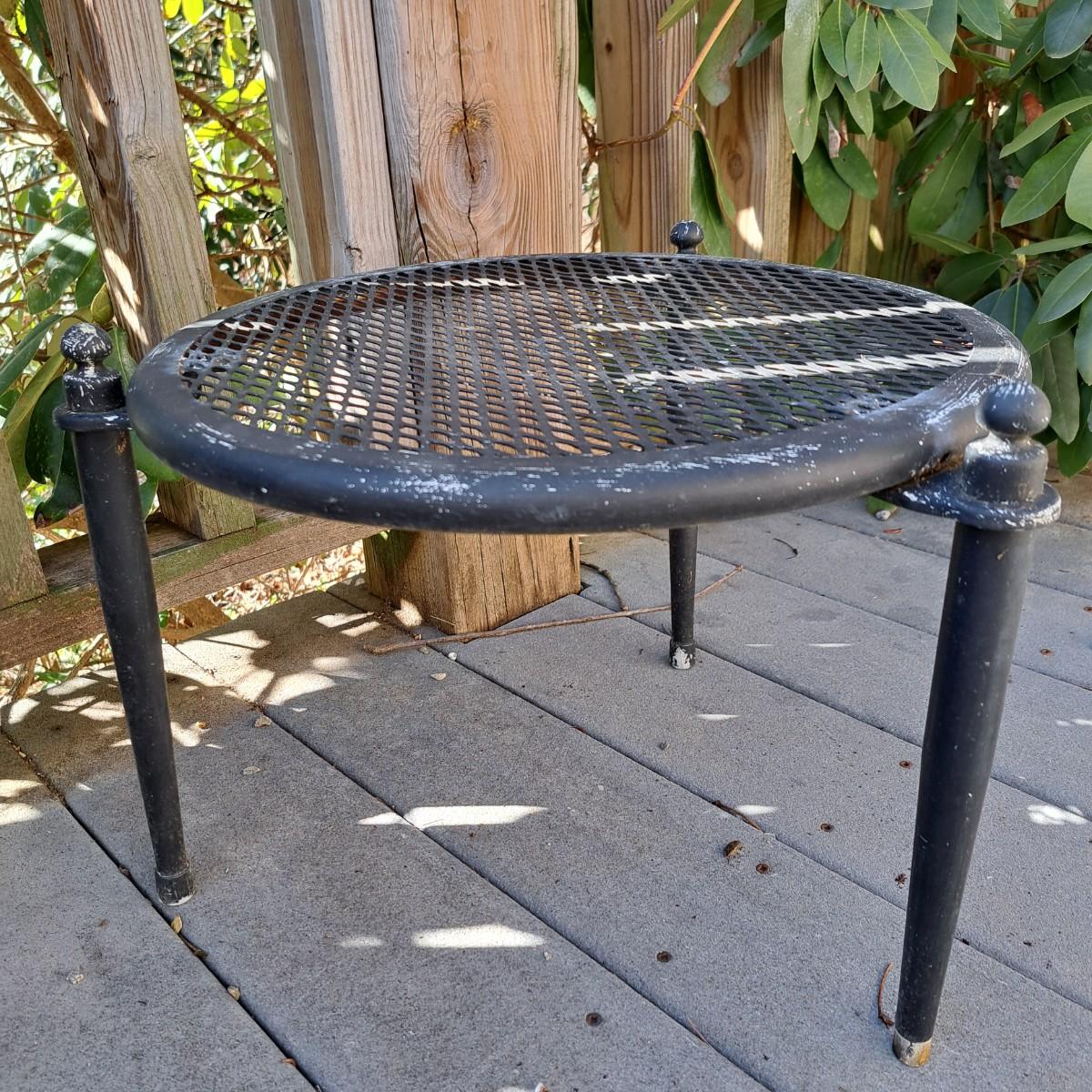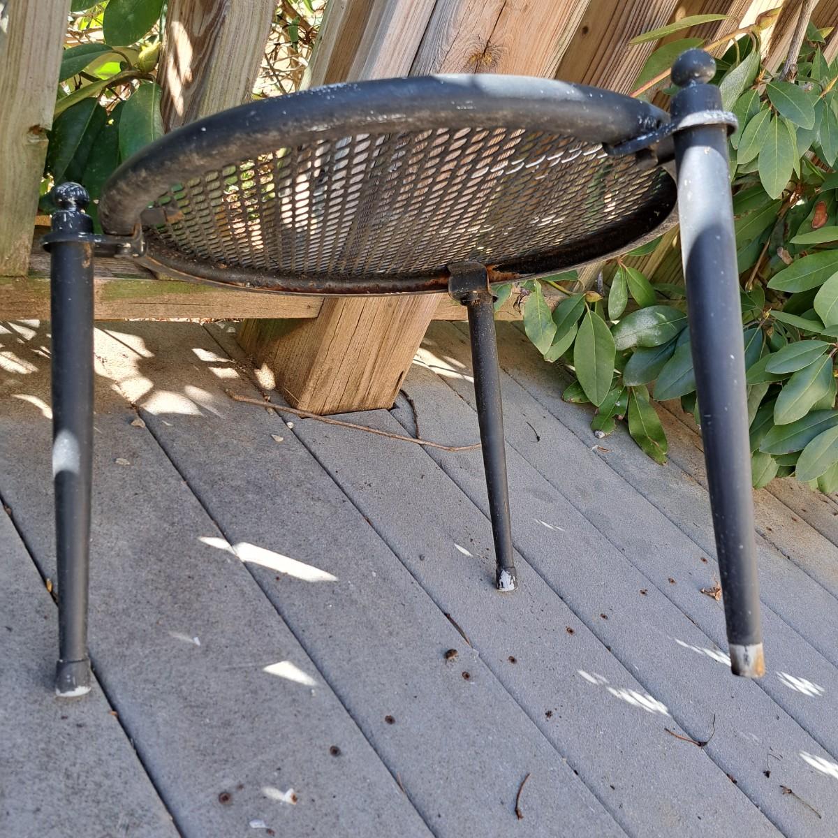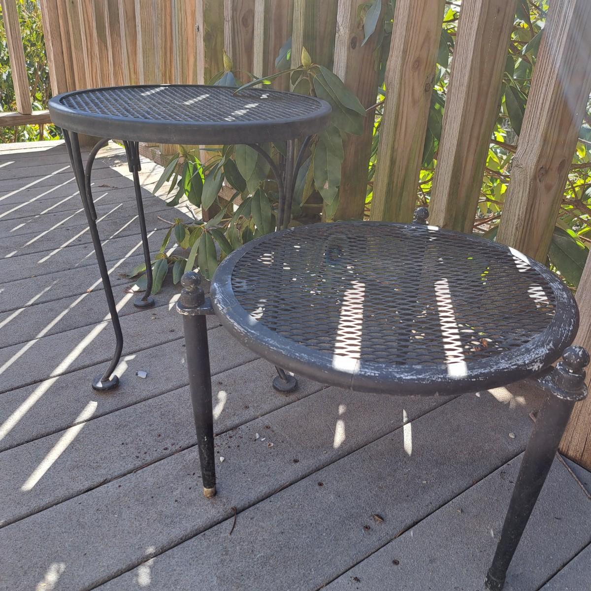 Two small round vintage metal mesh top tables painted black, the larger is 17"D x 17.5"H and has round pads at ends of each four legs. The smaller is 16"D x 12"H and somewhat distressed, has three peg legs and is missing one plastic tip on one leg as shown. Overall, both appear to be in good condition per their age. Local pickup only.